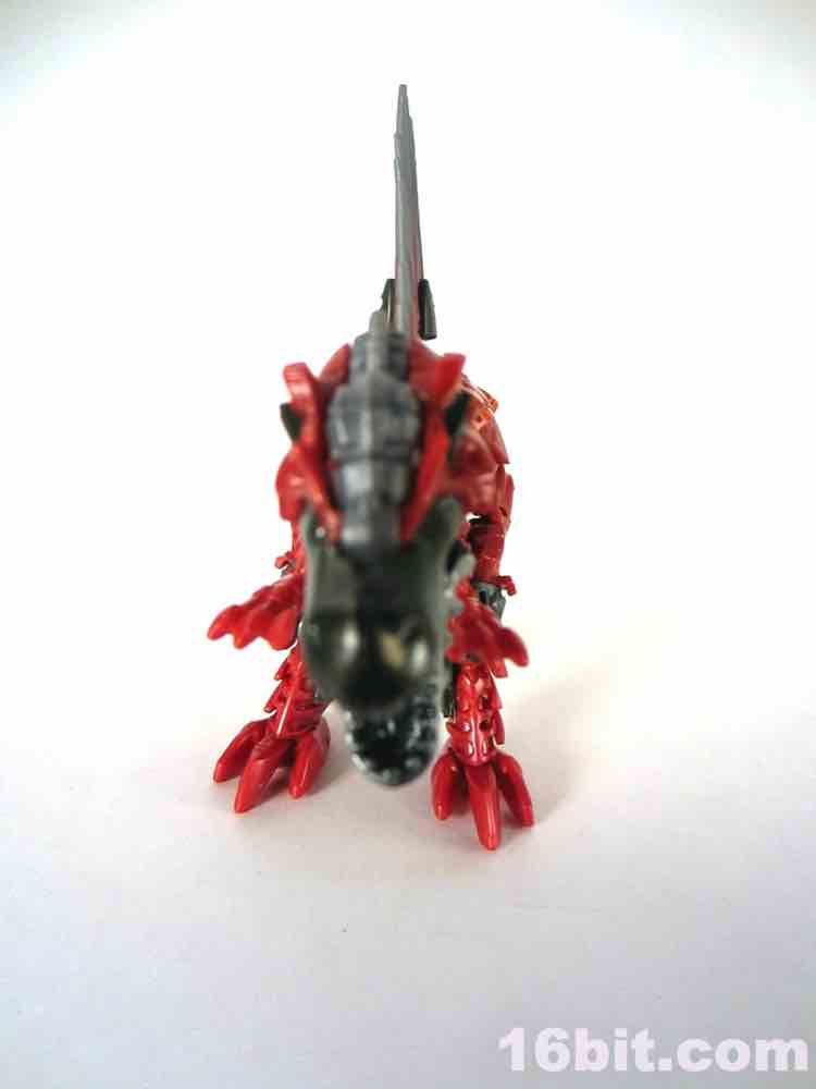 Packaged in dinosaur mode, this figure comes out incredibly easily - there's only one rubber band holding the sail in place, but you can just tear open the bubble and pop the figure out without having to cut any ties. Hasbro: thank you for this. The dinosaur is pretty good, with moving arms and legs plus the most articulated dinobot neck I think I've ever seen. The sword weapon stores in his tail, which seems to be somewhat awkward massaging in place. The robotic blue eyes pop out of the red and grey face nicely, and the robot dinosaur stands well. It's amazing they crammed it in the bubble. I am told that the red paint on the rubbery grey tail can flake off with too much flexing - as such, don't put it in a box or bag where it can rub up against something else. Be careful with it.