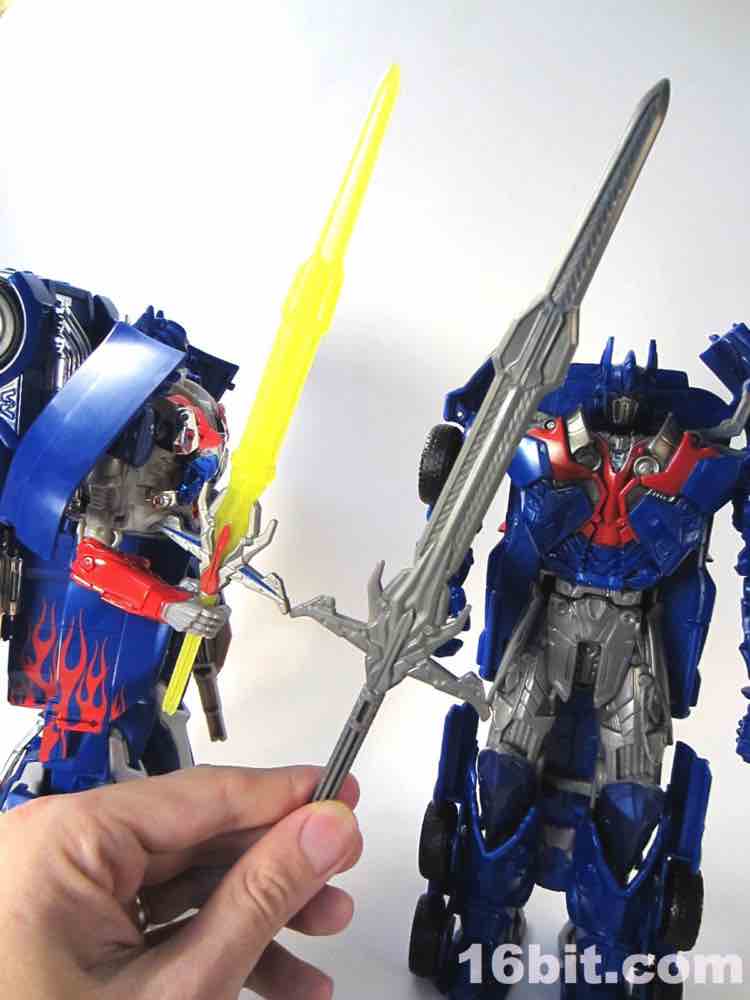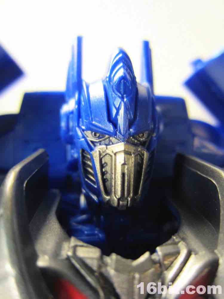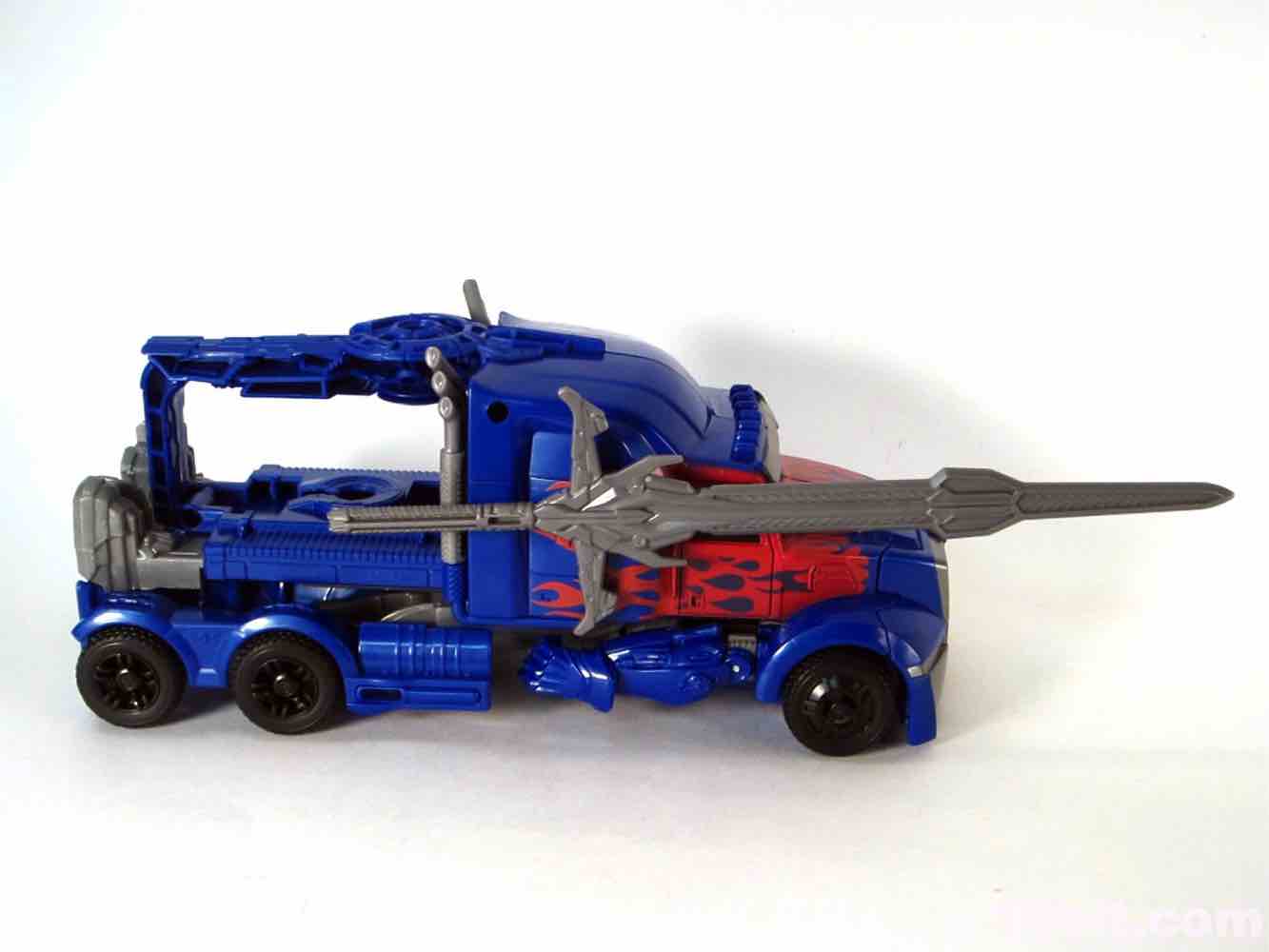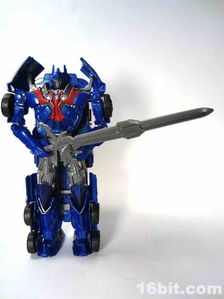 If Hasbro included jointed shoulders, a jointed neck, and eyes painted any color but silver I think this would be a suitable replacement for the Leader toy. It's a stiff guy, but I could see it quickly replacing some of the other price points because it actually is really fun. I doubt kids will clamor for the "baby" version, just remembering how my peers were during the first generation of these toys, but hey - what do I know? Maybe they'll be happy with whatever shows up. The engineering is good and it's fun to play with, but collectors seem to want only the best version available - which this probably isn't. His sword hilt is too big for 5mm hands, and the 5mm peg on the side plugs in the side of the truck mode - so it's like a jousting thing. There are other cosmetic holes on the toy which resemble a 5mm socket, but they're a little too big to actually fit this or other weapons. Otherwise? I dig it. It's a nice one.
