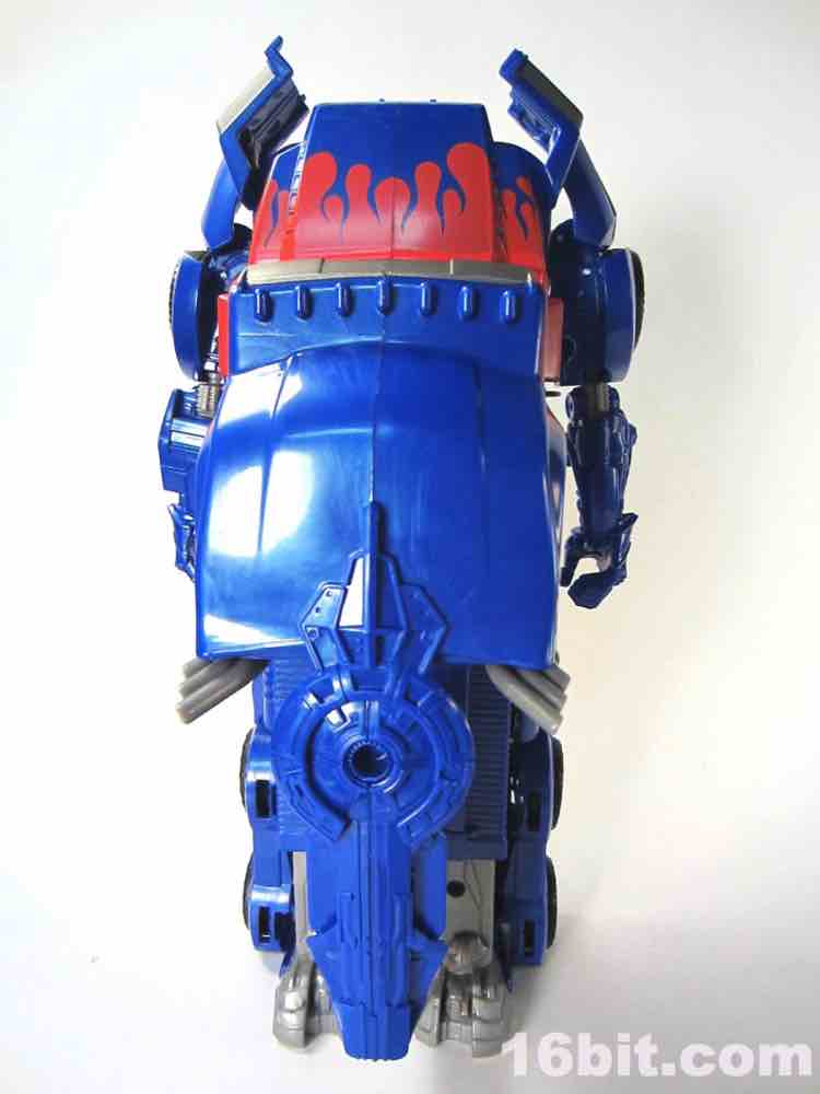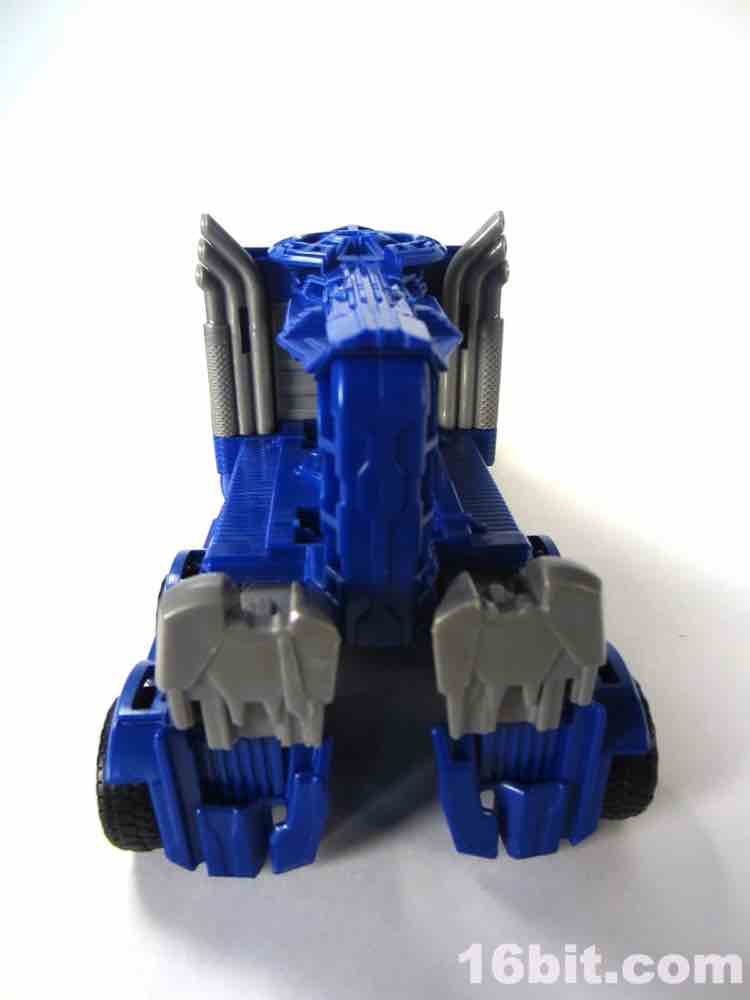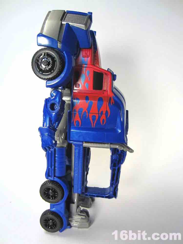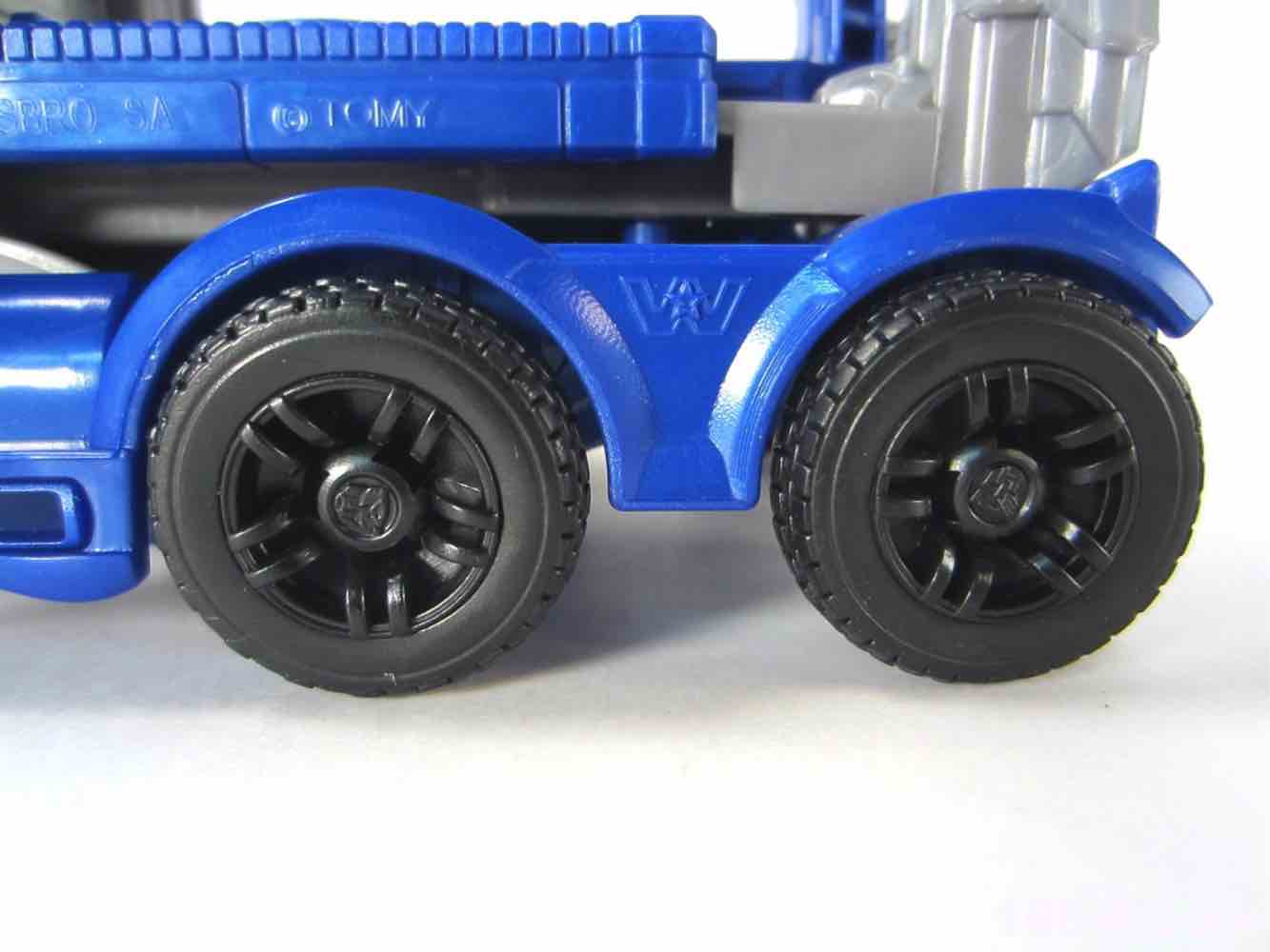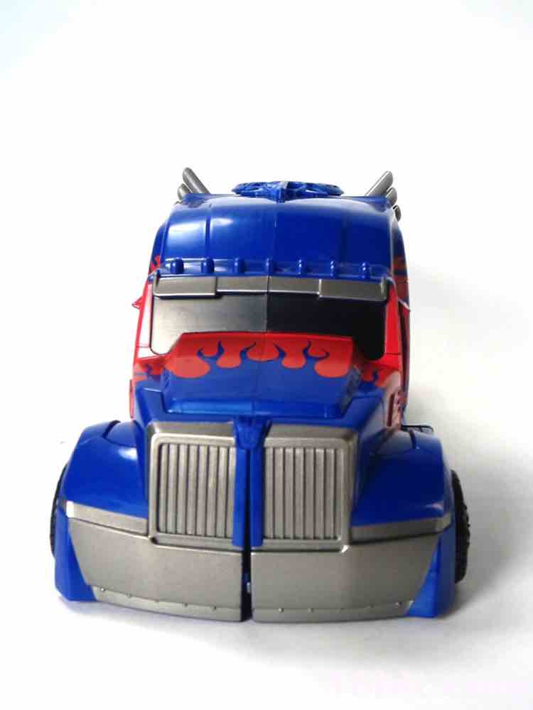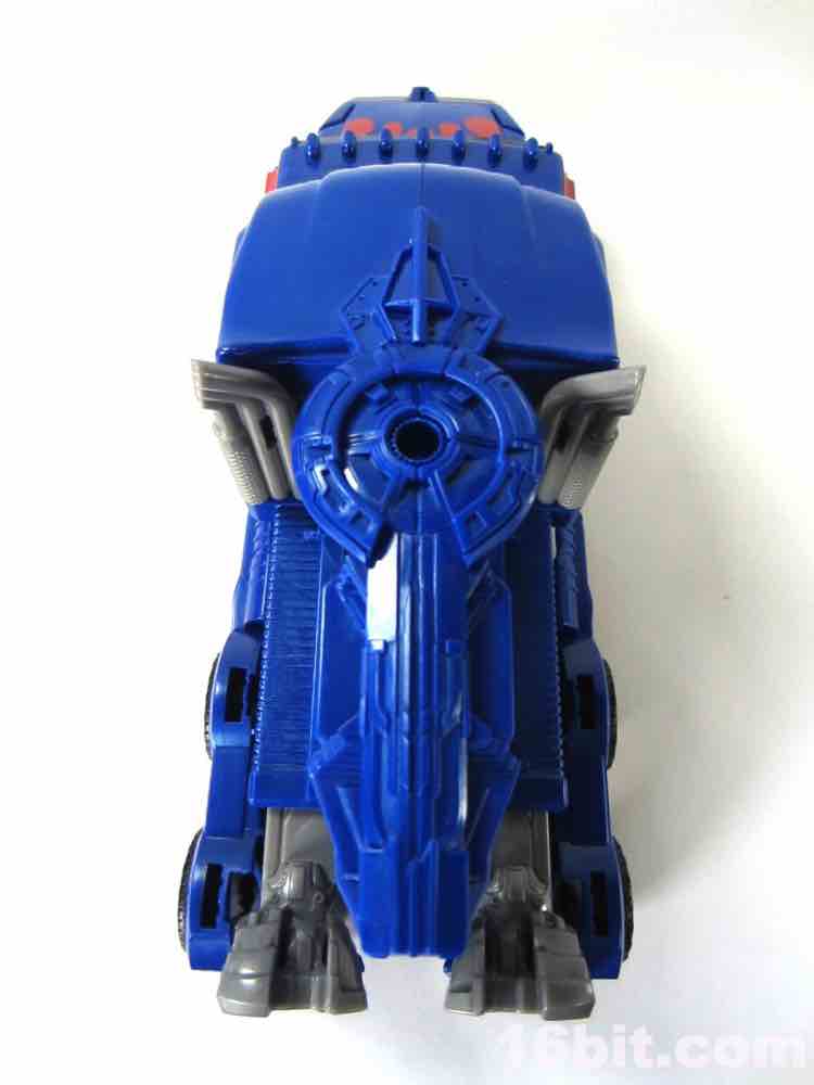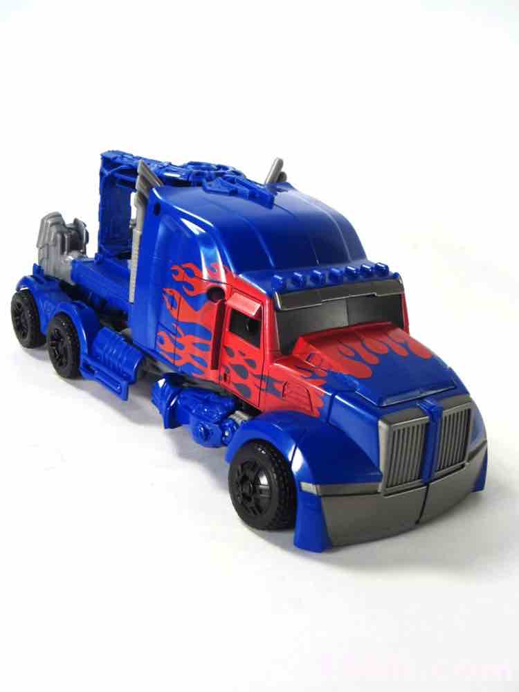 If you are unable to convert this toy, I question your dexterity and fine motor skills. The robot has a big handle on the back - grab it, put Optimus' arms down, and push down until it "clicks." The arms, shoulder armor, and head tuck in to the body and you've got a truck with nicely rolling wheels. They're not super spinny, but I've seen worse and for a toy it rolls on the floor about as nicely as I might hope. The red paint applied to the metallic blue plastic is bright and evenly applied, the flames actually looks better than the Leader class toy A tiny bit of silver and grey break up the sea of blue on truck mode but it's obvious that this is a cheaper toy for younger fans. I still think it's cool.