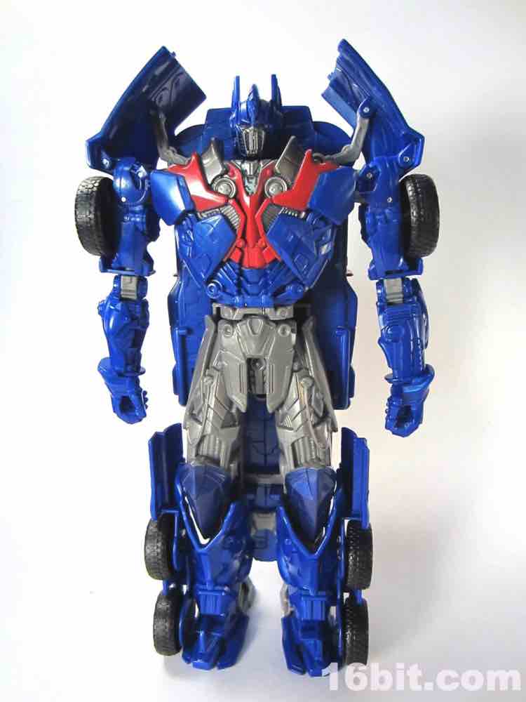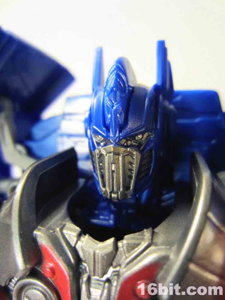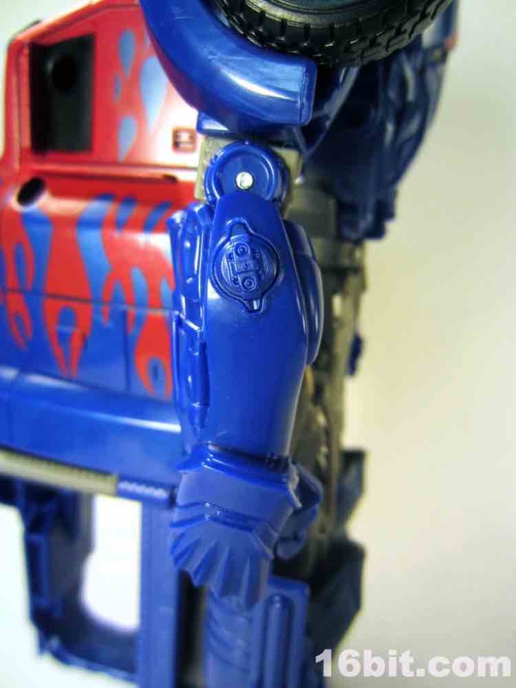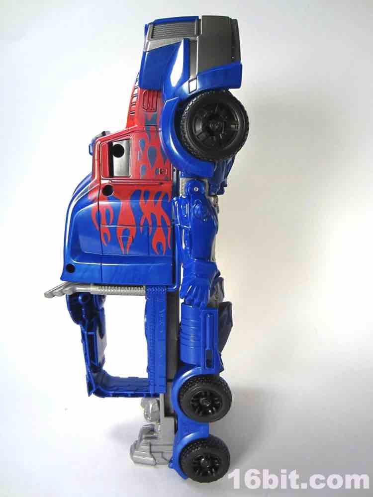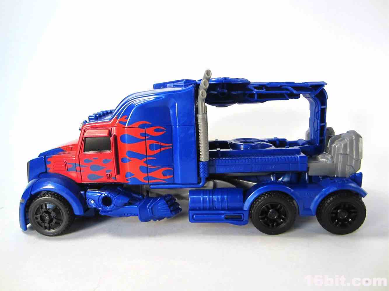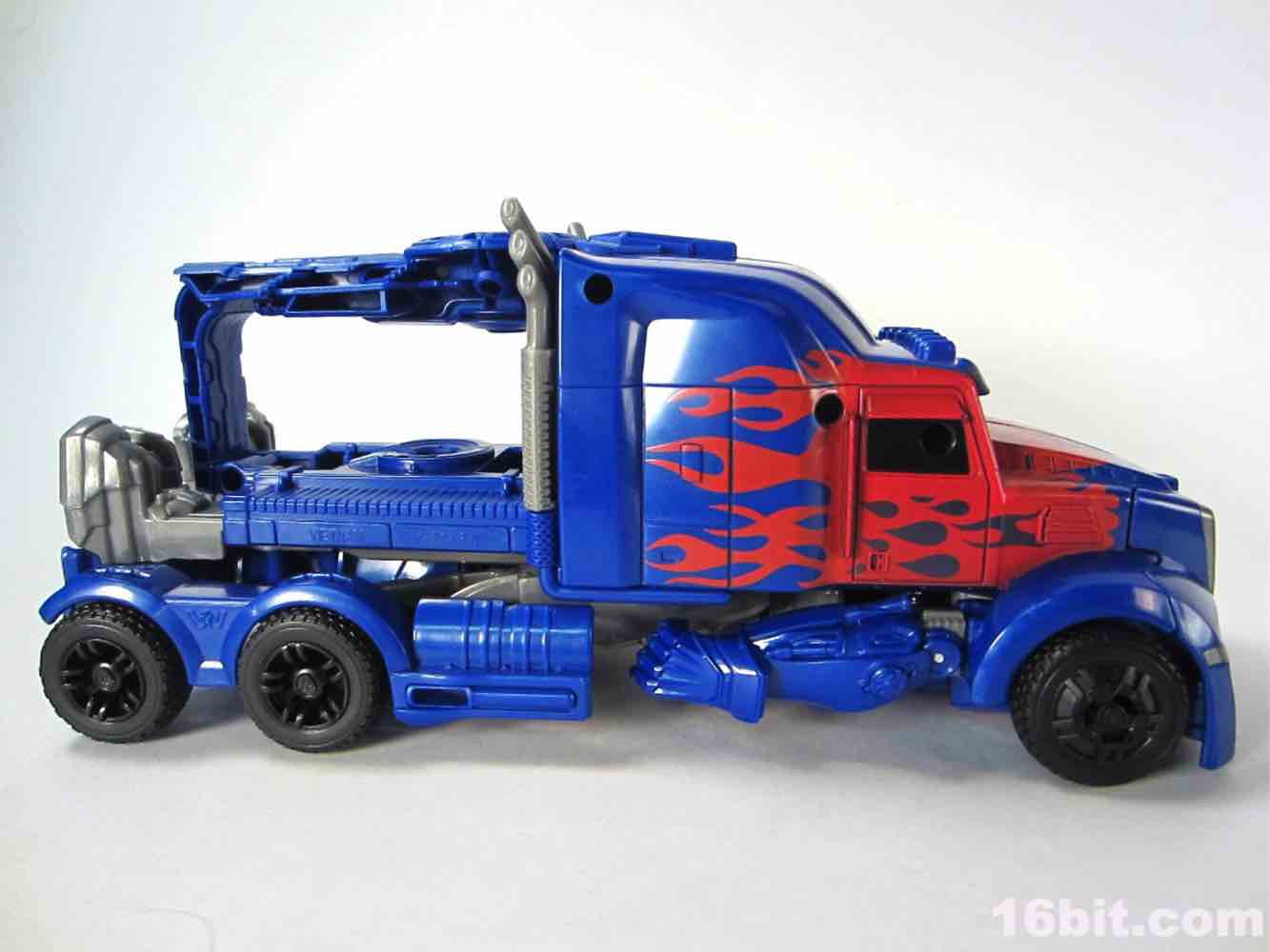 If you are unable to convert this toy, I question your dexterity and fine motor skills. The robot has a big handle on the back - grab it, put Optimus' arms down, and push down until it "clicks." The arms, shoulder armor, and head tuck in to the body and you've got a truck with nicely rolling wheels. They're not super spinny, but I've seen worse and for a toy it rolls on the floor about as nicely as I might hope. The red paint applied to the metallic blue plastic is bright and evenly applied, the flames actually looks better than the Leader class toy A tiny bit of silver and grey break up the sea of blue on truck mode but it's obvious that this is a cheaper toy for younger fans. I still think it's cool.