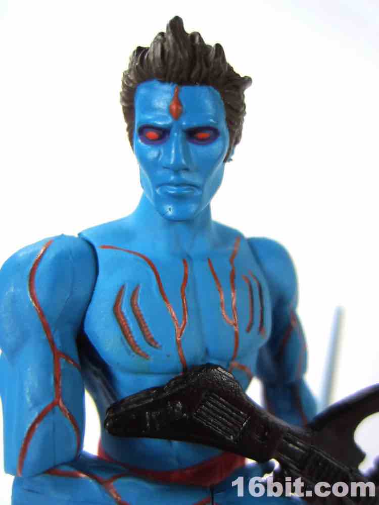 I absolutely love how the head turned out - red eyes, spiky hair, and dark blue eye shading make this a figure that while heroic could just as easily be a baddie. The head is a delight to photograph - seeing it up close showed me a bunch of great detail work - and the body's range of motion is as good as always. He stands, he sits, and there are 14 joints in all - that would probably make him the least-articulated Power Lords toy in this new line, and he's still pretty spectacular.