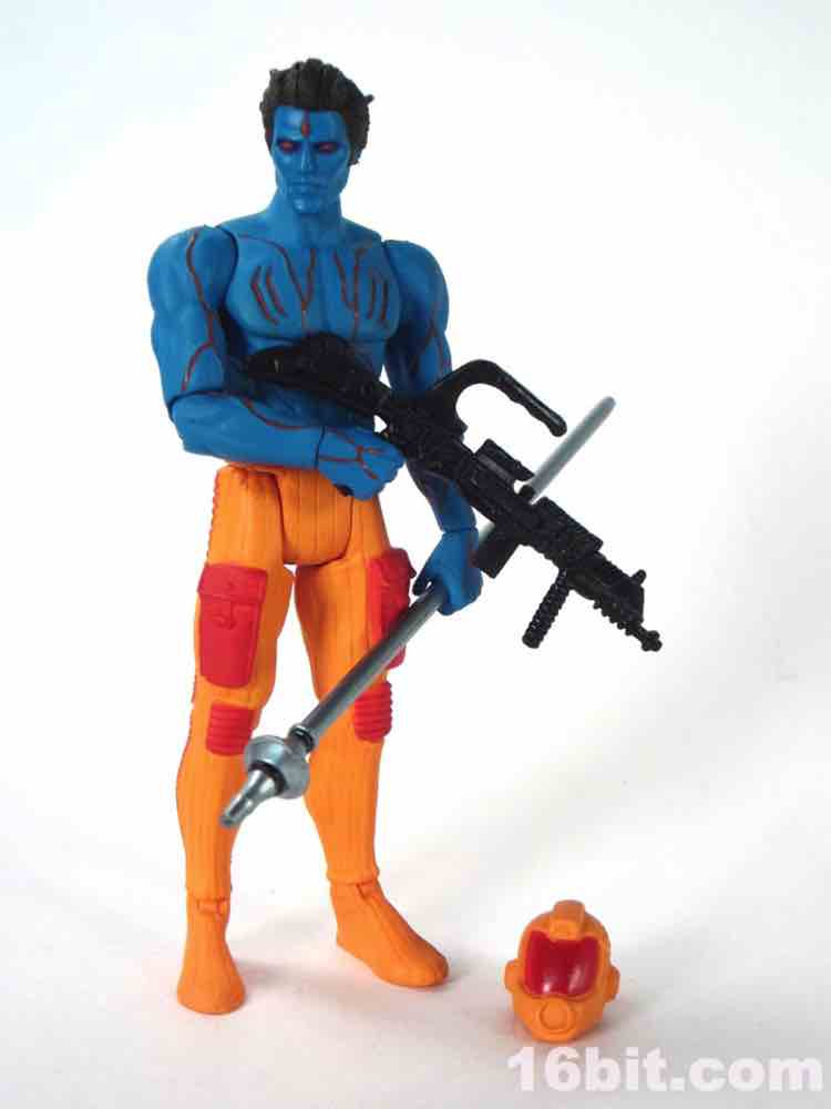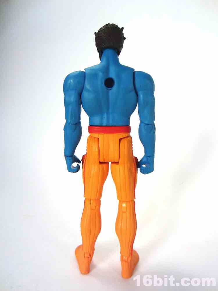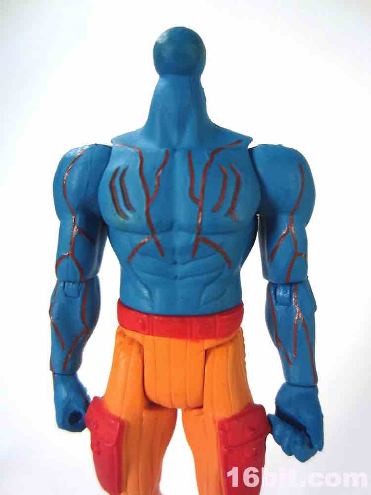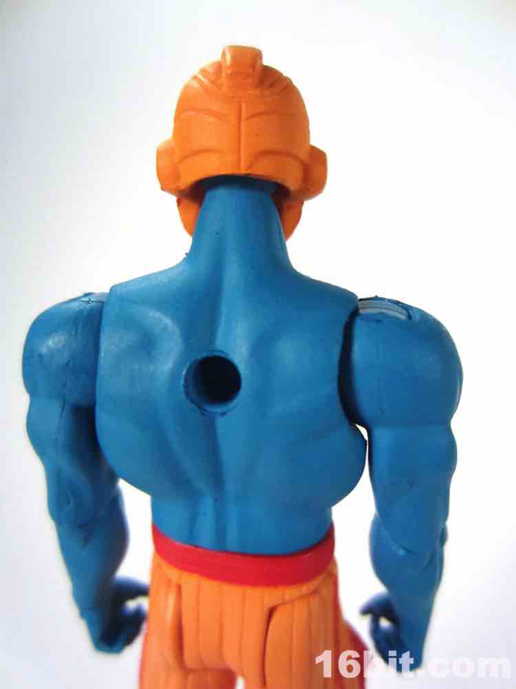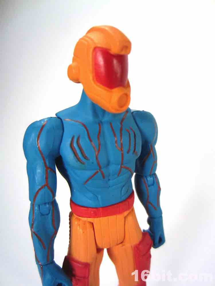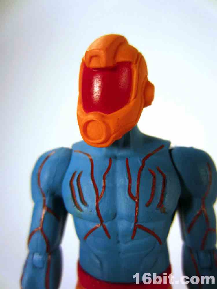 At a hair under 4-inches tall, this figure is similar in size to most current Star Wars and G.I. Joe figures. The articulation has Glyos pegs throughout, with one notable exception. The head just pops on a neck peg, and the neck does not connect via Glyos plug to the torso. As such, you can only swap heads with Lord Power, Power Soldiers, and perhaps a few coincidentally same-size-peg Star Wars figures. The figure appears to be molded in color and painted over in the same color, just like early Outer Space Men. The effect gives the figure more visual weight, with a matte finish that looks like a toy without looking like a cheap toy. It's $15, so this is good. The bright orange pants have a red belt and pockets, while the blue torso has veiny, glossy red elements.