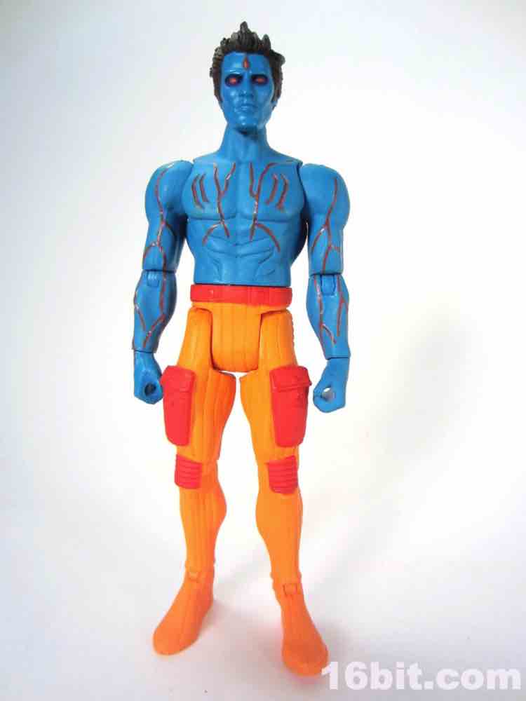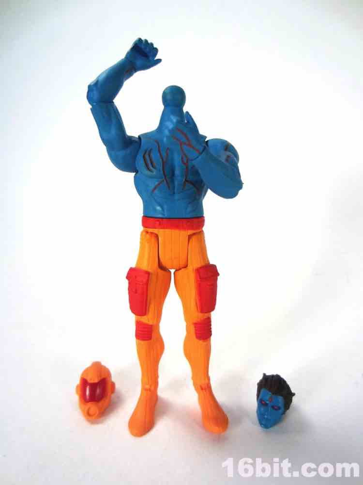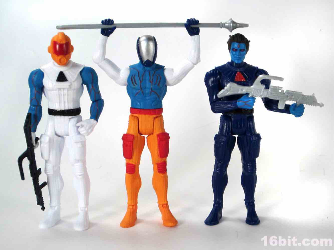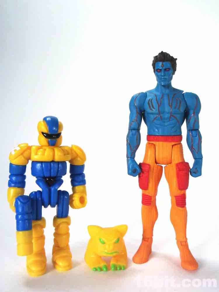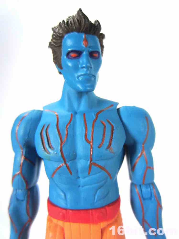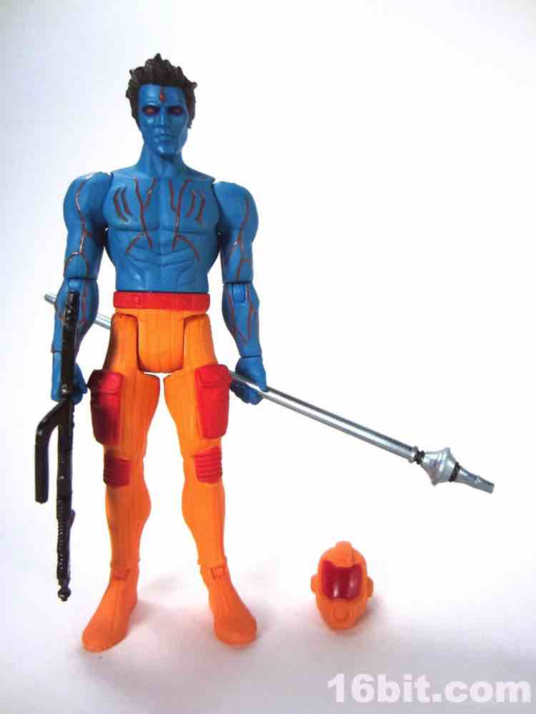 At a hair under 4-inches tall, this figure is similar in size to most current Star Wars and G.I. Joe figures. The articulation has Glyos pegs throughout, with one notable exception. The head just pops on a neck peg, and the neck does not connect via Glyos plug to the torso. As such, you can only swap heads with Lord Power, Power Soldiers, and perhaps a few coincidentally same-size-peg Star Wars figures. The figure appears to be molded in color and painted over in the same color, just like early Outer Space Men. The effect gives the figure more visual weight, with a matte finish that looks like a toy without looking like a cheap toy. It's $15, so this is good. The bright orange pants have a red belt and pockets, while the blue torso has veiny, glossy red elements.
