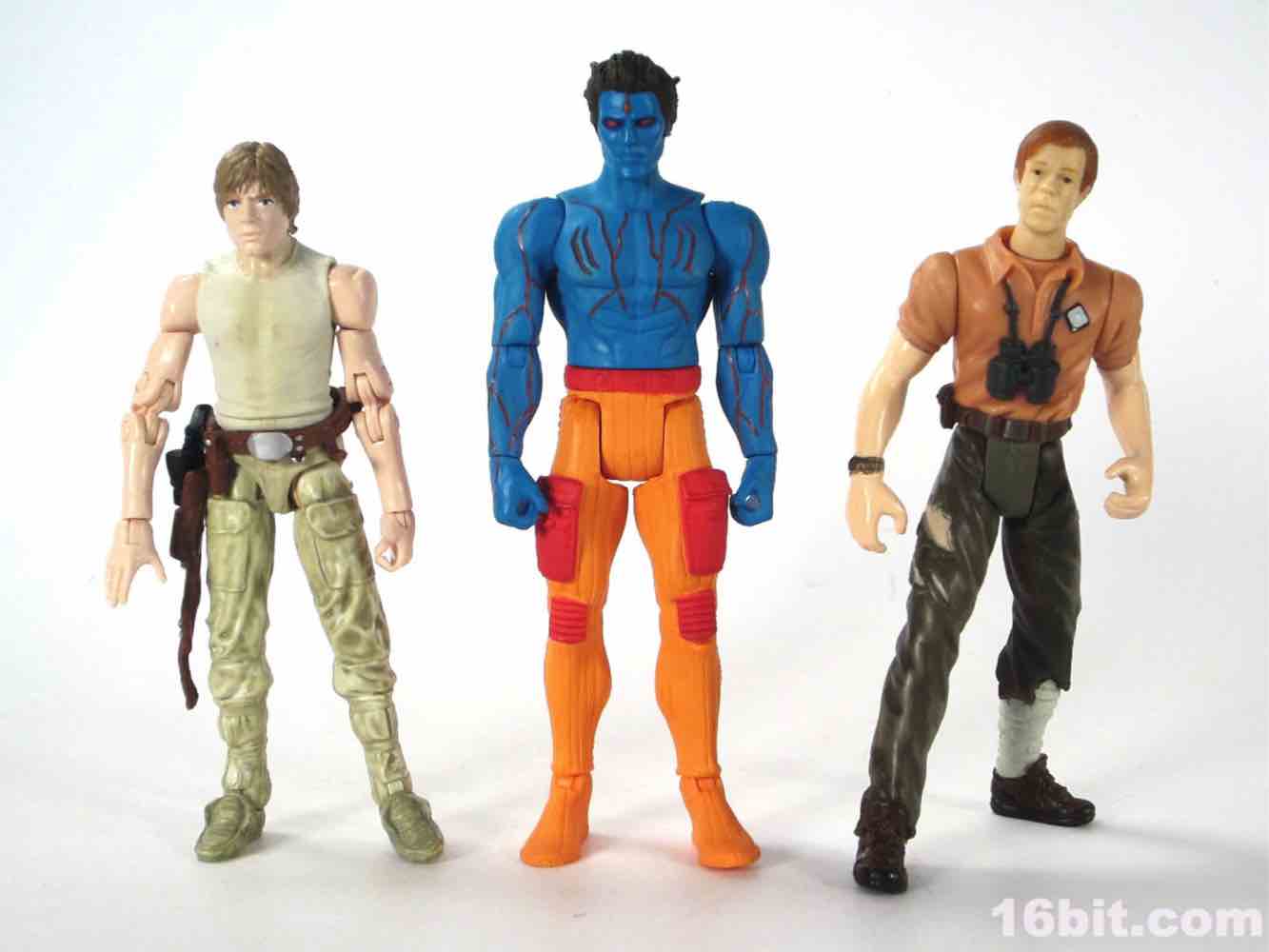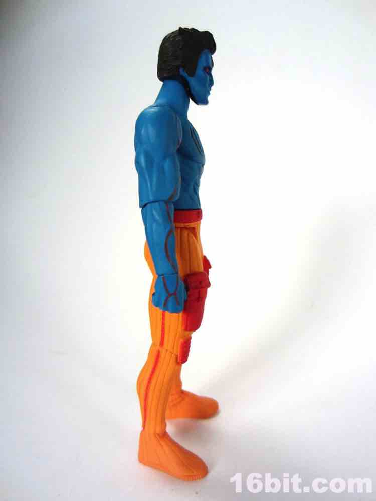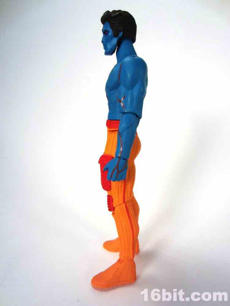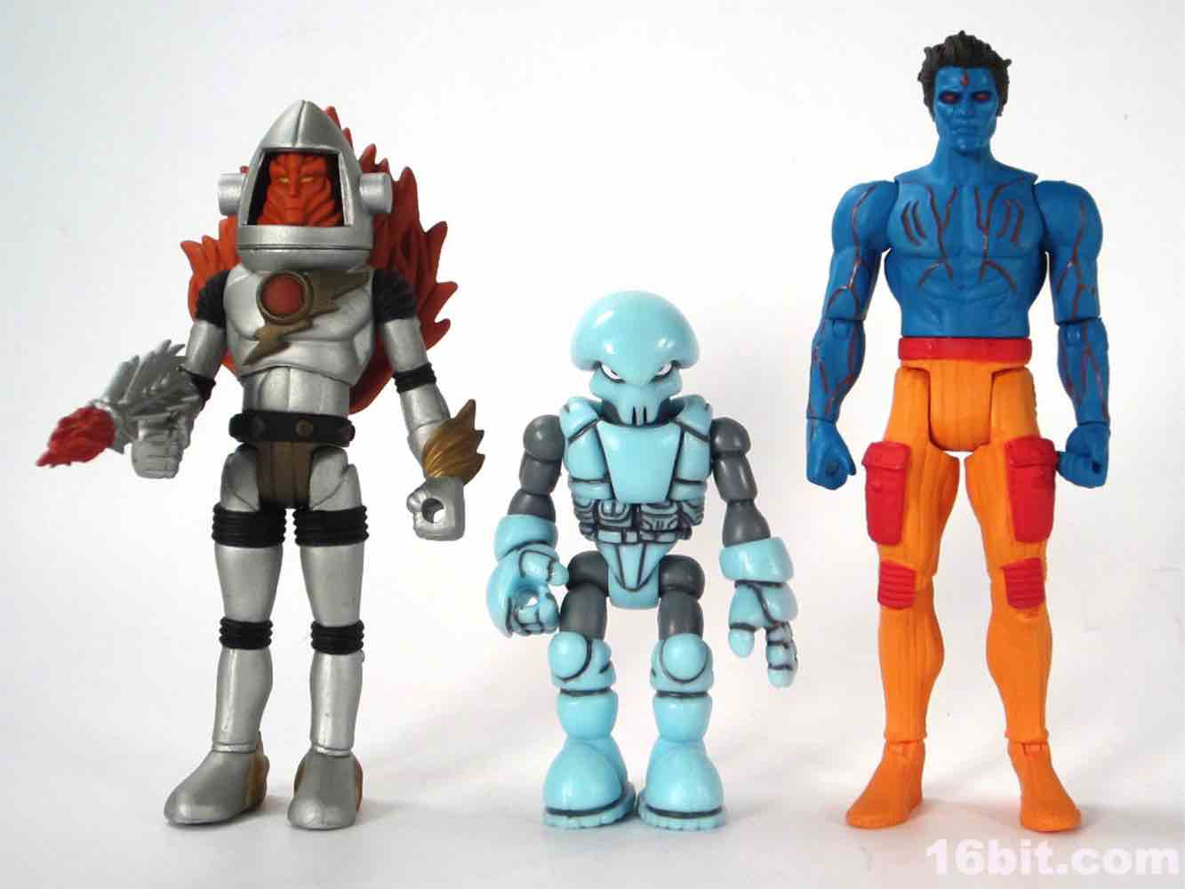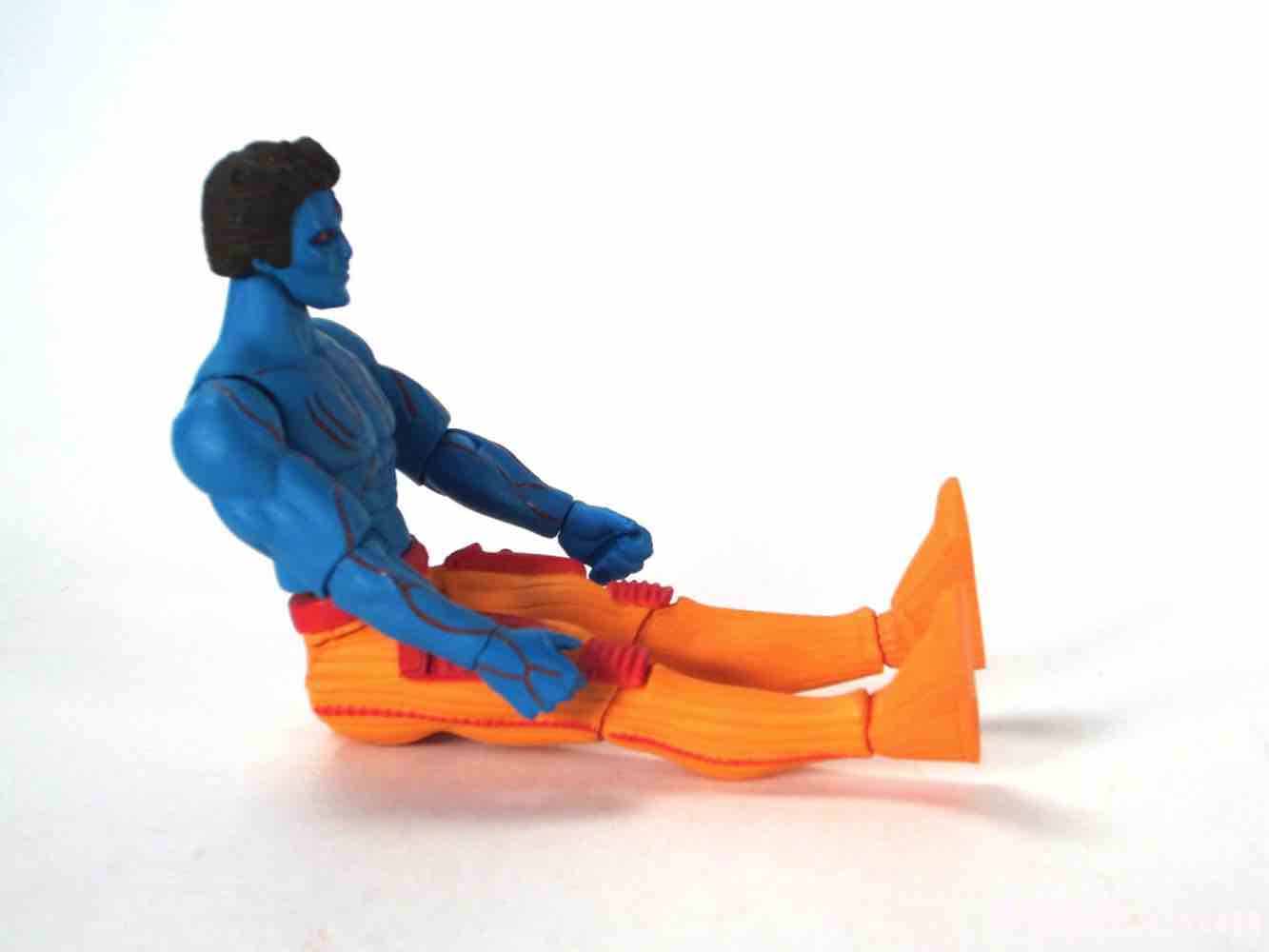 At a hair under 4-inches tall, this figure is similar in size to most current Star Wars and G.I. Joe figures. The articulation has Glyos pegs throughout, with one notable exception. The head just pops on a neck peg, and the neck does not connect via Glyos plug to the torso. As such, you can only swap heads with Lord Power, Power Soldiers, and perhaps a few coincidentally same-size-peg Star Wars figures. The figure appears to be molded in color and painted over in the same color, just like early Outer Space Men. The effect gives the figure more visual weight, with a matte finish that looks like a toy without looking like a cheap toy. It's $15, so this is good. The bright orange pants have a red belt and pockets, while the blue torso has veiny, glossy red elements.