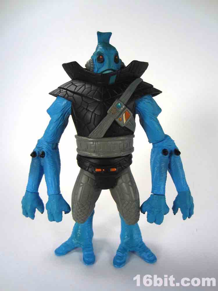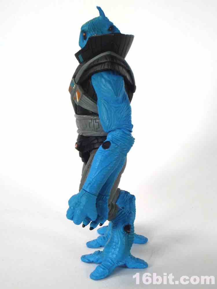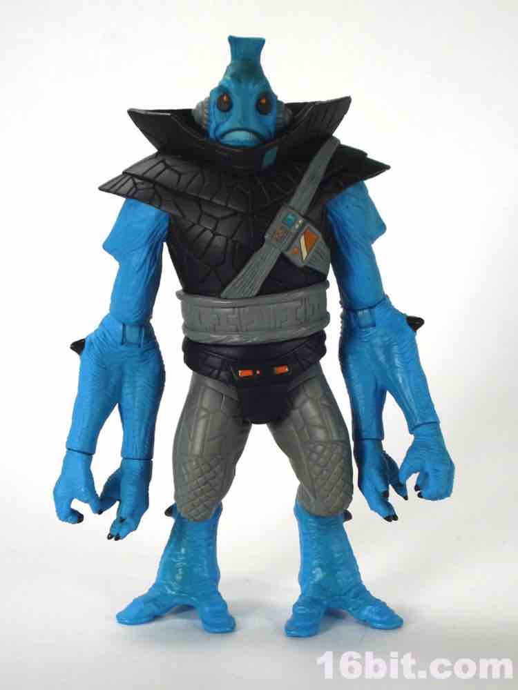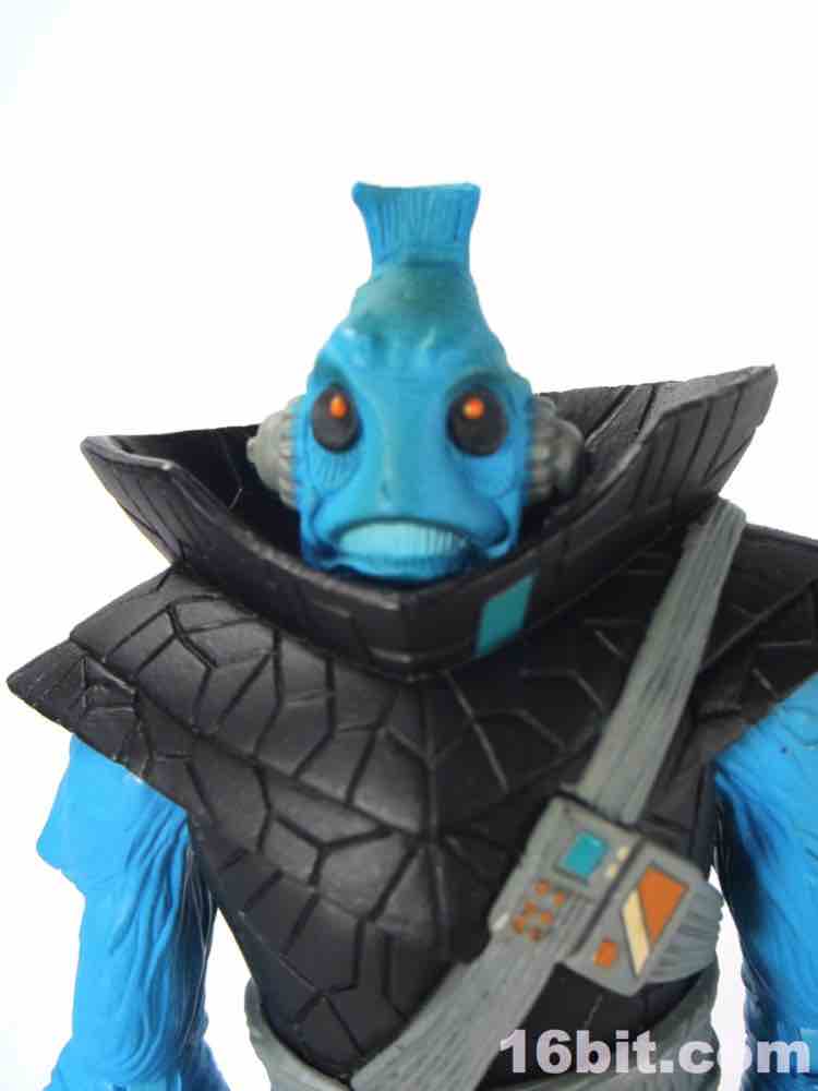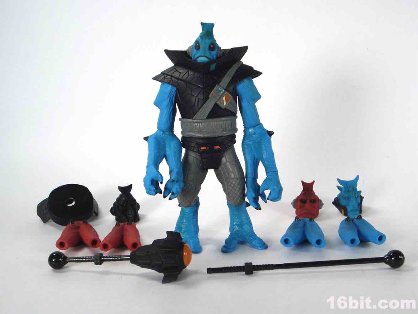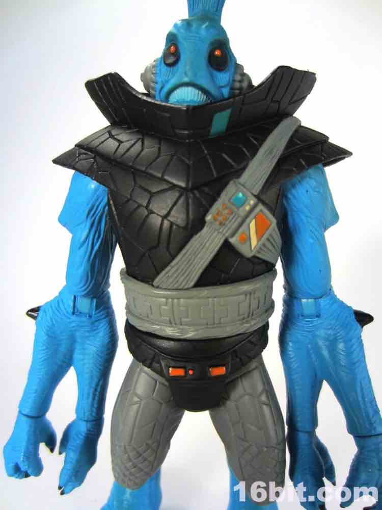 It's worth noting that courtesy of the many parts this figure has, he's got 15 points of articulation and each joint can be separated from the figure at the Glyos peg. You can swap the hands or heads or whatever between figures, making whatever color mutations you want. Granted, I don't want to - I like the default mode just fine, but swapping the heads is fun since we have 3 options. Deco is nice, with every body part being slathered in paint which gives it a rich look. Considering the price of this figure - it may be the most expensive individual new 3 3/4-inch action figure outside (and possibly including) Fun Publications' various G.I. Joe exclusives - this level of deco is appreciated. The default head's two faces are spectacular with blue skin, red eyes, and black circles around them making the red "pop." Grey earphones bring a little more personality to the head, while the secondary "fish" head has a strange baleen-esque whale grille that's not unlike that of the Alpha Star alien creature. The vaguely fishy mouth has light blue deco on his teeth, which may well make this the single best-painted head you can buy.