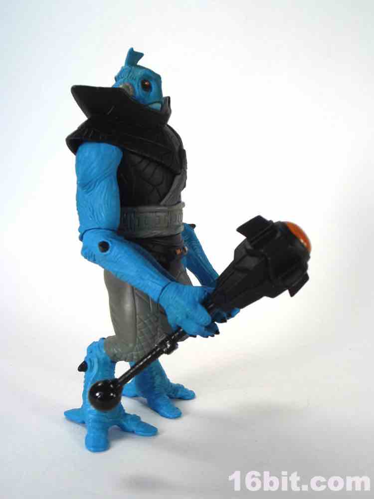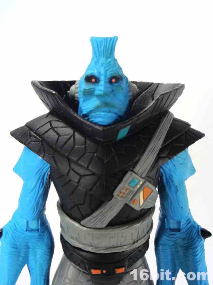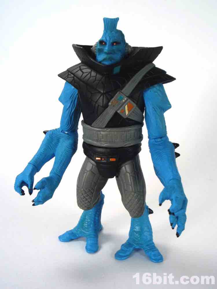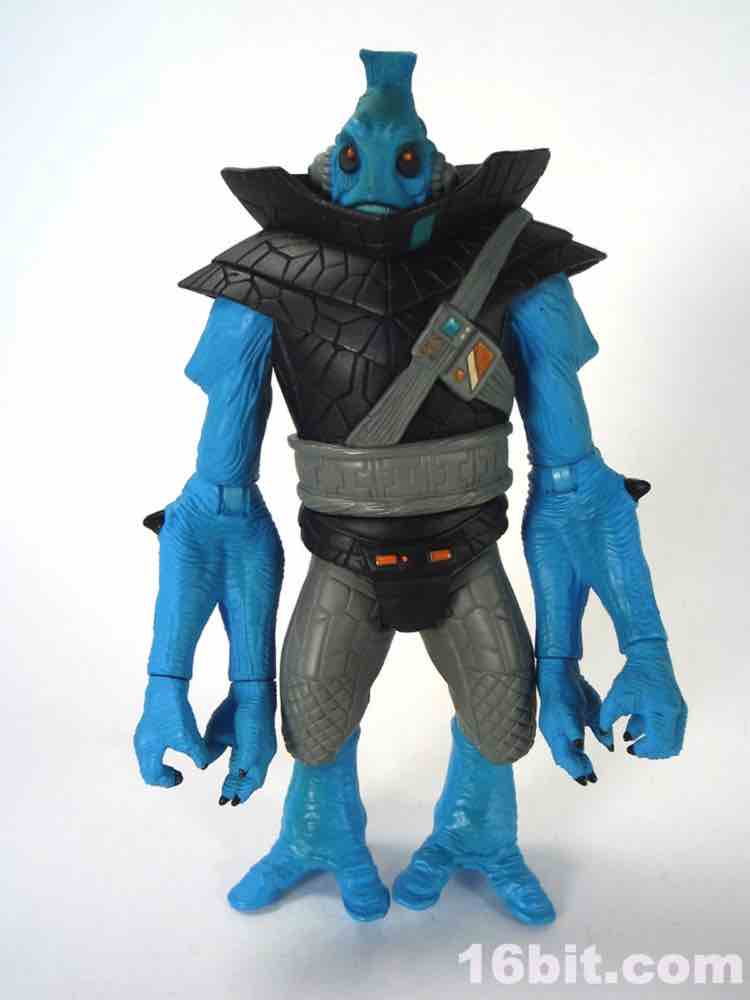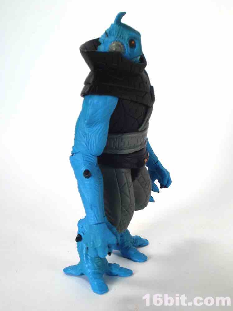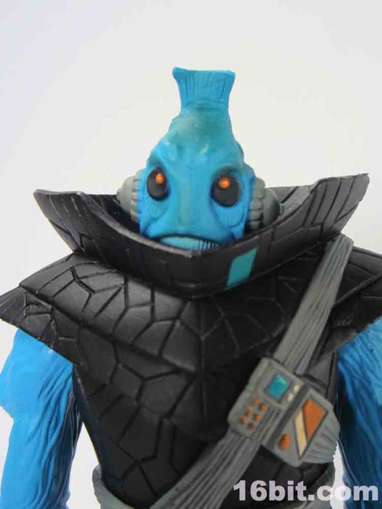It's worth noting that courtesy of the many parts this figure has, he's got 15 points of articulation and each joint can be separated from the figure at the Glyos peg. You can swap the hands or heads or whatever between figures, making whatever color mutations you want. Granted, I don't want to - I like the default mode just fine, but swapping the heads is fun since we have 3 options. Deco is nice, with every body part being slathered in paint which gives it a rich look. Considering the price of this figure - it may be the most expensive individual new 3 3/4-inch action figure outside (and possibly including) Fun Publications' various G.I. Joe exclusives - this level of deco is appreciated. The default head's two faces are spectacular with blue skin, red eyes, and black circles around them making the red "pop." Grey earphones bring a little more personality to the head, while the secondary "fish" head has a strange baleen-esque whale grille that's not unlike that of the Alpha Star alien creature. The vaguely fishy mouth has light blue deco on his teeth, which may well make this the single best-painted head you can buy.