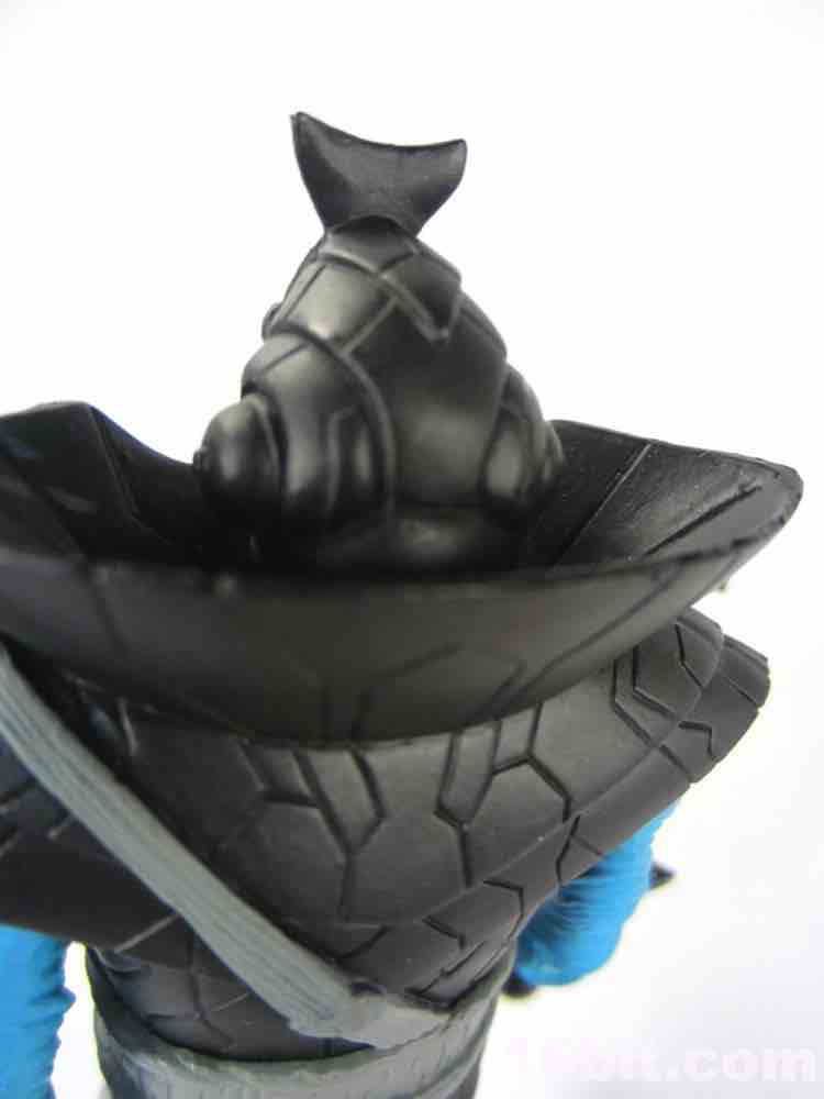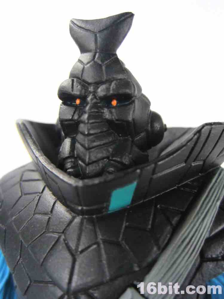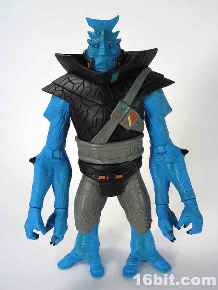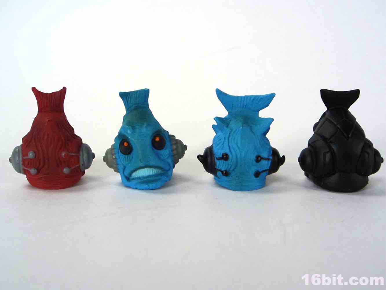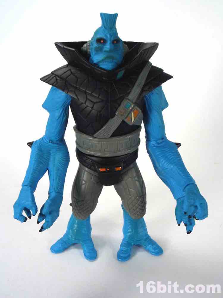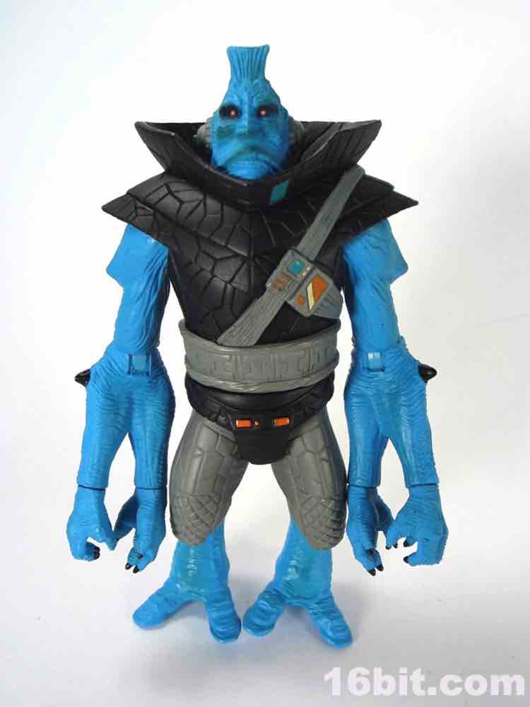 It's worth noting that courtesy of the many parts this figure has, he's got 15 points of articulation and each joint can be separated from the figure at the Glyos peg. You can swap the hands or heads or whatever between figures, making whatever color mutations you want. Granted, I don't want to - I like the default mode just fine, but swapping the heads is fun since we have 3 options. Deco is nice, with every body part being slathered in paint which gives it a rich look. Considering the price of this figure - it may be the most expensive individual new 3 3/4-inch action figure outside (and possibly including) Fun Publications' various G.I. Joe exclusives - this level of deco is appreciated. The default head's two faces are spectacular with blue skin, red eyes, and black circles around them making the red "pop." Grey earphones bring a little more personality to the head, while the secondary "fish" head has a strange baleen-esque whale grille that's not unlike that of the Alpha Star alien creature. The vaguely fishy mouth has light blue deco on his teeth, which may well make this the single best-painted head you can buy.