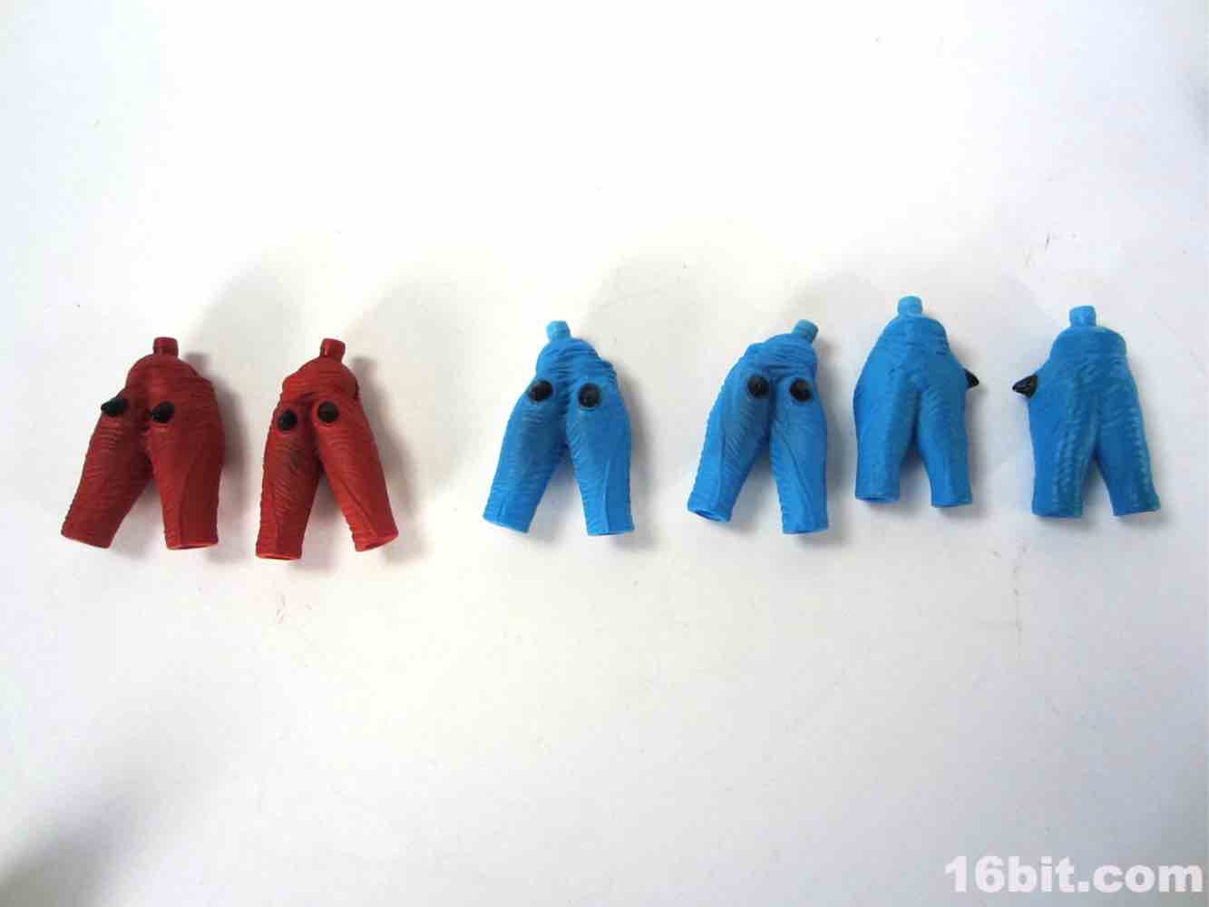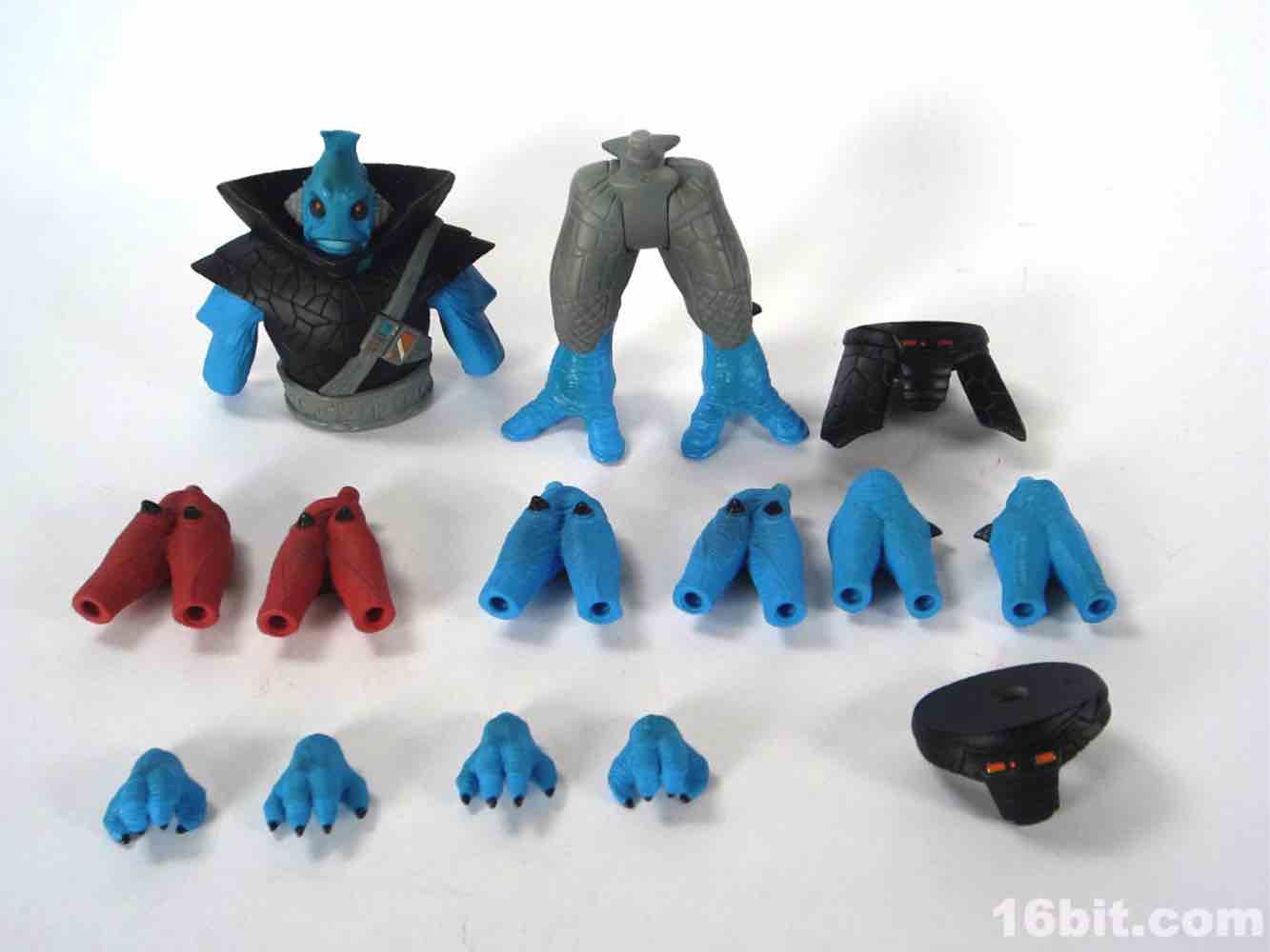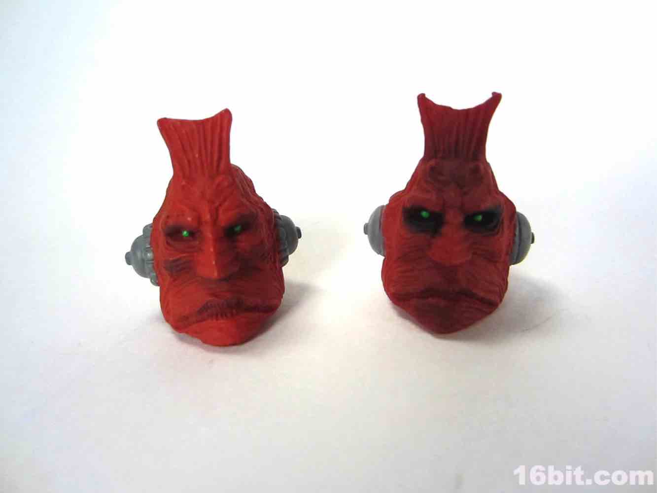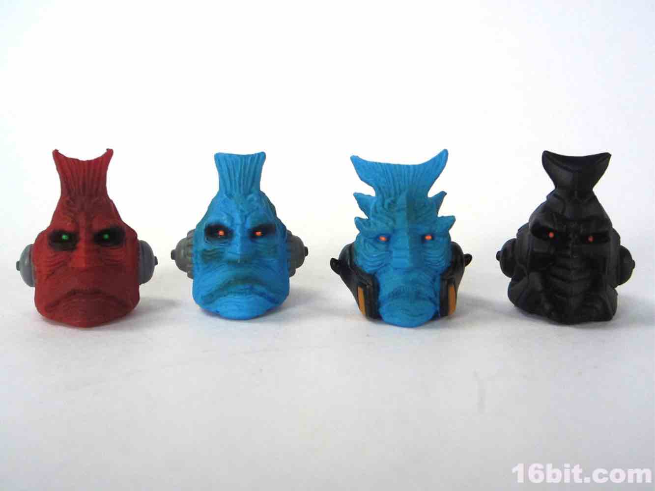 The secondary heads are as follows: #1, a red Ggripptogg head with only 1 head - you can use this with the regular Ggripptogg, if you prefer. The other 3 are all made for the blue Trooper, which, again, would be great if I could troop-build him. There's a black helmeted head with red eyes, molded in blue plastic with a nice coat of black paint. The third and final head is a blue Ggrabbtargg head, with a metallic collar, orange eyes, and no eye shading to speak of. (The same is true of the club-only orange Ggrabbtargg, too.)