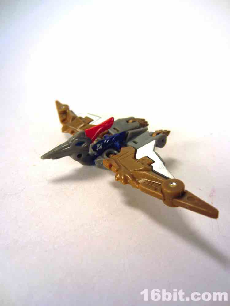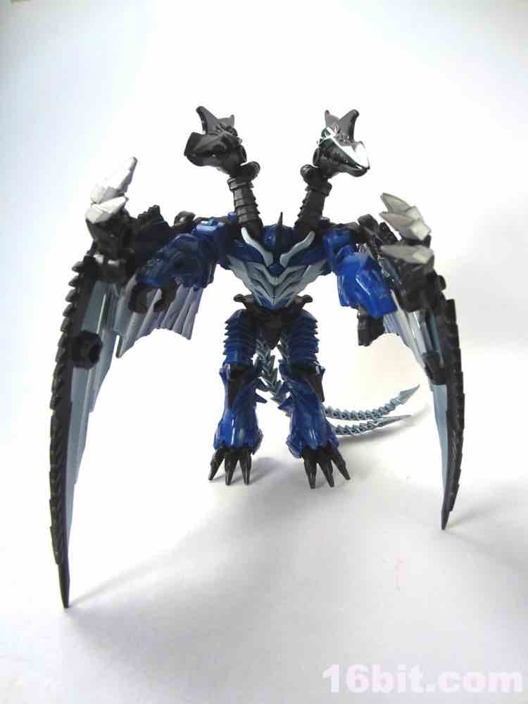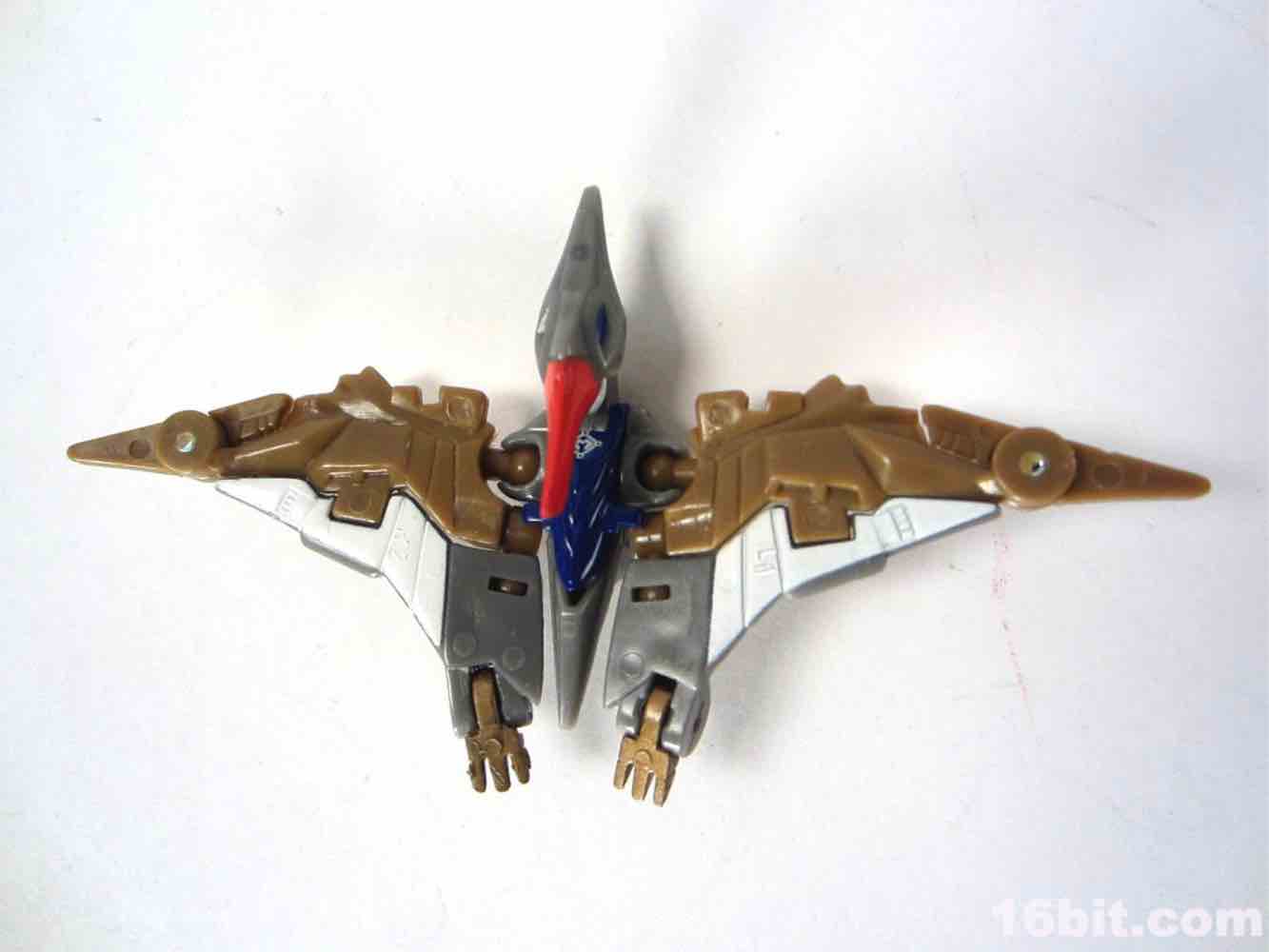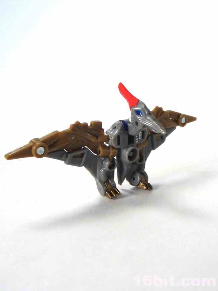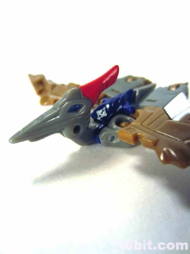 The robot and the dinosaur are fundamentally the same, minus where the 3 heads go and how the feet are. Plug the arms into the wings, it's a "dinosaur." The twin heads of the beast look really cool, and each has several points of articulation plus an opening jaw. The positioning of the heads remind me of numerous Beast Wars toys, in that there's no real "correct" position for a piece to fit in - it has a huge range of movement, and goes there because the instructions say that's where to put them. Stock photography shows the heads in numerous positions, but it seems "like a vest" is the intended position. This figure will probably be remembered for its cool wrists, which can swivel up and down, and cursed for his awkward elbows, which don't quite bend like you would want. Getting a cool action pose out of this guy is difficult, but at least it looks acceptable standing around. The big wings are somewhat bulky, but they can swing around behind the figure or flare out like a gargoyle of two-headed death - you've got options. The toy itself has no real action feature to speak of, but opening beast jaws and decent articulation on the necks puts this one... head and shoulders above the rest.