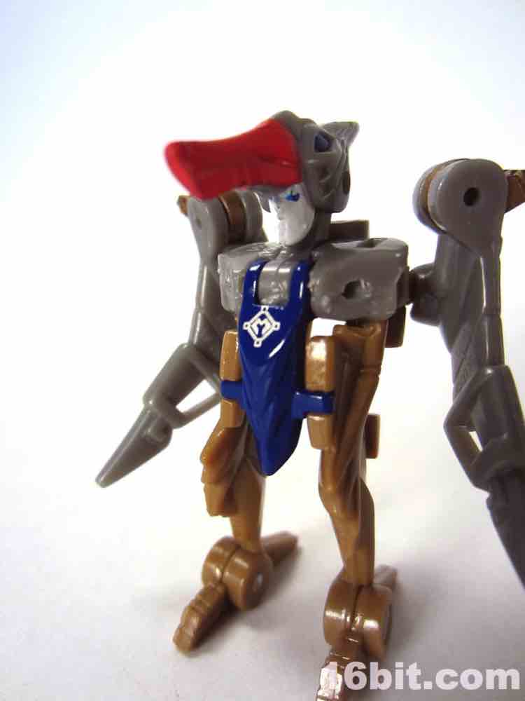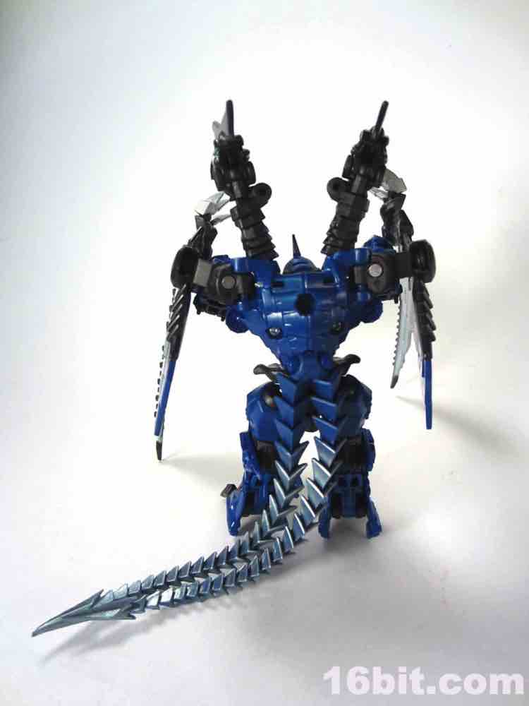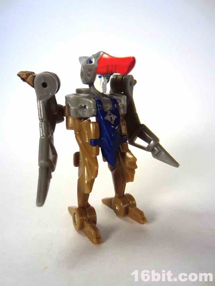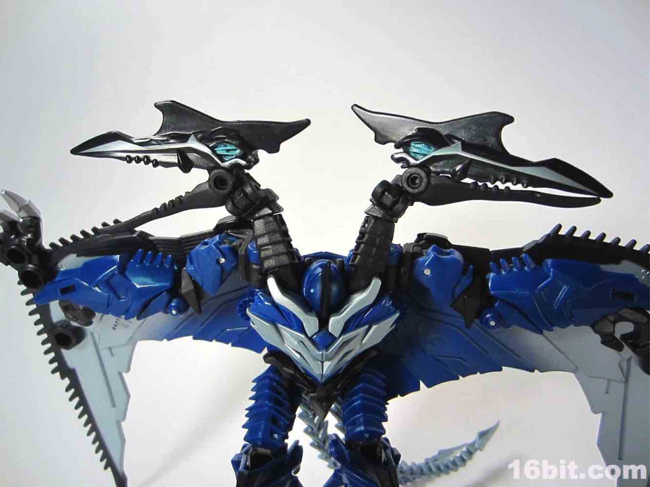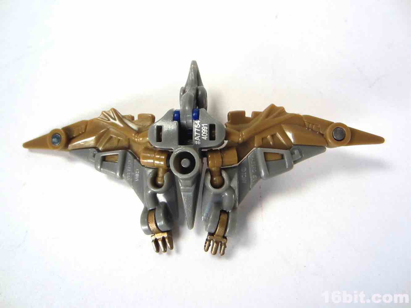The robot and the dinosaur are fundamentally the same, minus where the 3 heads go and how the feet are. Plug the arms into the wings, it's a "dinosaur." The twin heads of the beast look really cool, and each has several points of articulation plus an opening jaw. The positioning of the heads remind me of numerous Beast Wars toys, in that there's no real "correct" position for a piece to fit in - it has a huge range of movement, and goes there because the instructions say that's where to put them. Stock photography shows the heads in numerous positions, but it seems "like a vest" is the intended position. This figure will probably be remembered for its cool wrists, which can swivel up and down, and cursed for his awkward elbows, which don't quite bend like you would want. Getting a cool action pose out of this guy is difficult, but at least it looks acceptable standing around. The big wings are somewhat bulky, but they can swing around behind the figure or flare out like a gargoyle of two-headed death - you've got options. The toy itself has no real action feature to speak of, but opening beast jaws and decent articulation on the necks puts this one... head and shoulders above the rest.