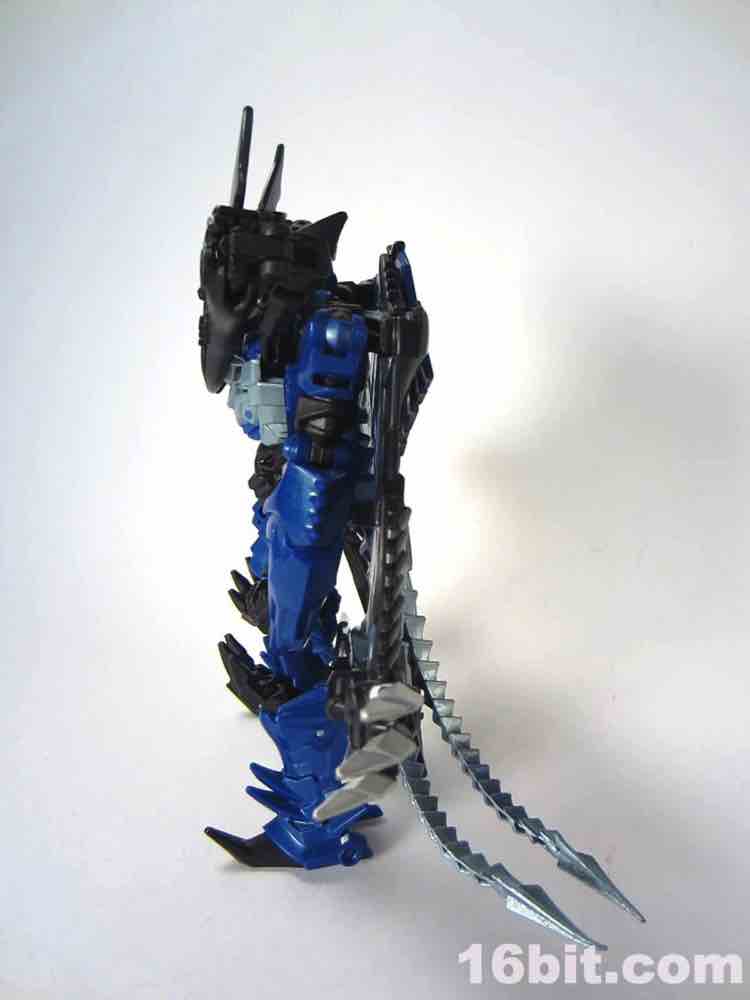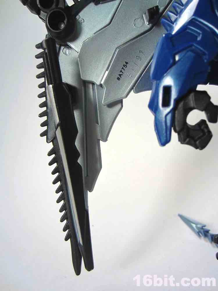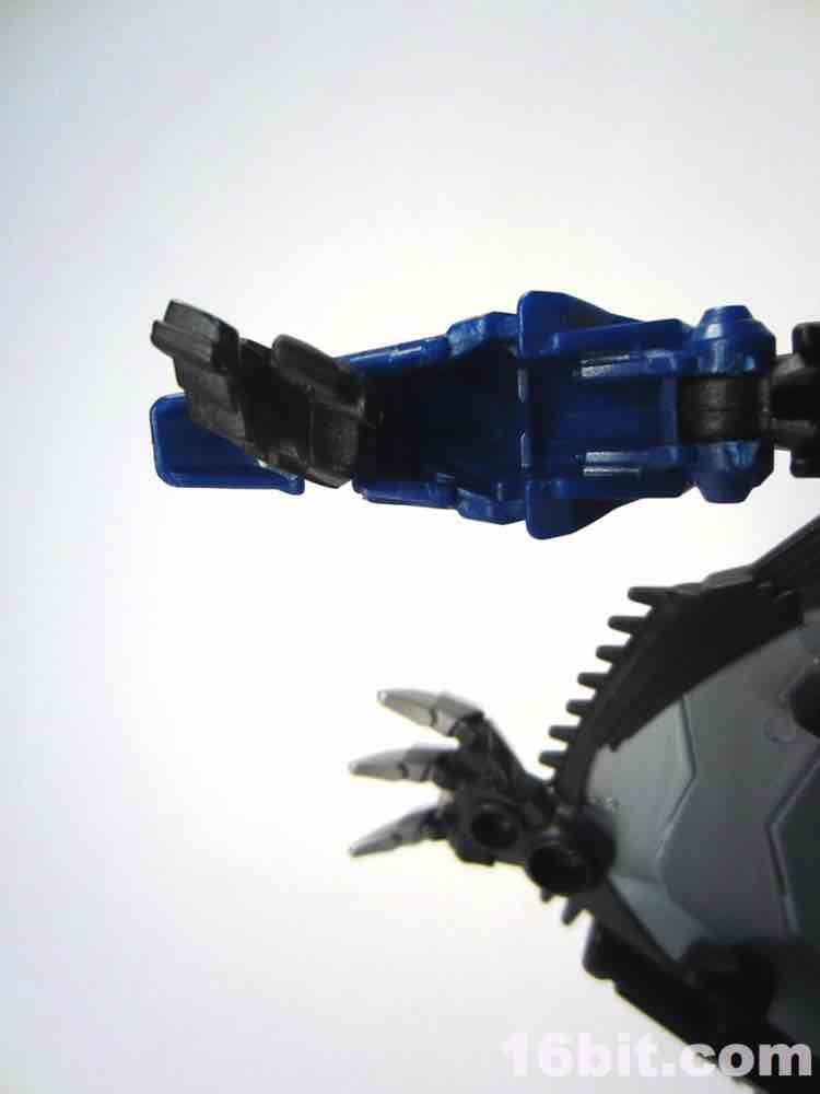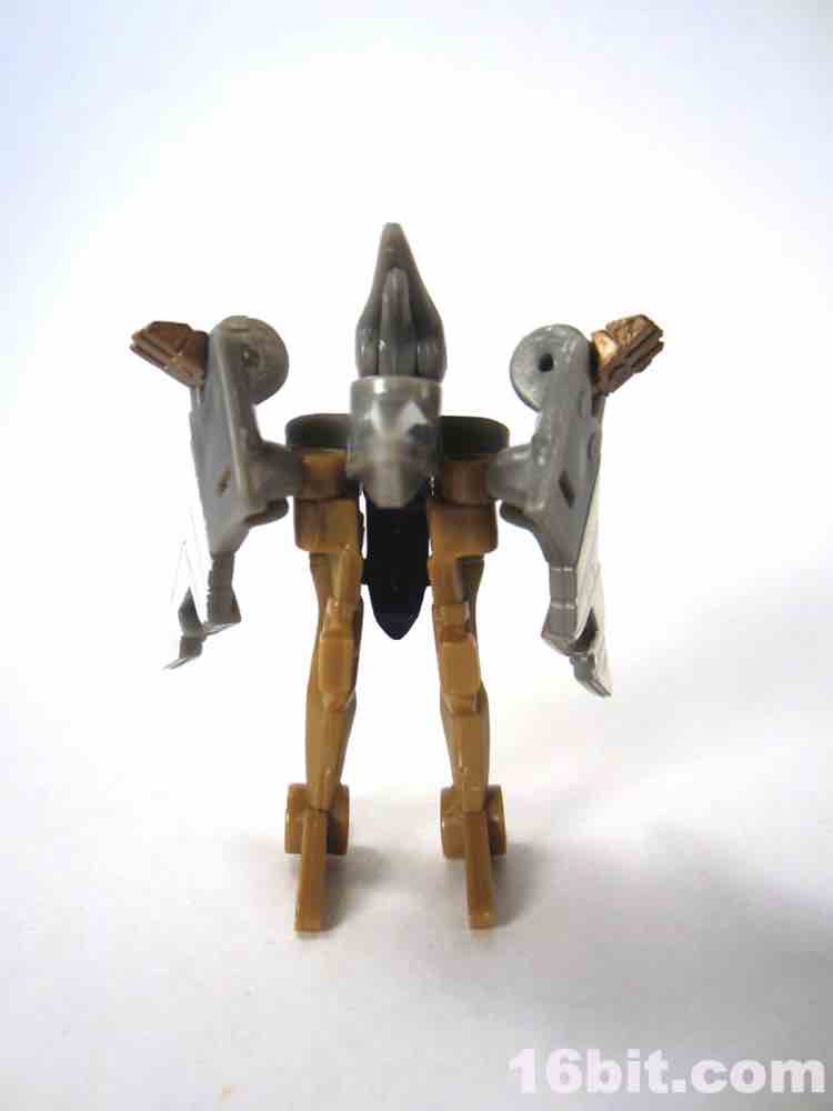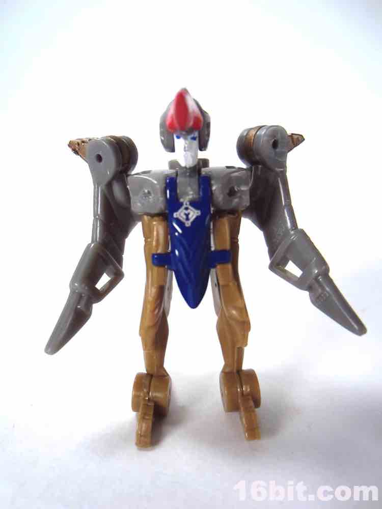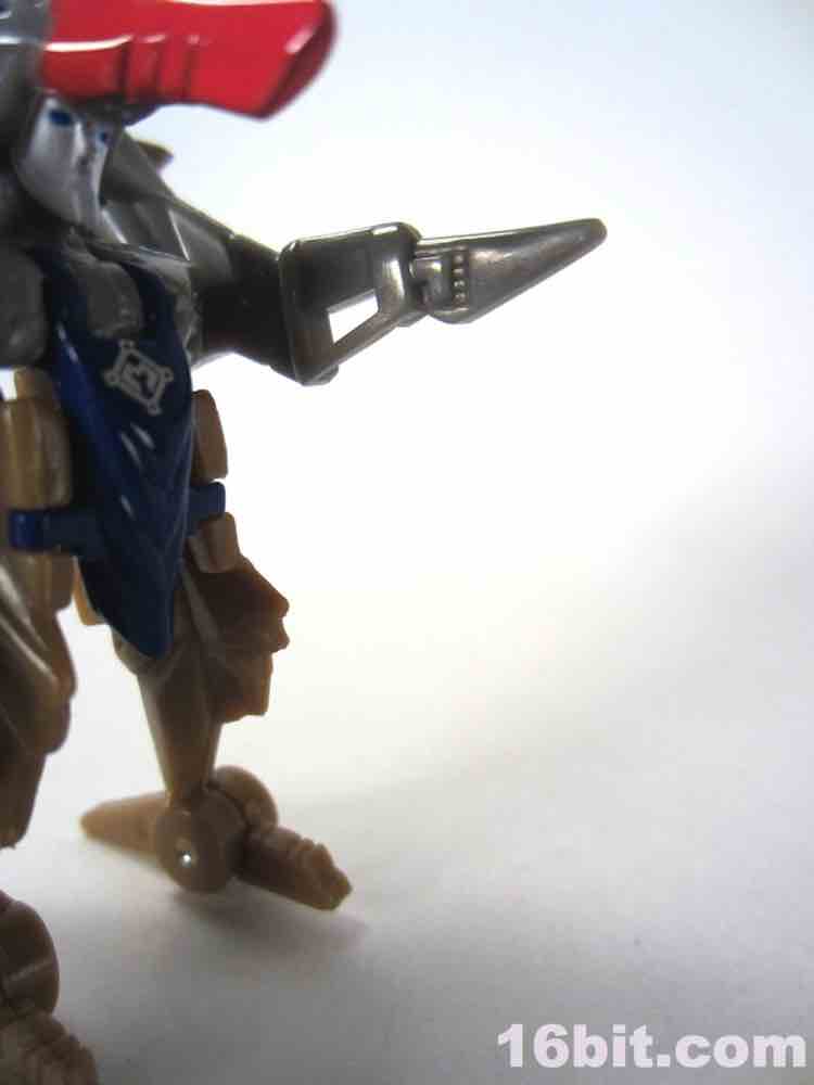 The robot and the dinosaur are fundamentally the same, minus where the 3 heads go and how the feet are. Plug the arms into the wings, it's a "dinosaur." The twin heads of the beast look really cool, and each has several points of articulation plus an opening jaw. The positioning of the heads remind me of numerous Beast Wars toys, in that there's no real "correct" position for a piece to fit in - it has a huge range of movement, and goes there because the instructions say that's where to put them. Stock photography shows the heads in numerous positions, but it seems "like a vest" is the intended position. This figure will probably be remembered for its cool wrists, which can swivel up and down, and cursed for his awkward elbows, which don't quite bend like you would want. Getting a cool action pose out of this guy is difficult, but at least it looks acceptable standing around. The big wings are somewhat bulky, but they can swing around behind the figure or flare out like a gargoyle of two-headed death - you've got options. The toy itself has no real action feature to speak of, but opening beast jaws and decent articulation on the necks puts this one... head and shoulders above the rest.