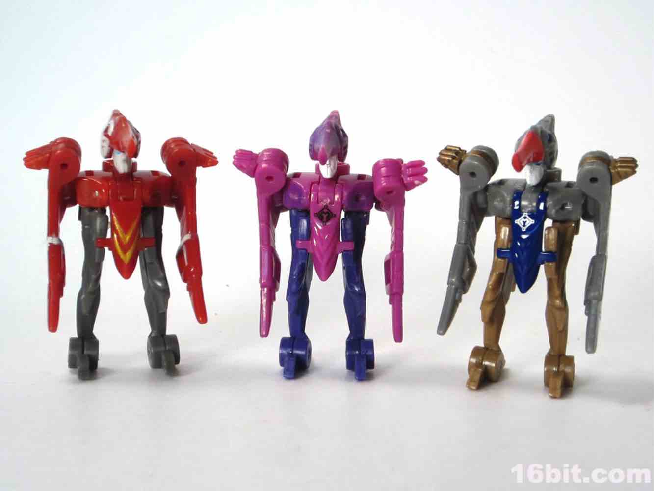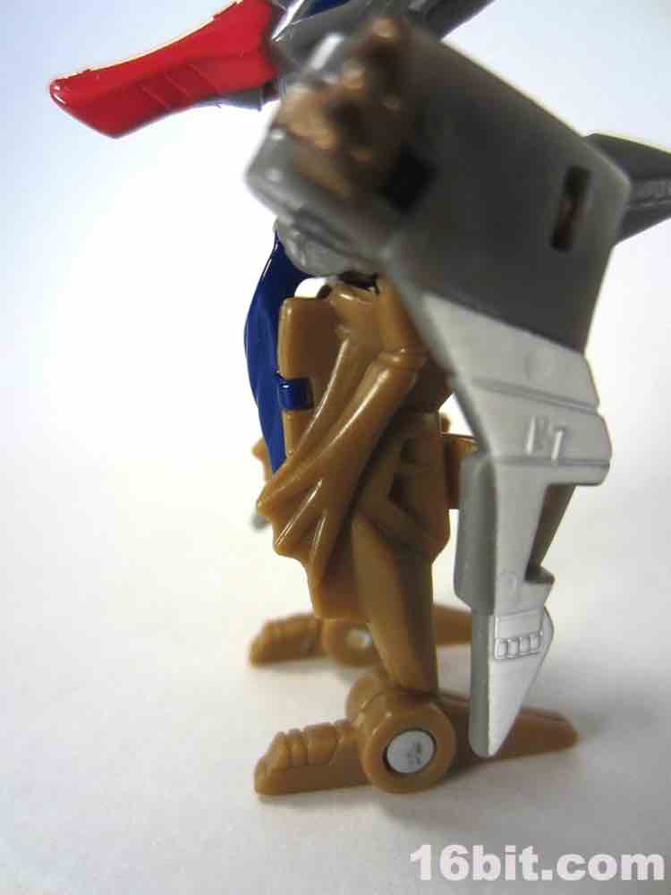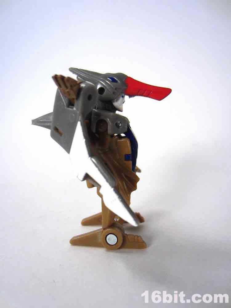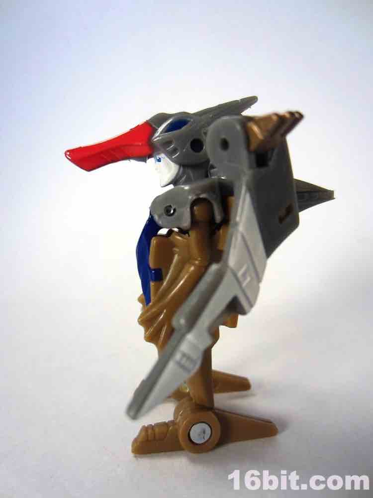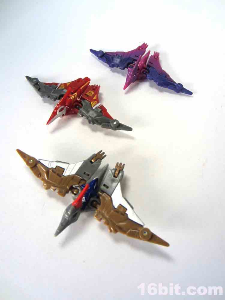 The little guy, Mini-Con Strafe based on Mini-Con Rav which was repainted from Mini-Con Swoop. Since most fans aren't super-aware of the whole "Dollar Channel" assortments, odds are this is your first crack at the deco and it's pretty great. The designers did a nice job adapting this tiny figure to look sort of like G1 Swoop's cartoon model which was based on Diaclone Dinosaur Robo. It's a nice, but very small toy with few moving parts. The arms tend to pop off a bit from time to time, and the beast mode can stand or "fly" quite nicely. As always the Mini-Cons have those 5mm ports so you can slap it on your Armada and Energon toys. The deco is startlingly similar to 2010 Rav, but the big difference is in the printing on the belly of the beast. Strafe here has a date stamp and the SKU, while Rav just had the date stamp. It's kind of ugly, but Hasbro seems intent on doing it even though it's hideous and probably easy to hide. Well, whatever.