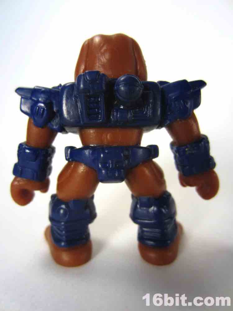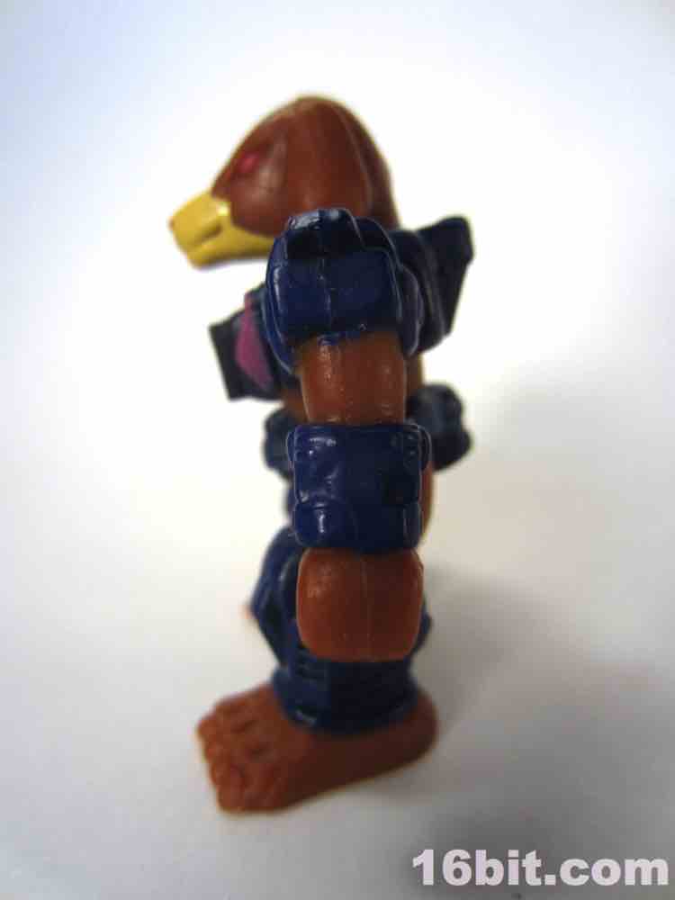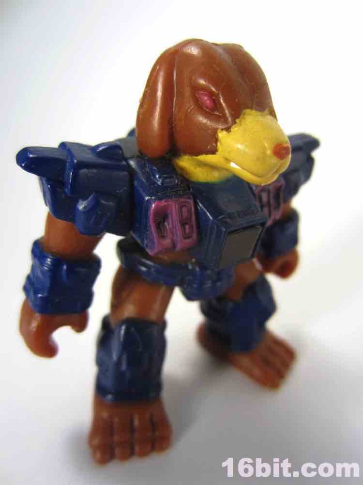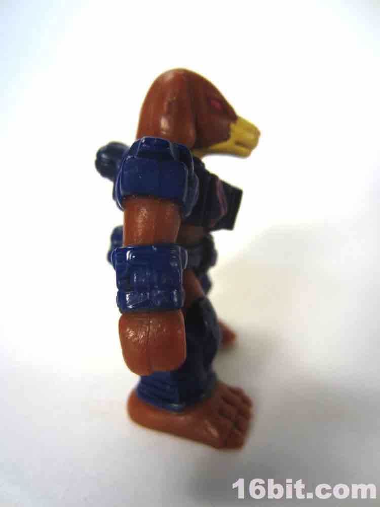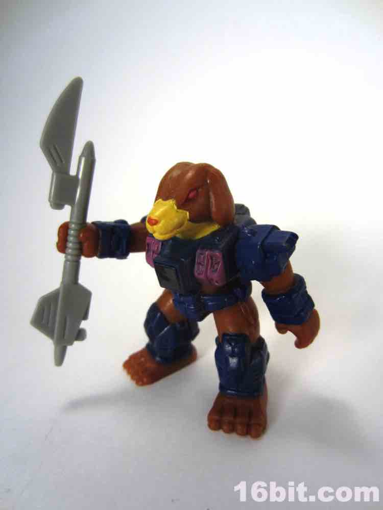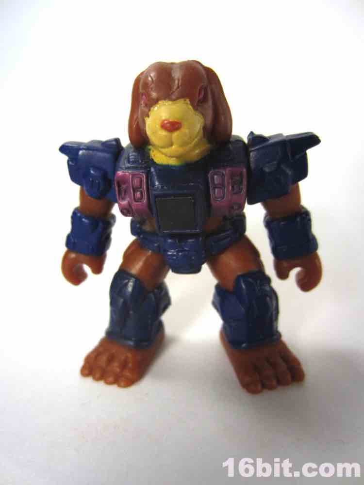 These figures - and 1980s toys in general - have precious few paint applications, so this figure feels like a real winner in how it was executed. The brown molded figure has blue armor with purple highlights and a yellow muzzle, plus paint on his eyes and nose. The purple eyes don't really "pop" but they don't look bad either. The color looks great in normal conditions - these figures were not developed to hold up to the scrutiny of high-resolution digital cameras. His hands can hold most 3mm weapons, so you could probably hand him a Cyberverse Transformers gun or a LEGO accessory. The rubbery plastic has some give to it, so if you had something bigger that would work too. The stout little fellow is quite sturdy, and his big feed keep him from toppling over - as does his lack of leg joints.