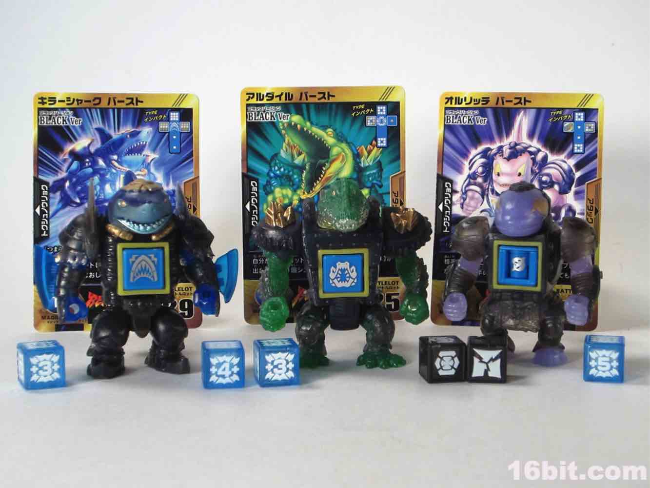 The line that wished it would be the successor of Battle Beasts petered out in under two years, and unless I miss my calculation this was the final release from Takara-Tomy as the 2-inch figures go. I waited on this set for a good long time but now that I have it in my greasy paws, I can say that this wasn't a good choice for a kid line. If you've been following the Hikari vinyl figure line, or see those swell kaiju figures slathered in Monster Kolor, this is kind of like that. These are figures for guys with awesome lighting and glass display cases with exquisite lighting - not for mere mortals. No weapons or shields are included, and they're heavy on the deco compared to previous "burst" figures. As in, there is actual paint included. The die launchers are cast in metallic gold rather than black, so be careful with those over time.