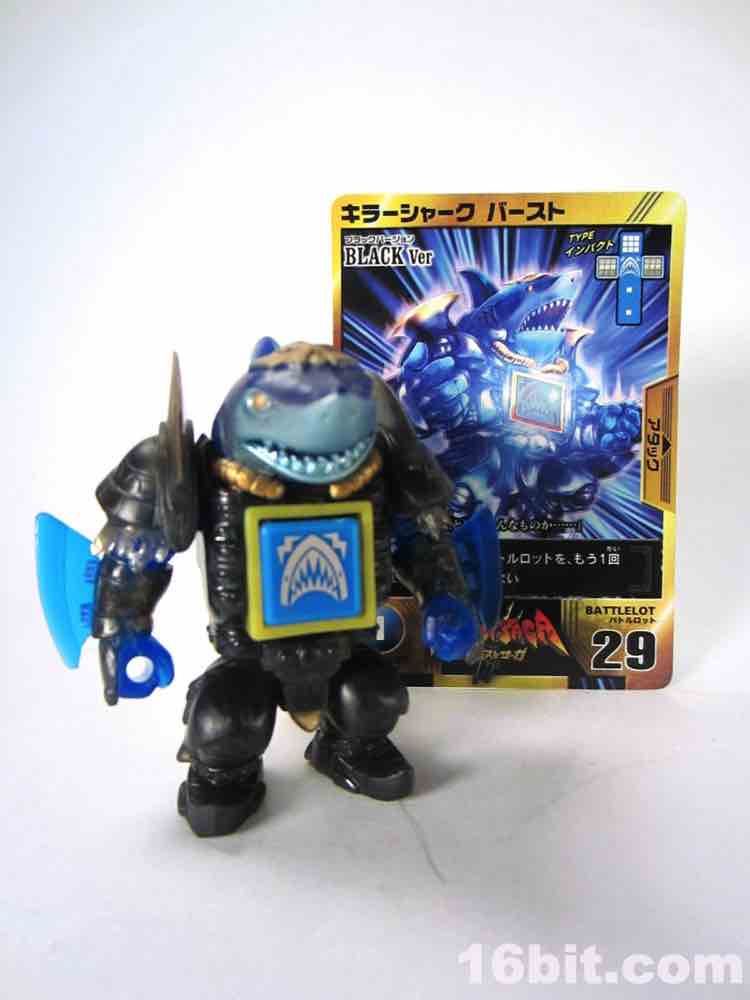 I waited forever to order the Super Win Deck Impact Set in hopes of getting it cheaper, which did not work out too well for me - prices on Amazon got real cheap after I sprang for it off eBay, so ultimately if you can get it under $20 delivered you basically should. The idea here is that these are "Burst" versions - just like the blind-box clears - but the trading card says, in English, "Black Ver." on each one. So you've got Killer Shark Burst, Aldyle Burst, and Olrich Burst cast in clear, smokey plastic armor with blue, green, and purple plastic respectively.