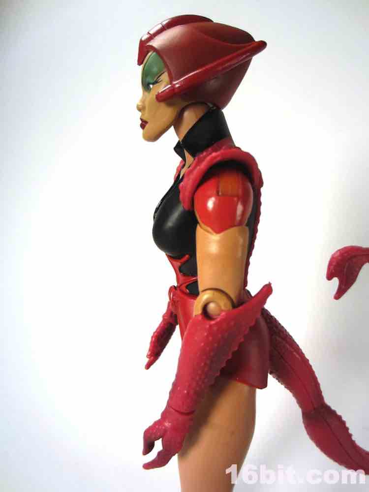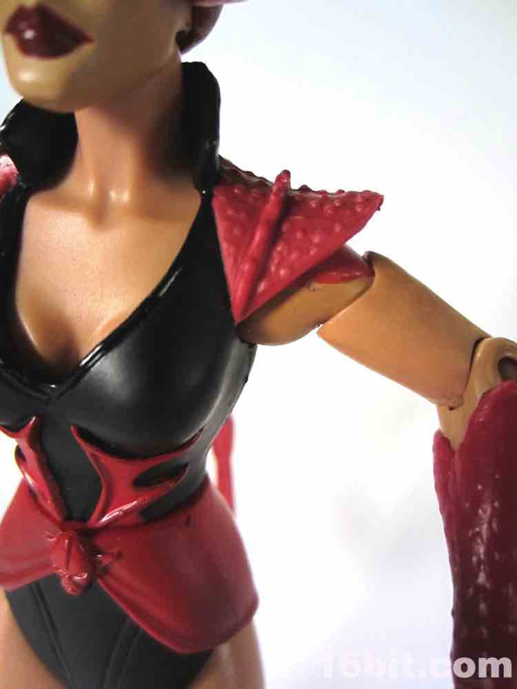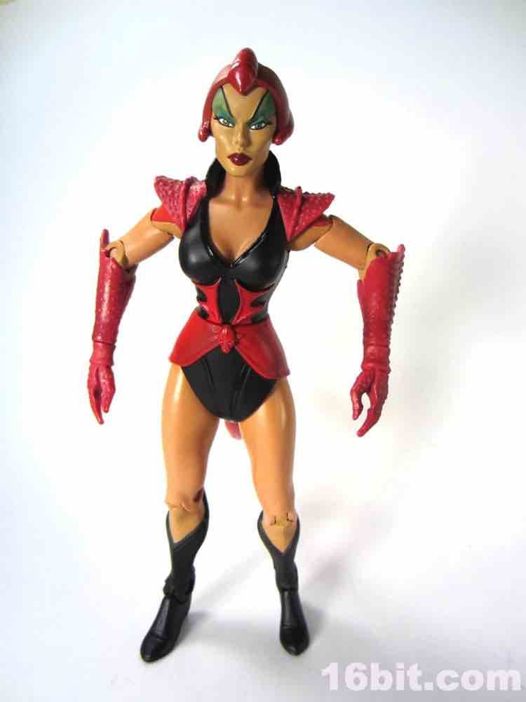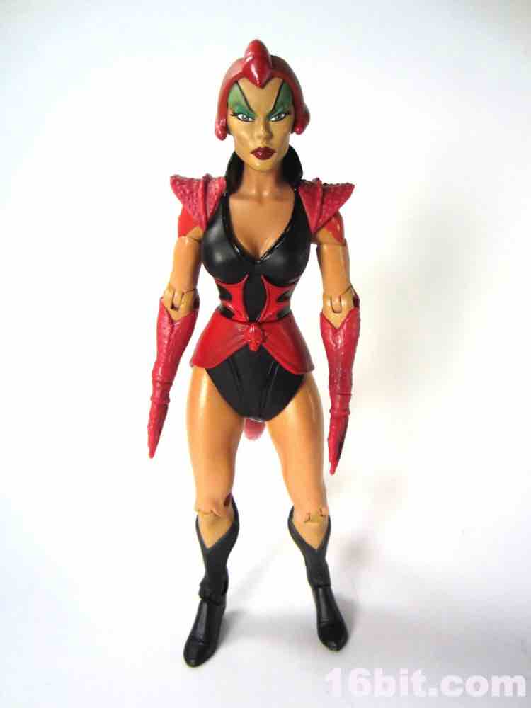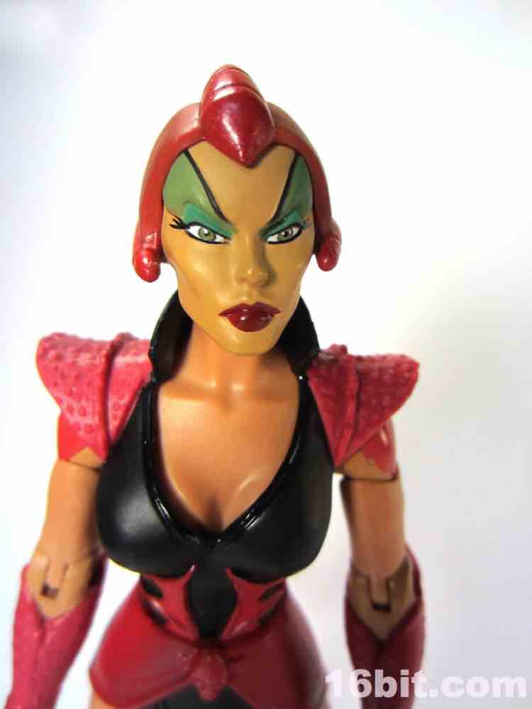 Articulation is on par with most figures, minus a little bit. 18 joints make this a good, but not exceptional, figure in terms of movement. Some spikes on the back of her boots keep her from being able to bend her knees at a 90-degree angle, but the ultimate destination of this figure is going to be on a shelf, or on the card. Sitting on a chair is not in her future, so I guess I can easily let this one go. The bug parts have a wonderful texture, while the cloth bits are nicely painted. The glossy black trim on her dress looks superb, and the Horde motif on the front looks great. Her metallic red helmet sports two shades of red, while her make-up may be more ornate than any entire figure from the vintage line. Deep red lipstick, two flavors of green over her eyes, sharp cheekbones, and steely eyes make her head one of the best in Mattel's entire product catalog. Seriously, I've seen a lot of dolls and action figures and this is easily one of the best I've ever seen from them.