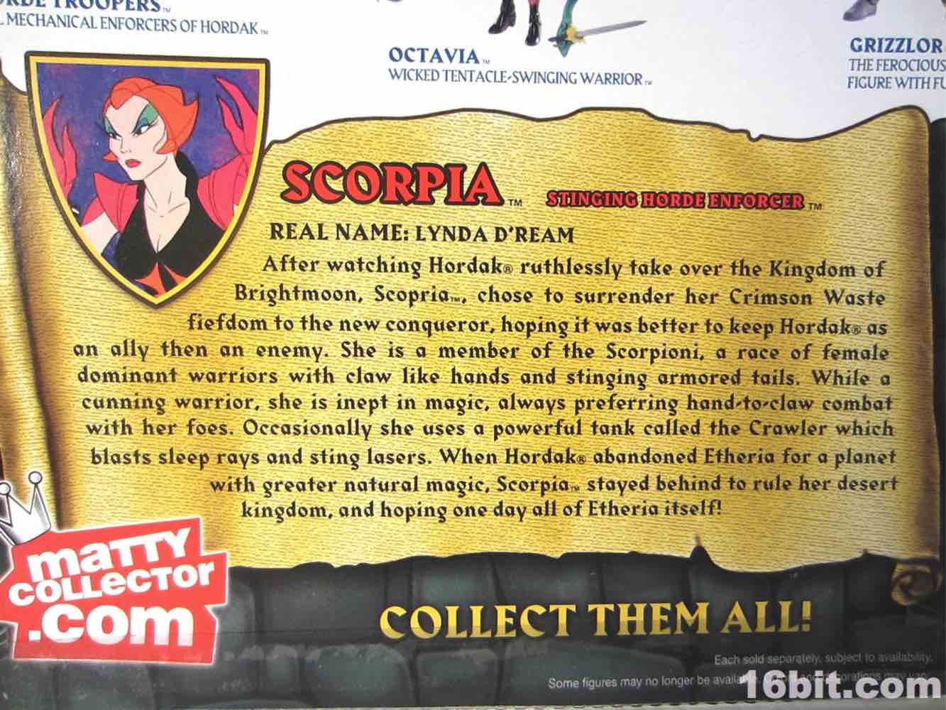I'm more excited about the Horde villains than I should be as Filmation goes. Those animators really came up with a killer suite of characters for the She-Ra cartoon like Octavia and Shadow Weaver, and I'm delighted to have them sitting here with me so that i see them every time I leave my office to go to the bathroom. (They're on the way, not in the bathroom.) When people look back at this line in the future, I'm sure the Horde will get high marks across the board so it stands to reason that these may be a tad bit more expensive if you wait too long. Hopefully Mattel held back a few so you can get her cheap. A lot of Mattel's figures turned out well, but this one turned out really well. In terms of sculpt and deco, Scorpia gives other similarly sized action figure lines a run for their money - she won't be able to sit in any vehicles, but that's OK. You'd want to see her tail, anyway.