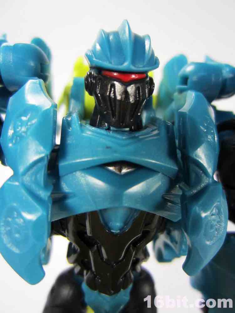 The 5-inch robot keeps the knight motif going only barely, there's a medieval helmet going on in the head but the rest of the toy just looks like a pile of dinosaur parts. The legs and articulation are awkward, but the dinosaur looks so cool I'll allow it. Parts of the transformation are quite fun, but once you get it in robot mode it's not like the arms and legs have a big range of movement. One of the more surprising things about this toy is that it appears my sample has no Autobot symbol on it - the other dinobots do, but not htis one. Go figure! The red eyes and black face work well with the greenish colors, but it's so dark it absorbs a lot of detail. With 14 points of articulation, the robot should move around quite nicely but there's only so much you can do when covered in feathers, spines, and dinosaur kibble.
