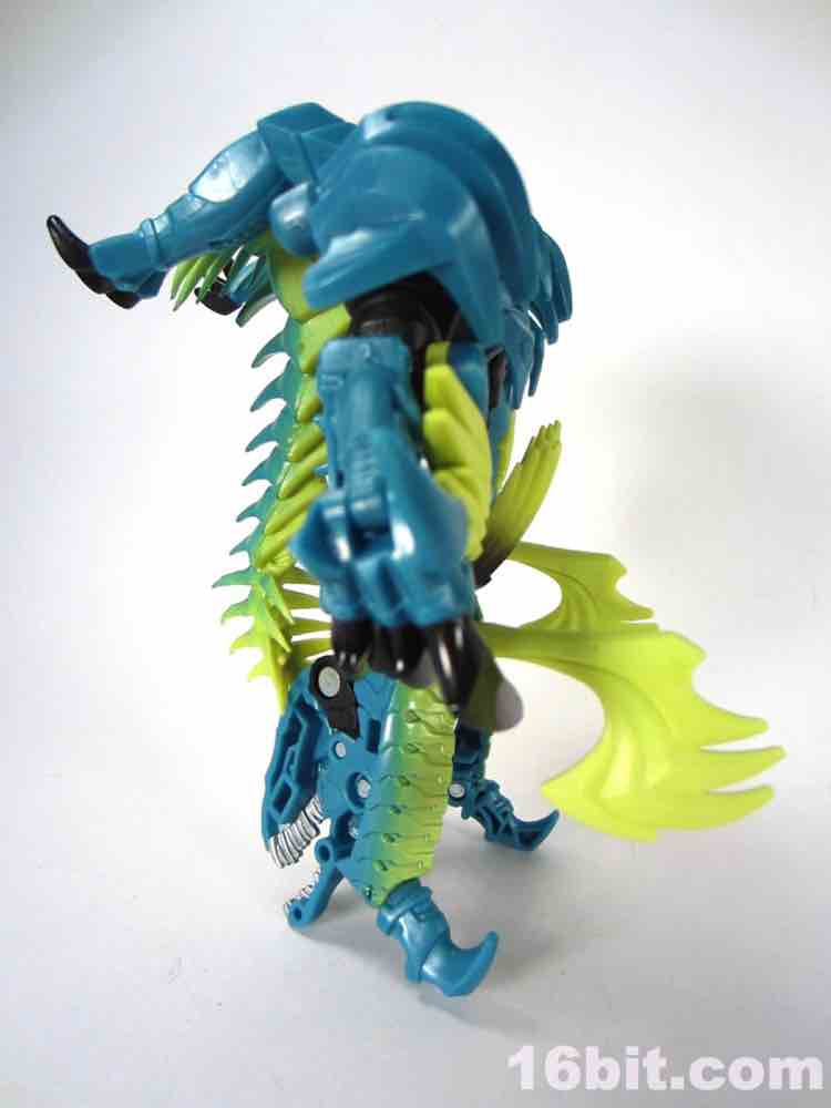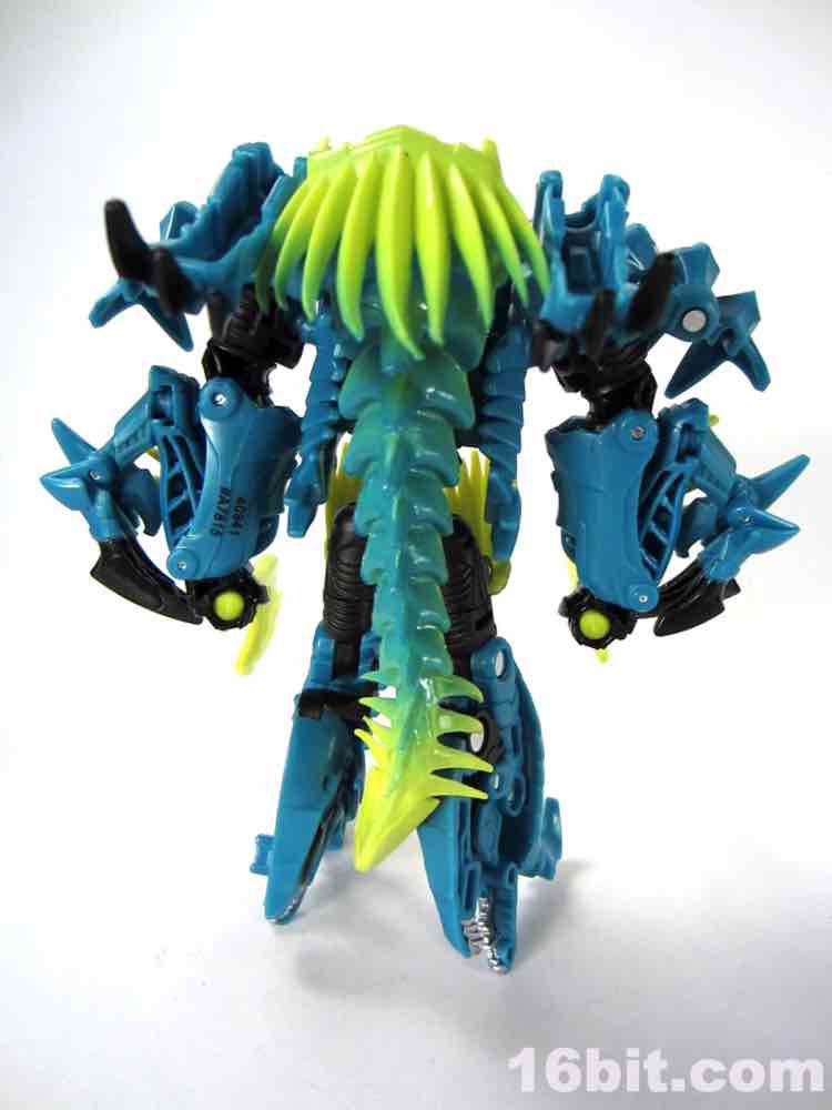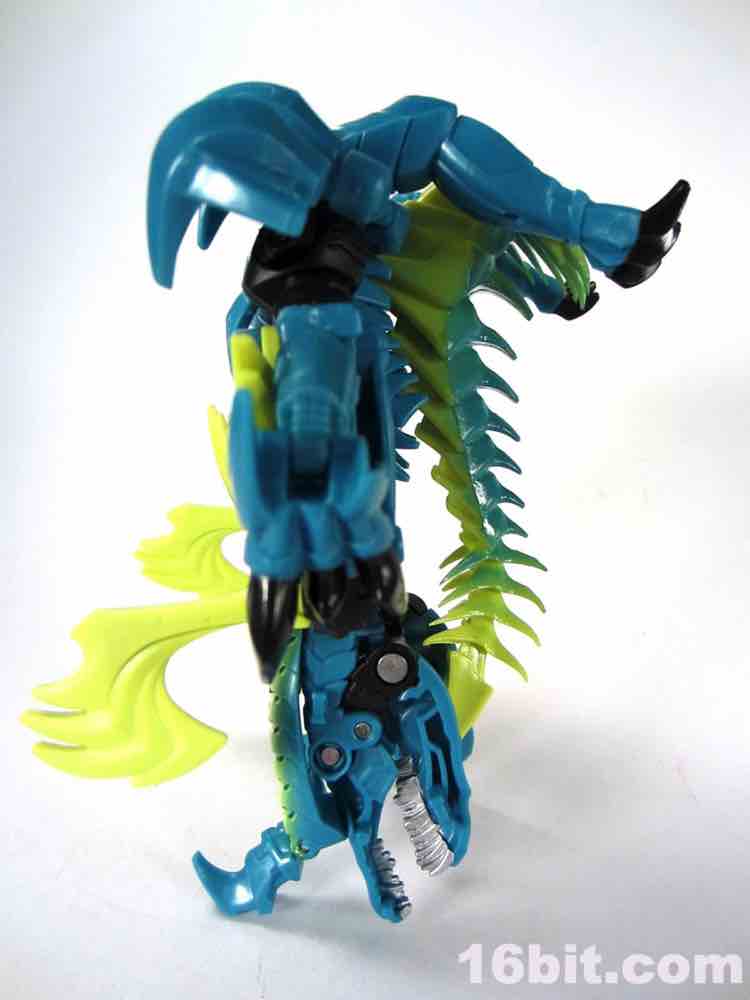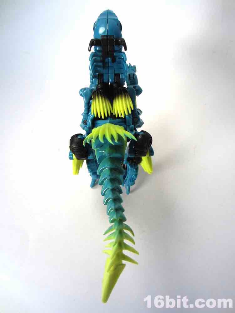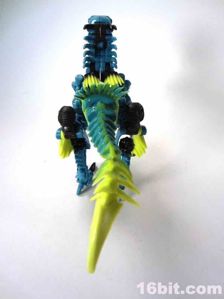Packaged in dinosaur mode, you have to massage a few bits in place to make it a solid dinosaur on your desk. The design is a little wonkier than the others, but it's no less charming - the original Slash design was sort of a conceptual army of sorts, a bunch of grey ones are seen in concept art following around Scorn on a bridge. He didn't make the movie, but the toy is pretty slick - the bright green and bluegreen skin make for a toy that looks like it was vomited up by the late 1990s. I bought this specifically because it reminded me of the The Lost World: Jurassic Park Chaos Effect toy line from Kenner in 1998. Oh that was a fine line - ugly, hybrid dinosaurs and wacky action features. I miss it so much. The dinosaur has little articulation - the head and jaw, the arms, and to some extent the legs. You can't muck around with the legs too much because it needs to balance, but it's pretty easy to get him standing upright. He feels sizable compared to the other dinosaurs in the line, and his spines are sort of featherlike and quite charming.