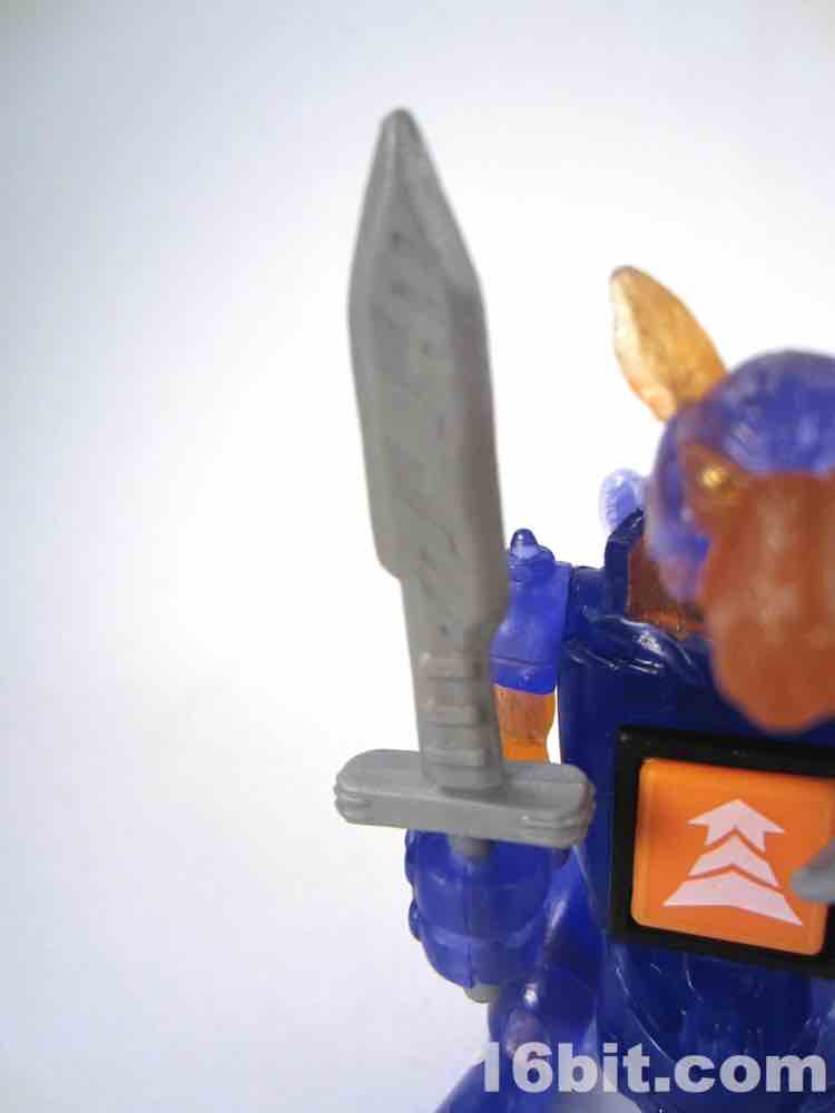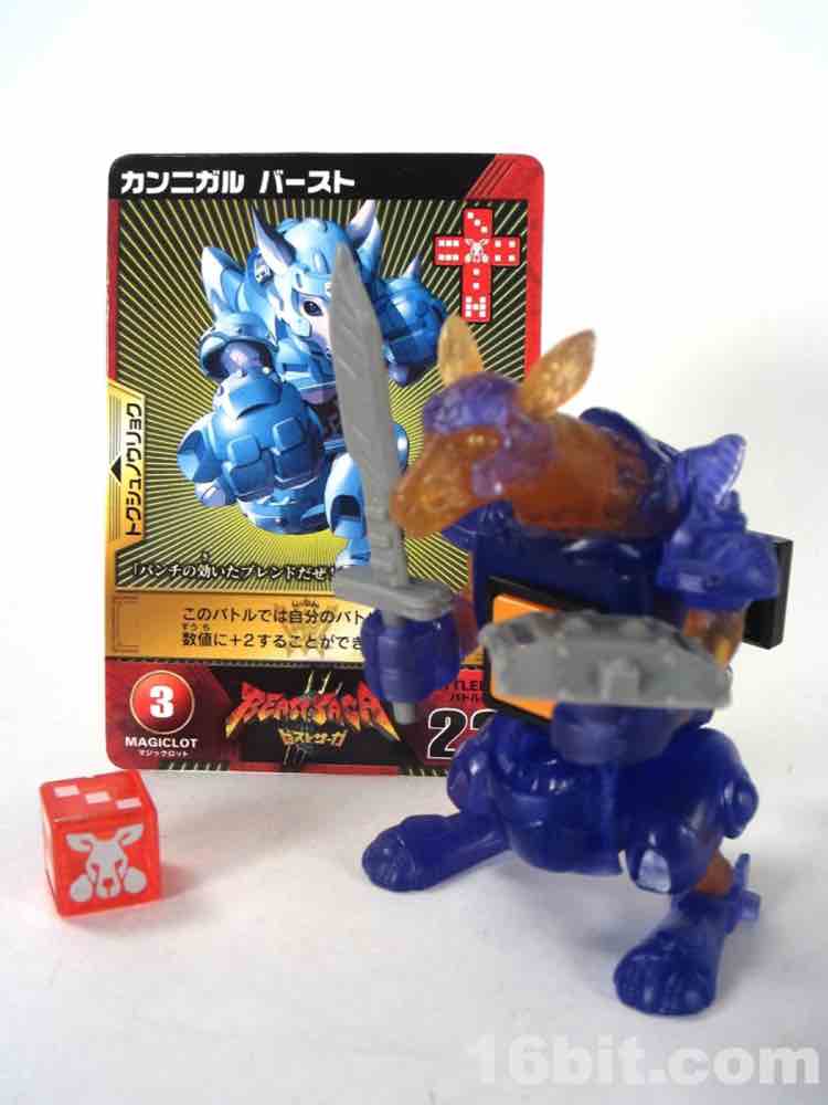 His gear is the same sword and shield that came with single-carded Liorga, or the bat, or many other figures - Takara-Tomy did not spring a lot of cash in accessory development for this line. An orange arrow die is joined by a red one specific to all releases of Kannigal, which oddly does sport boxing gloves on one side.
