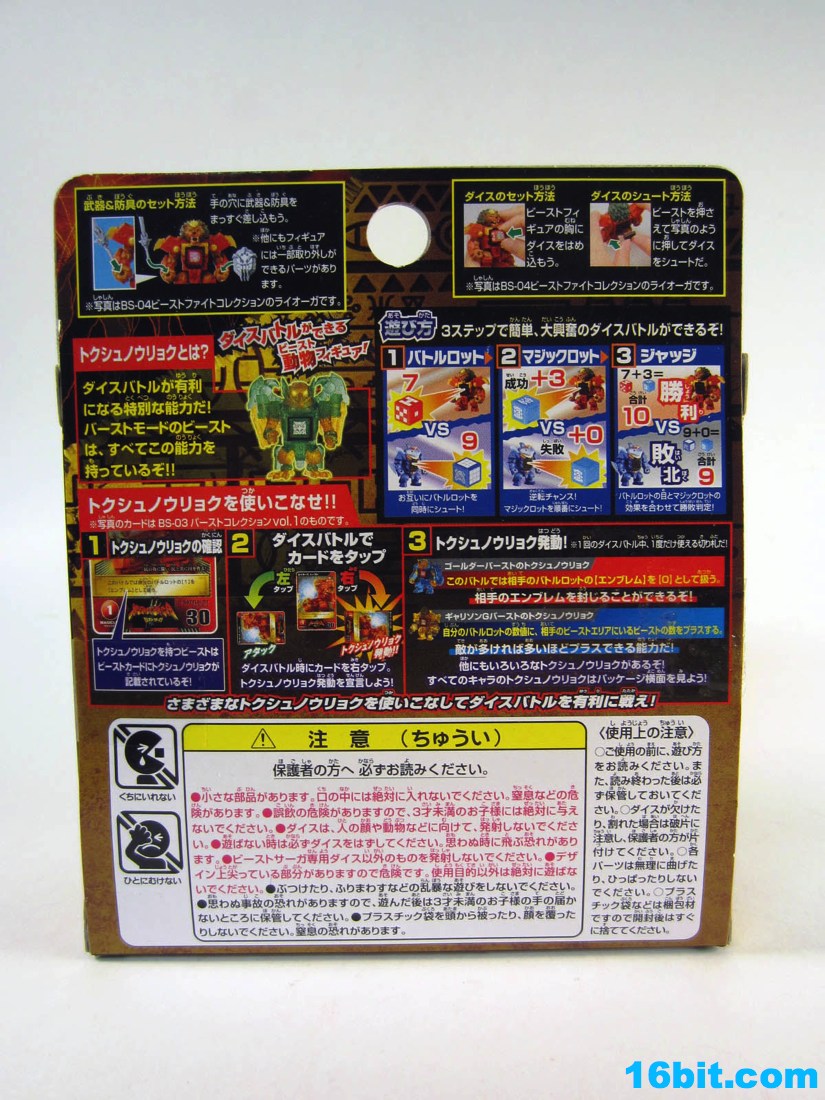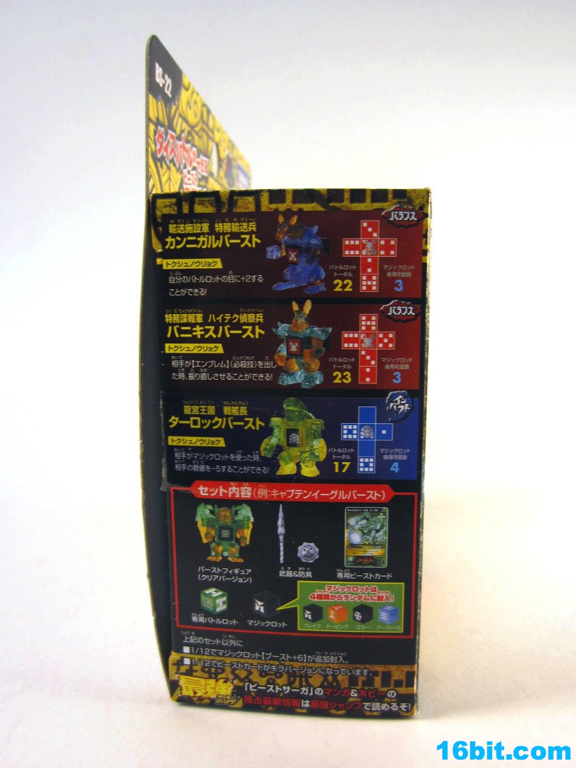 Item No.: BS-22 Manufacturer:Takara-Tomy Includes:Sword, shield, 2 dice, trading card Action Feature:Dice launch out of stomach Retail:525 yen (or about $7) Availability: December 2012 Other: Clear Blue and Clear Orange