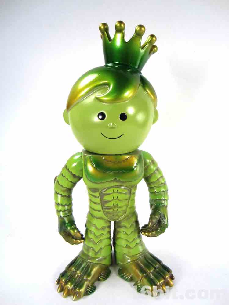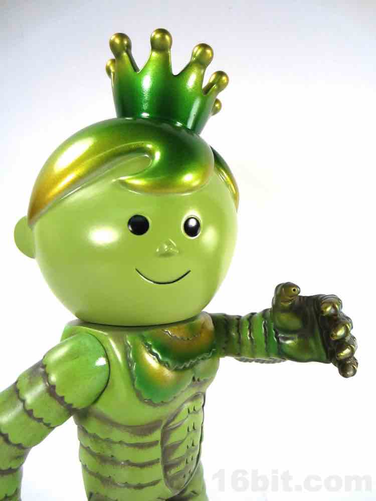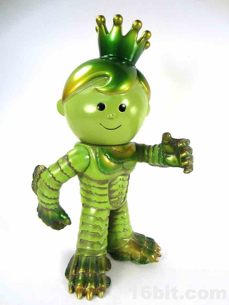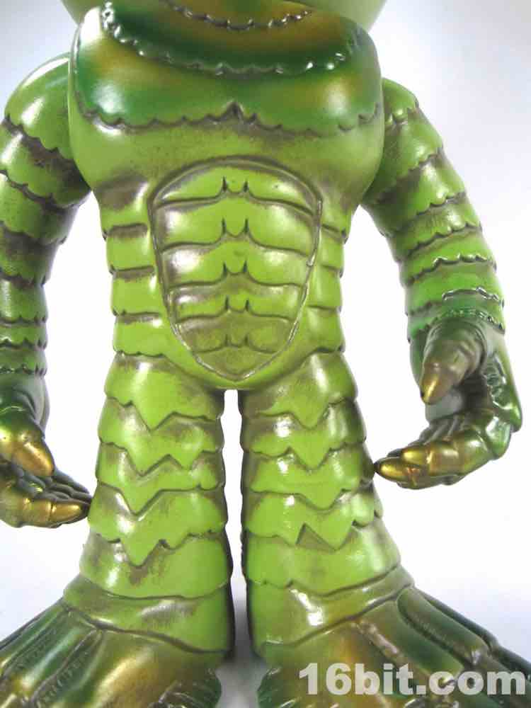 The figure has 3 points of articulation and is cast in hollow vinyl. The arms rotate and the head turns, but the figure's real charm comes from the deco. The body is green with a muddy brown was, bringing out the scaley detail in the arms. The claws are metallic gold, and other metallic green highlights are on the scales.