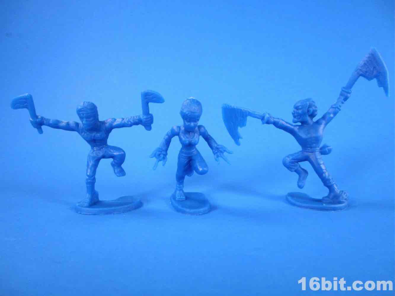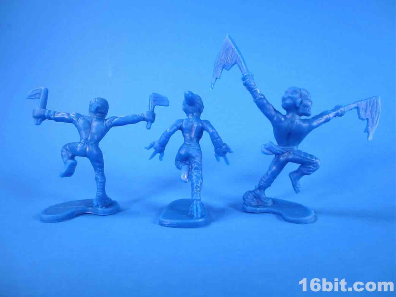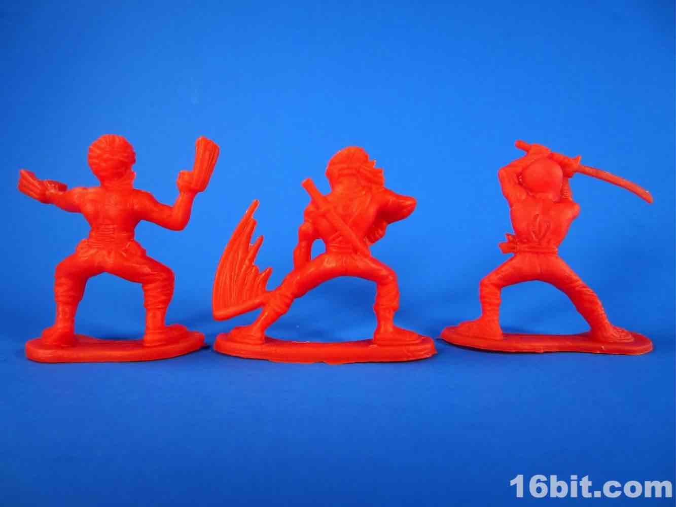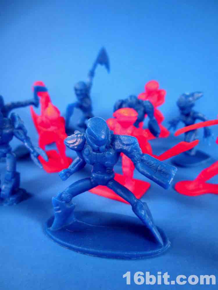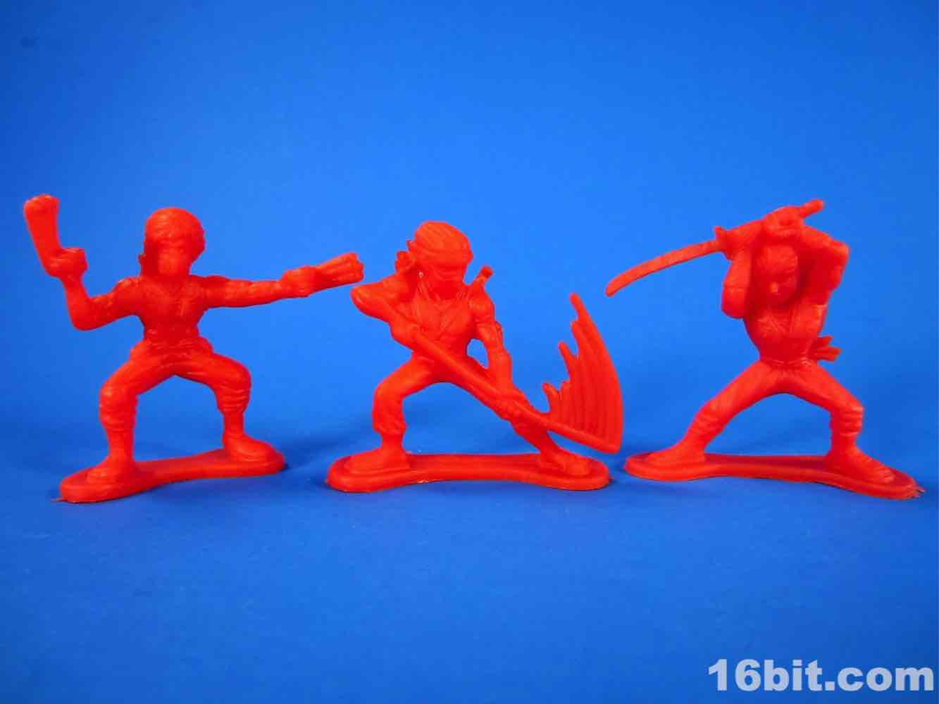 While usually each team has its own color, this set mixes things up a bit - the robots are 3 red and 3 blue, as are the ninjas. The robots are rather modern-looking and you can sniff out inspiration from Halo and various futuristic miniature figure games. There are no markings to identify them beyond "CHINA / CHINE BLIP LLC" meaning that these will probably be ignored, junked, and sold by the sack down the road. There's no real branding here so odds are they'll only be known to the people whose parents orbited the cheapo toy section at Target.