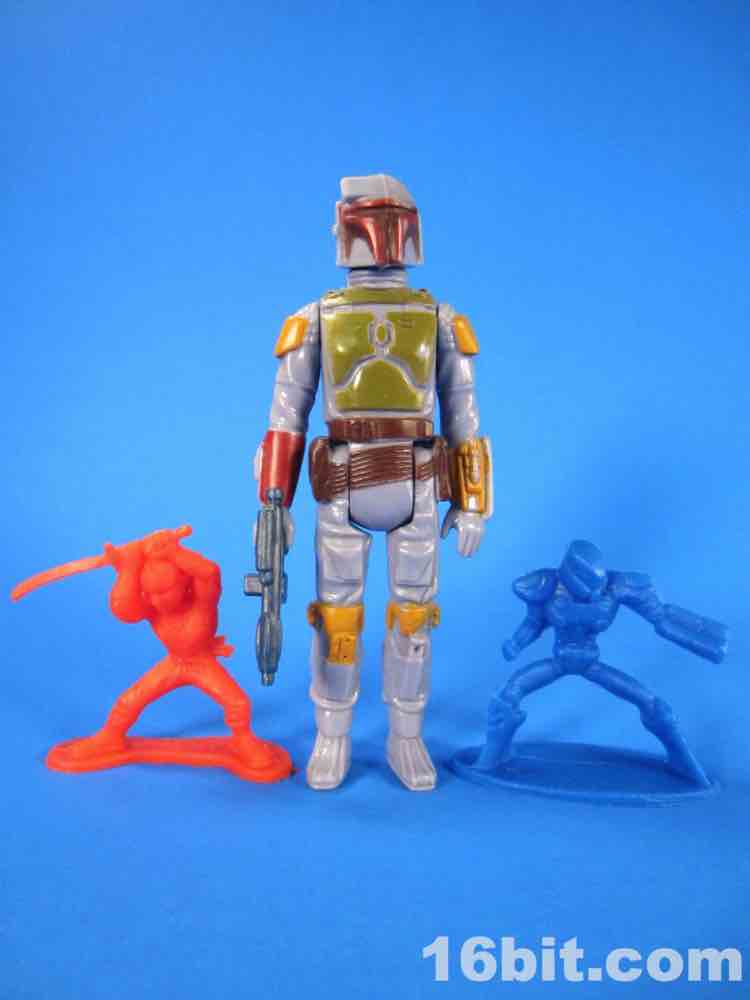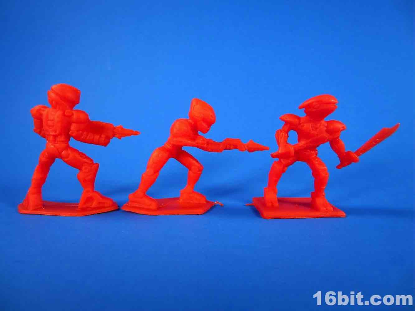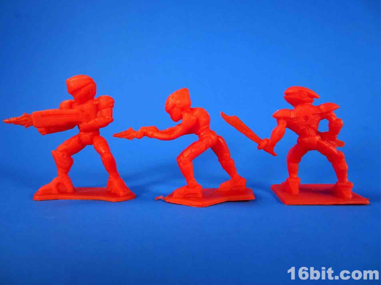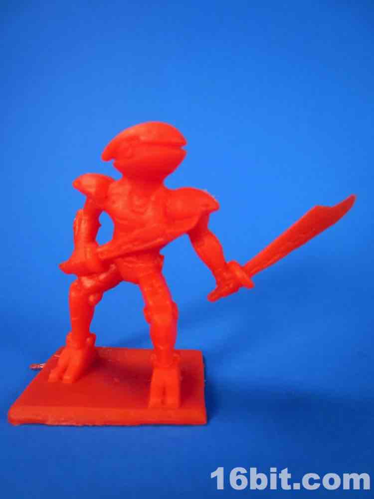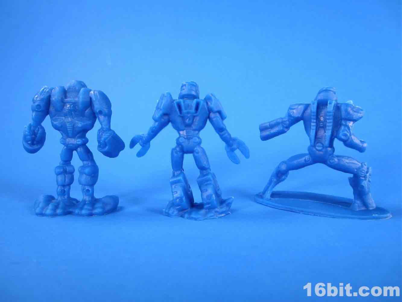 While usually each team has its own color, this set mixes things up a bit - the robots are 3 red and 3 blue, as are the ninjas. The robots are rather modern-looking and you can sniff out inspiration from Halo and various futuristic miniature figure games. There are no markings to identify them beyond "CHINA / CHINE BLIP LLC" meaning that these will probably be ignored, junked, and sold by the sack down the road. There's no real branding here so odds are they'll only be known to the people whose parents orbited the cheapo toy section at Target.