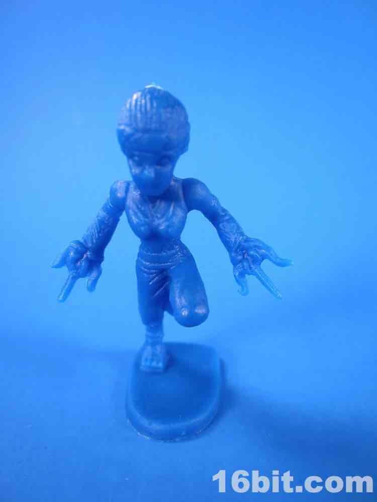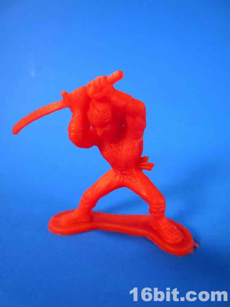 Three of the six ninja figures are standing on one foot, but stand just fine. Thank you, display bases. A lady ninja was included, and just like the men her anatomy is exaggerated to be visible at this scale - her head is a little larger, she has a ponytail, and she wields a nasty sai set. Her smaller torso and oversized head is a little strange, but at this scale exaggeration tends to be important as toys go. Her face seems to have a mask - the head, especially near the neck, makes it seem as such - but the face also has a nose and a mouth. I get the feeling that this figure was unfinished, or this is an unfortunate lady ninja who does not enjoy the cultural cache that having a chin brings. It's not like these are fine miniatures to be painted by a skilled hand under a magnifying lens - the point is to have these figures fight, or be destroyed because the kid is pissed off he wanted a Power Ranger or Batman.