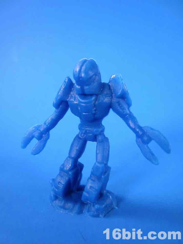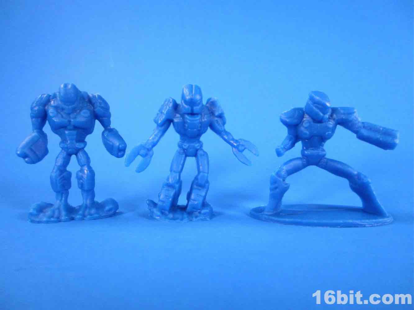 Some of the robots look vaguely like Super Battle Droids from Star Wars, but with gun arms or claw hands. Yes, you too can enjoy the clamps. The sculpts are quite simple and they make a lot out of having no texture and no deco. You'll notice some are standing onr ocks or mounds of dirt, and many have little creative flourishes. The clamp-hand robot has wheels for feet, while one has a whale-like head and two swords. A blue figure with a wide stance has a cannon arm, a Samus Aran pose, and what seems to be a Master Chief-inspired helmet. The set does not seem to be telling any particular story, and the varied looks offer value but I'm left wondering what - if any - instructions were given to the designers. They're really neat, but what is the takeaway here?