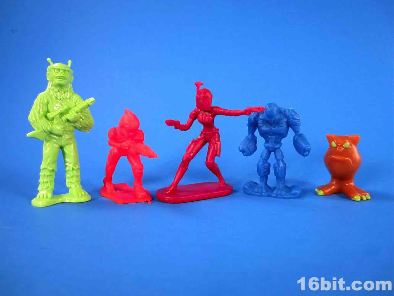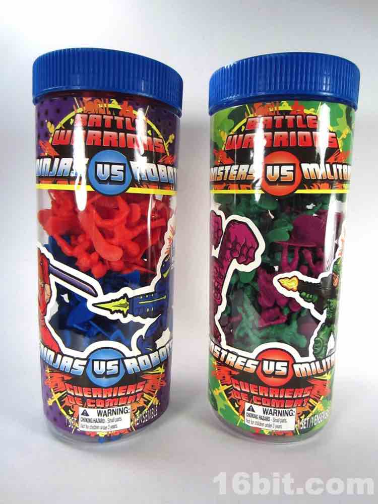 When was the last time you got a toy (that wasn't Hot Wheels or a blind-bagged figure) for under $5? Action figures keep flirting with the price point, but generally speaking it's not as common. Some toymakers do giant tubs of army men for $10, but a few are experimenting with lower price points. Imperial toy did Army vs. Cavemen, Zombies vs. Anti-Zombie Squad, and Pirates vs. Ninjas. Now Blip Toy - the Squinkies people - are bringing us Monsters vs. Army and Ninjas vs. Robots. While effectively playing out the four sacred pillars of easy Internet love - Robots, Monkeys, Ninjas, and Pirates - this format revives the cheap figure of the 1960s and 1980s. I would say these veer more toward the 1980s due to the slightly thinner plastic, cheaper feel, and slightly more stylized look.