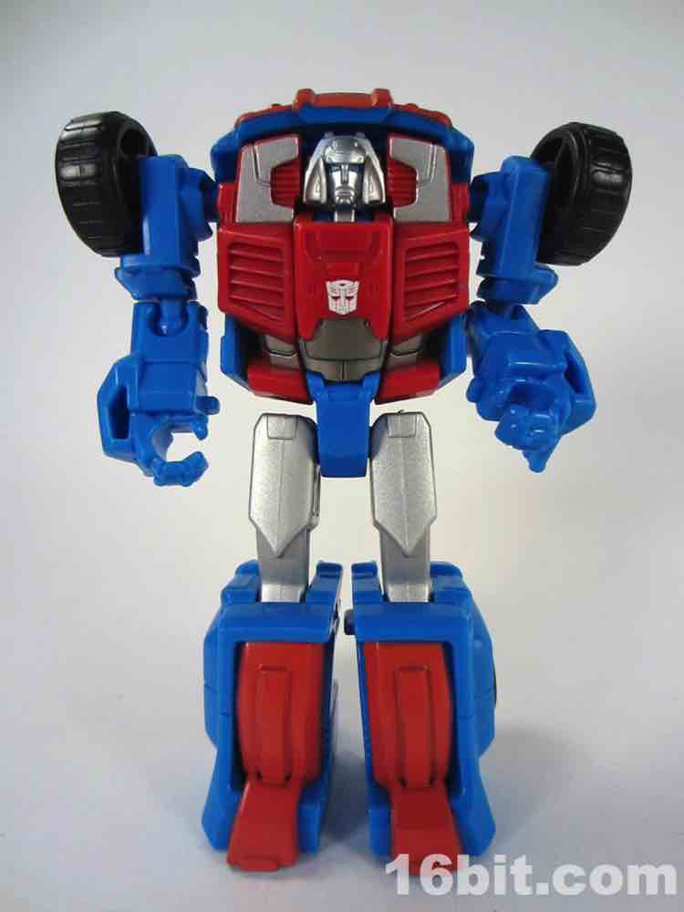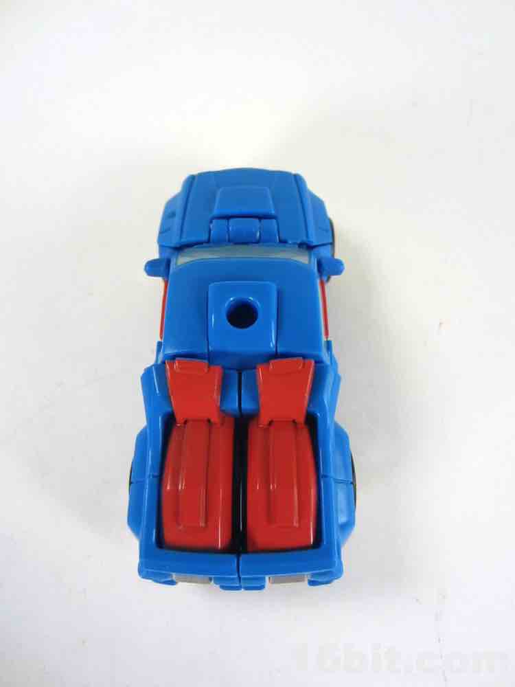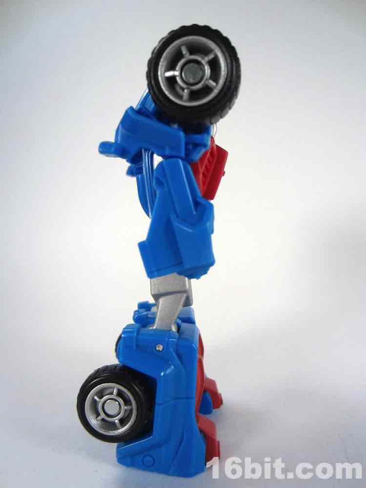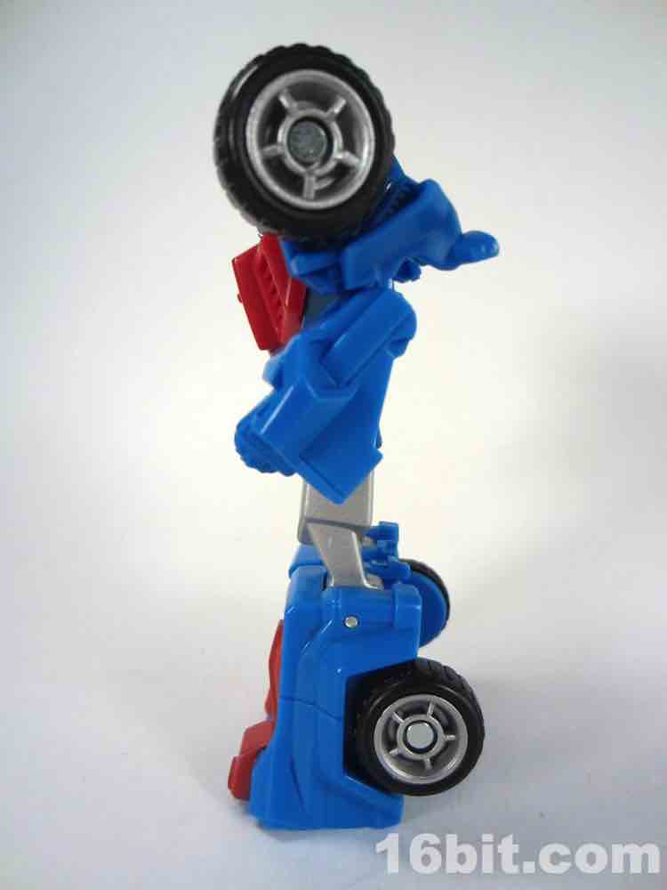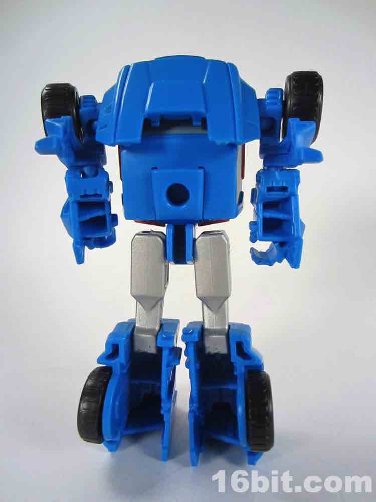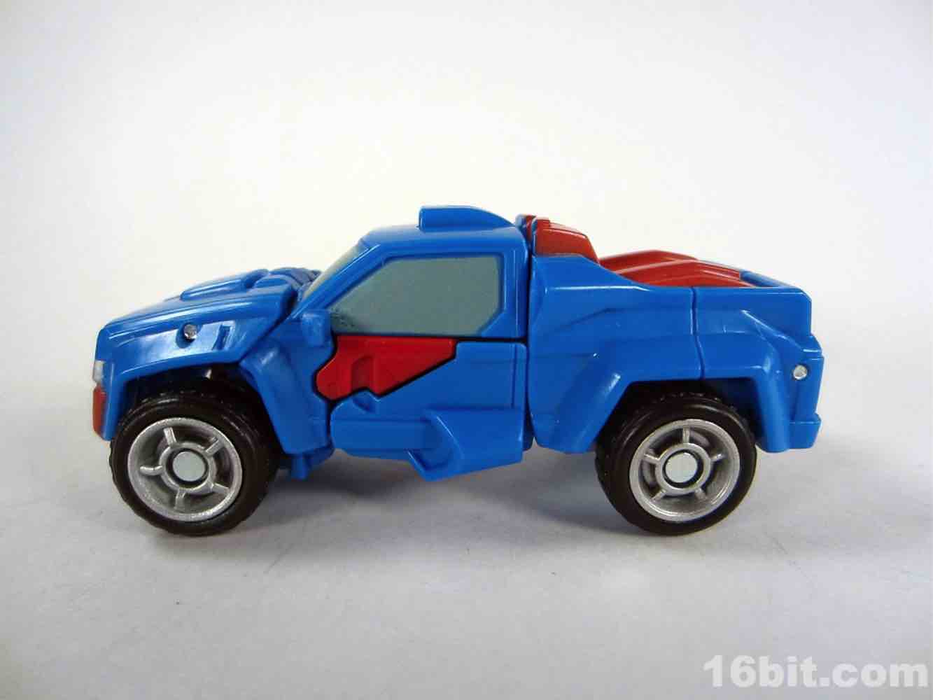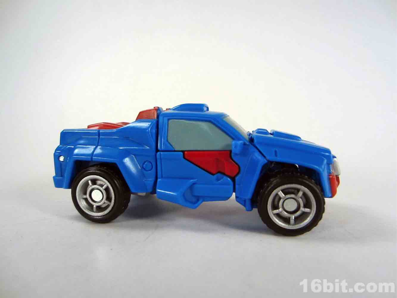 Transformation is a snap, just like with Swerve. Legs fold up, arms tuck in, and with a clever couple of moving bits in the chest you've got yourself a great blue truck. The wheels roll quite freely and nicely, but the windows have an odd red panel just underneath. It's distracting, and not how it looked on the packaging shots.