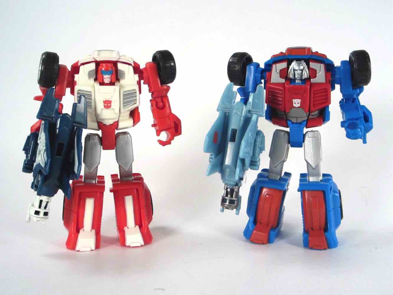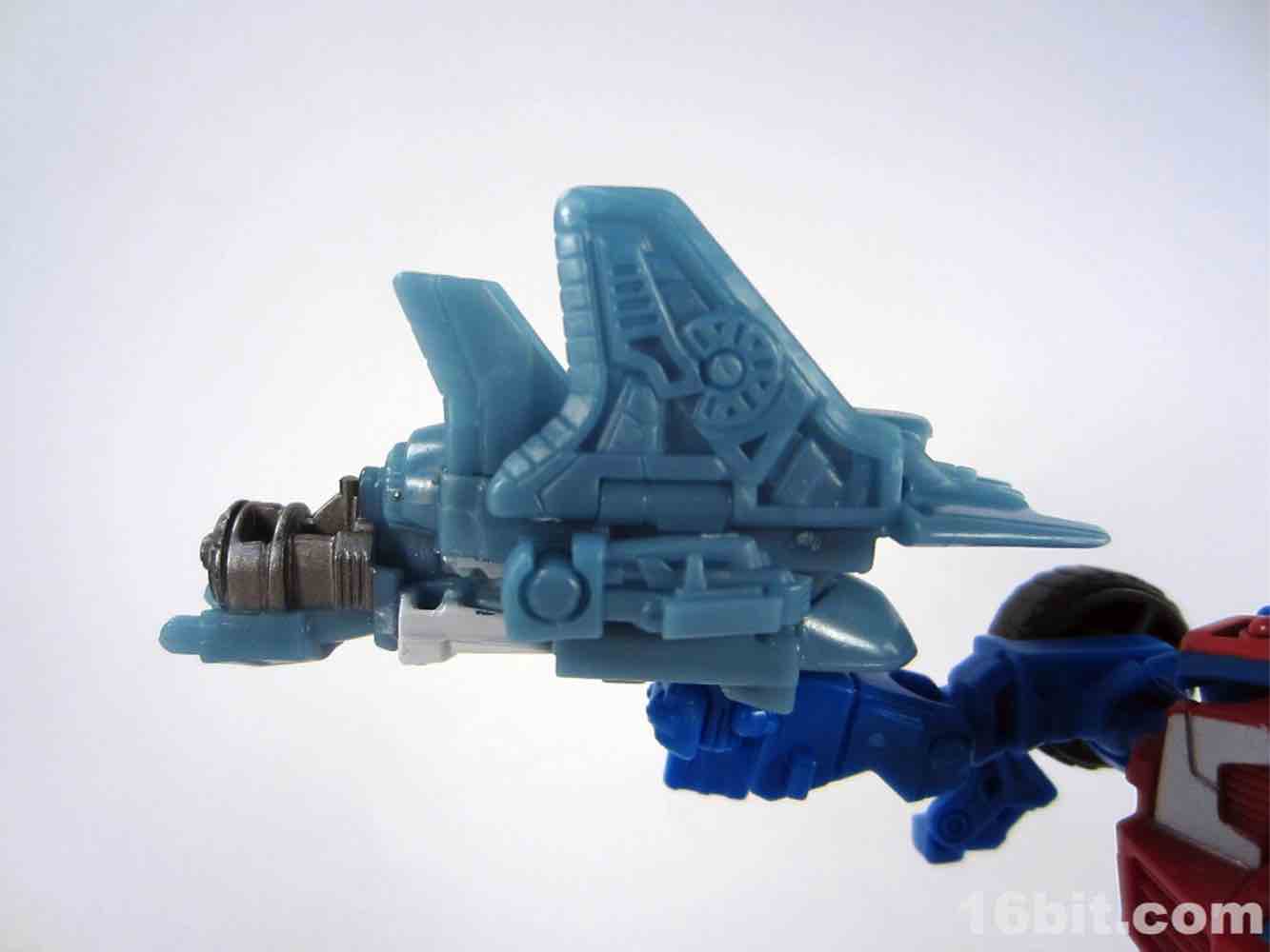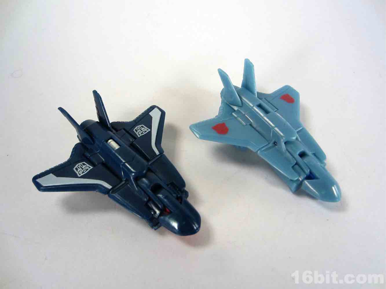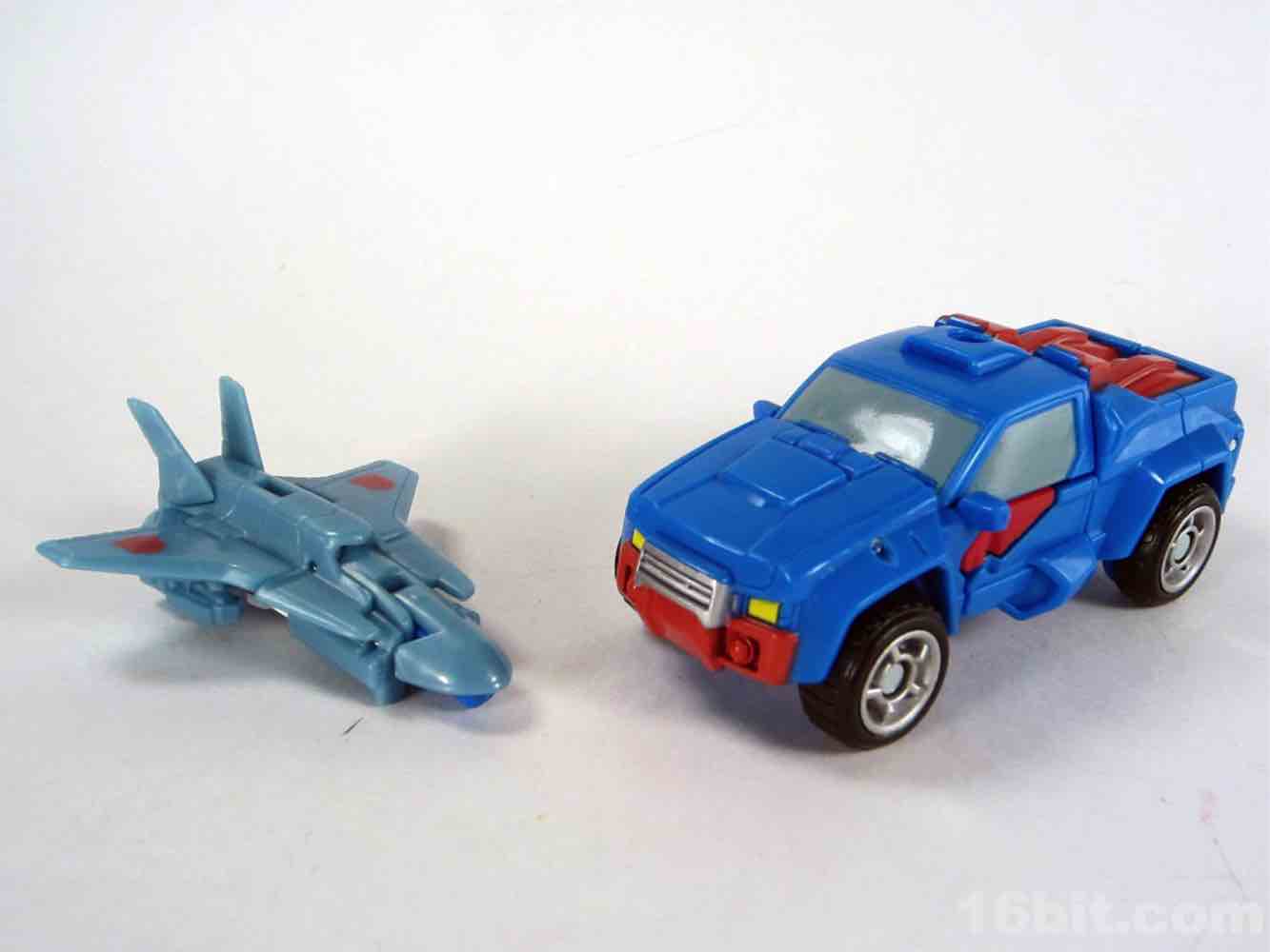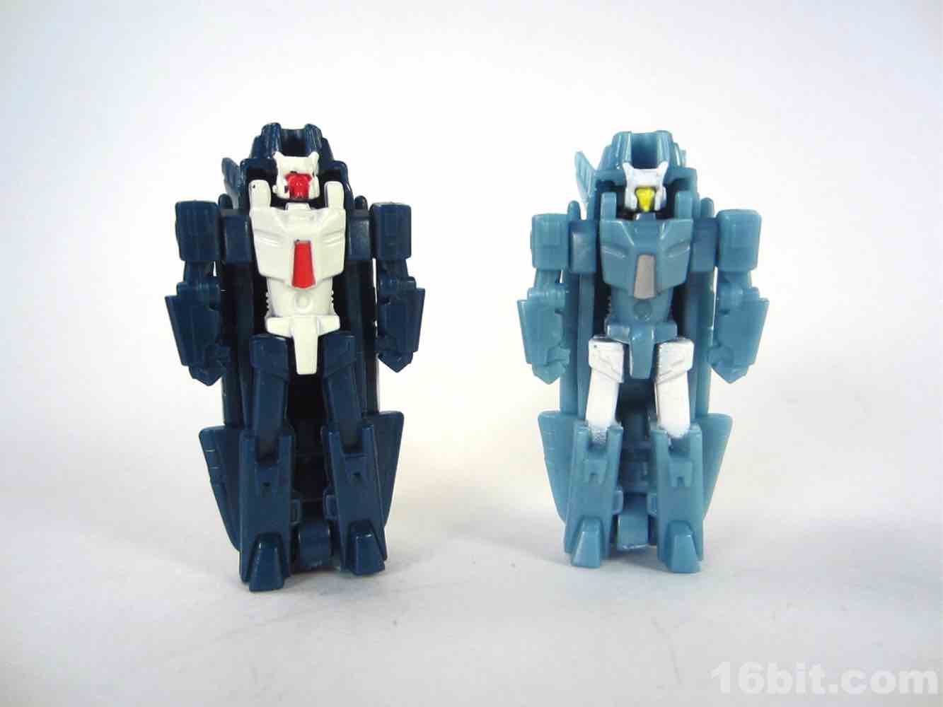 Eclipse is a new take on Micromasters Eagle Eye, and is similar to Swerve's companion Flanker. It's blue, and can triple-change from gun to robot to plane. For such a small toy it's quite sturdy and Hasbro did a wonderful job giving him some personality at this small scale. Granted he isn't going to win any beauty contests, but it's more than just a functional accessory - it's a well-made partner, and we don't get many of those lately. I'm surprised to admit I like Eclipse more - the pale metallic blue is nice, and the paint is cleanly applied. The only real complaint I can make is that the blue drowns out some of the detail on the Autobot symbols on his wings - a white background would have done wonders to make them pop out nicely.