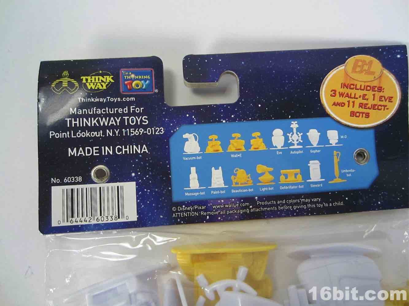 You get 5 robots - 3 takes on Wall-E, plus Vaccum-bot, Eve, Autopilot, Gopher, M-O, Massage-bot, Paint-bot, Beautician-bot, Light-bot, Defibrilator-bot, Steward, and the Umbrella-bot. Note, some of them don't have final names - they're just placeholders. This is not a complete cast of the movie - after all, there's no Burn-E. Still, it's a nice box of cheap toys but they may have more to offer the older fan.