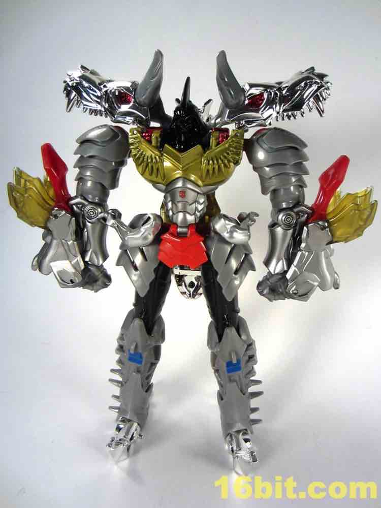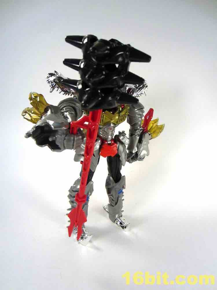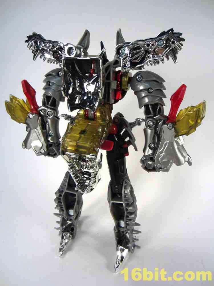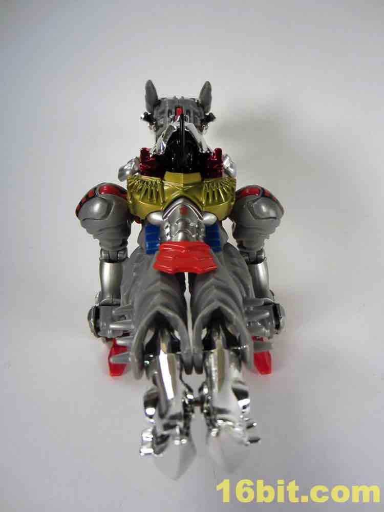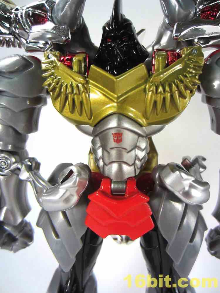 Shoulders have black and red tampos which resemble G1 stickers, and blue squares below the knees look swell. For a token redeco, it's pretty charming - but it really only leaves you hungry for the inevitable redux of Grimlock as an all-new "classics" or "generations" mold at some point in the future. Well, to some extent. As its own thing, it's going to look amazing on your toy shelves. The chrome really brightens the toy up, and while I like it here lots I wouldn't mind if we never saw it again - at this point I'm more worried about longevity in my collection and the flaking of this material.