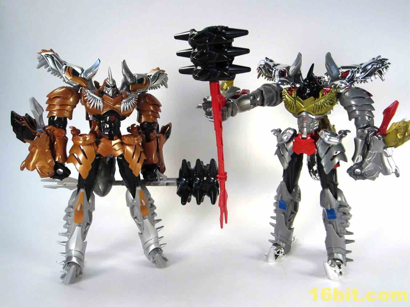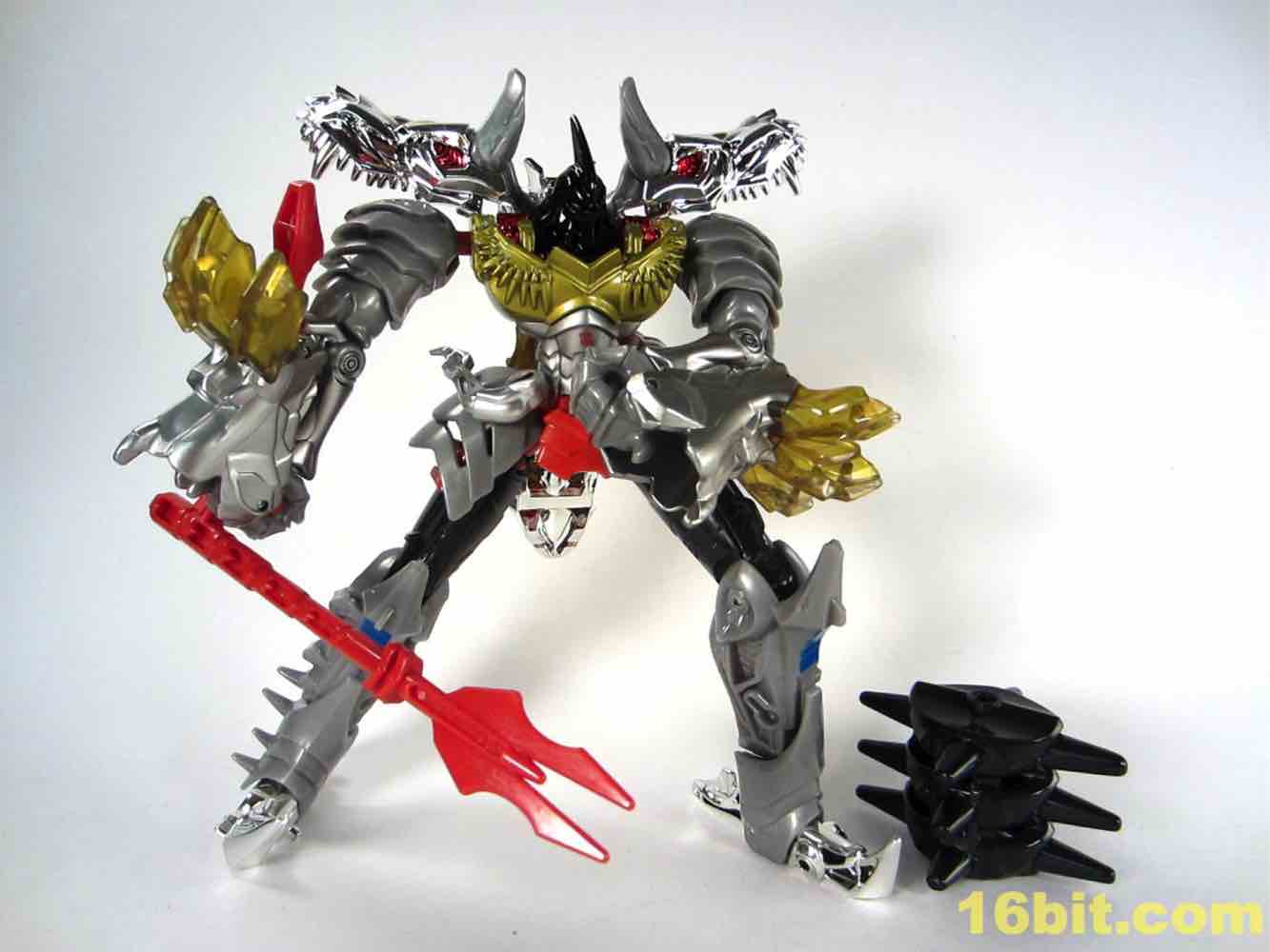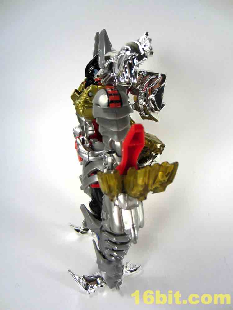 Shoulders have black and red tampos which resemble G1 stickers, and blue squares below the knees look swell. For a token redeco, it's pretty charming - but it really only leaves you hungry for the inevitable redux of Grimlock as an all-new "classics" or "generations" mold at some point in the future. Well, to some extent. As its own thing, it's going to look amazing on your toy shelves. The chrome really brightens the toy up, and while I like it here lots I wouldn't mind if we never saw it again - at this point I'm more worried about longevity in my collection and the flaking of this material.