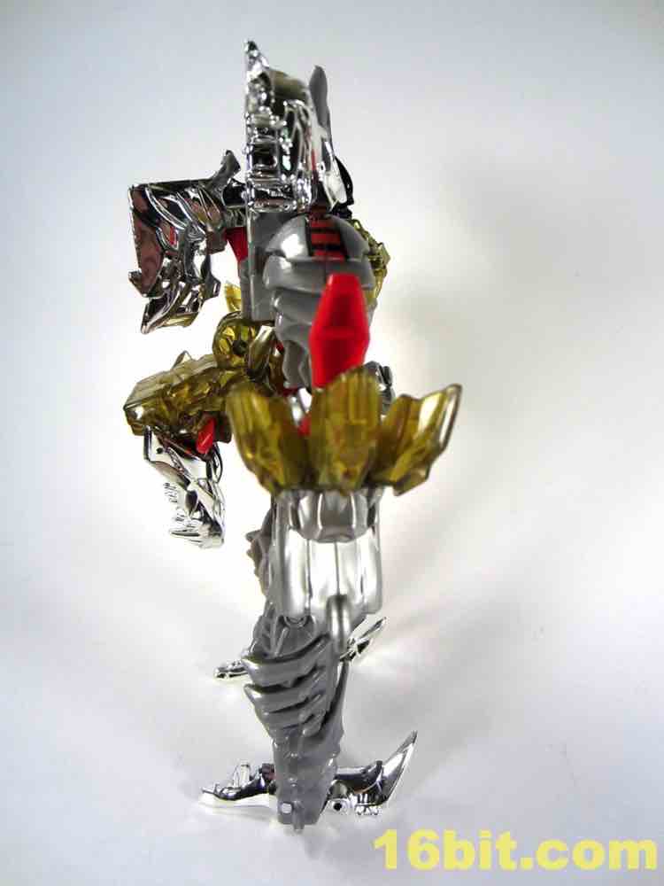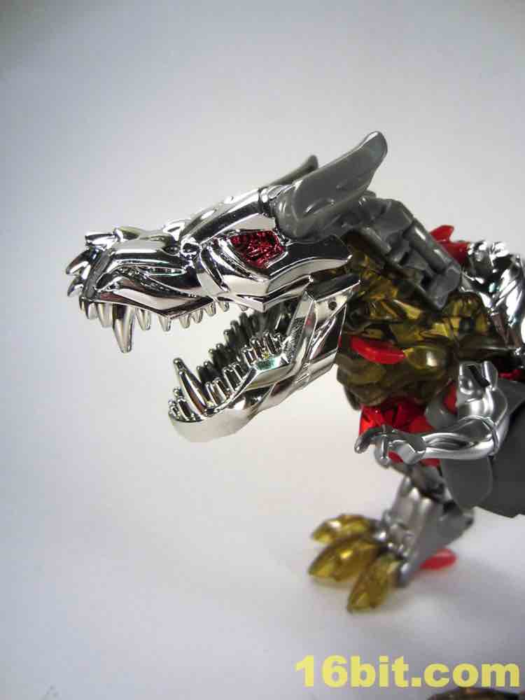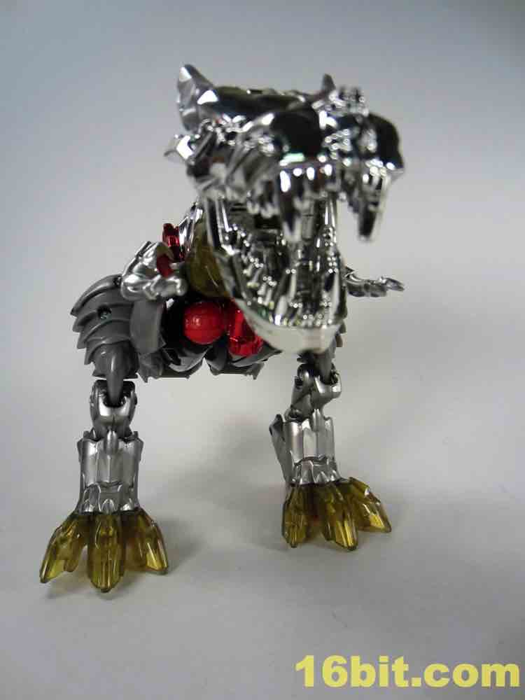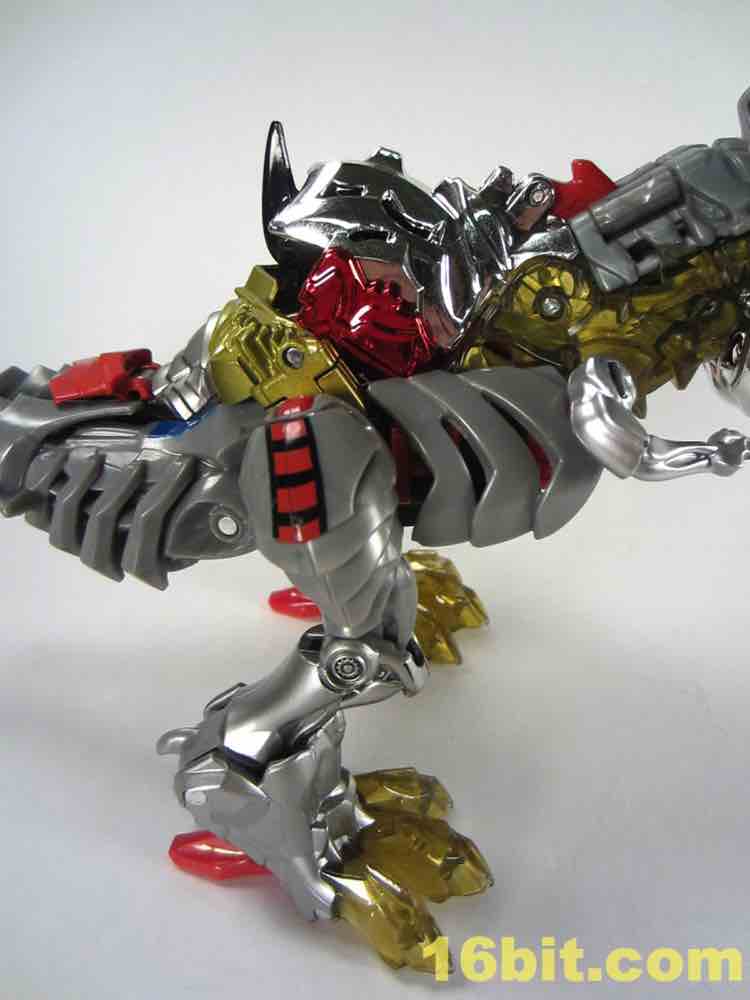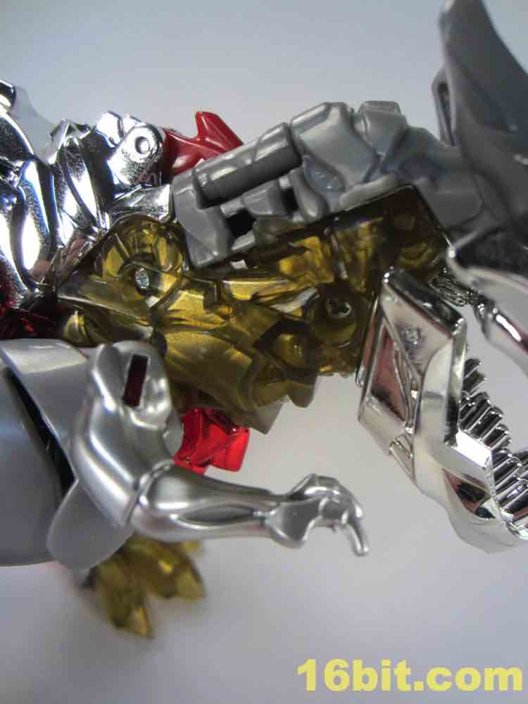One of the most clever - and surprisingly effective - features is in the T-Rex feet. Instead of gold chrome, a clear, murky yellow was deployed and it's shockingly pretty. I want to see more of it - while the red loincloth, well, I could do without that. The red chrome eyes look gorgeous, and the red chrome crotch is probably not going to age well if you ever transform this toy.