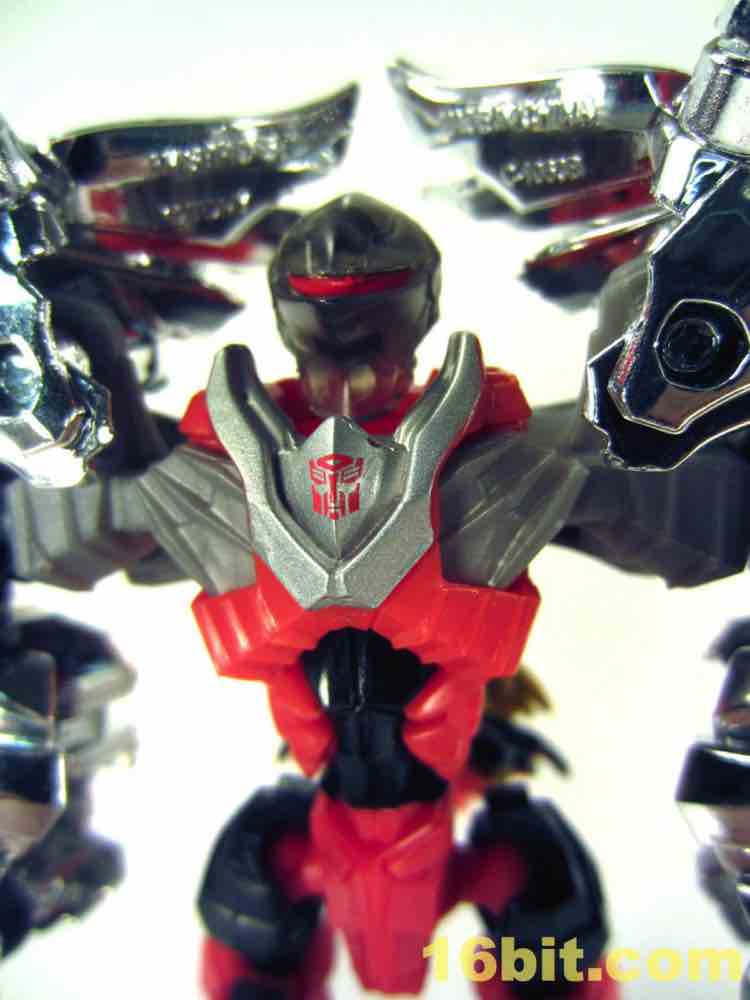 While evocative of the G1 theme, there's little similar to the original toy. You get the silver "bib" with an Autobot symbol, some gold on the feet, and red eyes. You also get a clear smokey head and an absurd quantity of chrome for no good reason. It's neat, sure, but why do it? It's gratuitous... neat, sure, but overkill. It does cause the figure to come a little more alive, though, so you can understand why the designers went for it anyway.