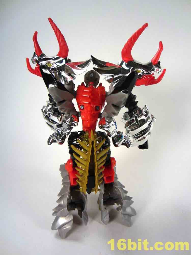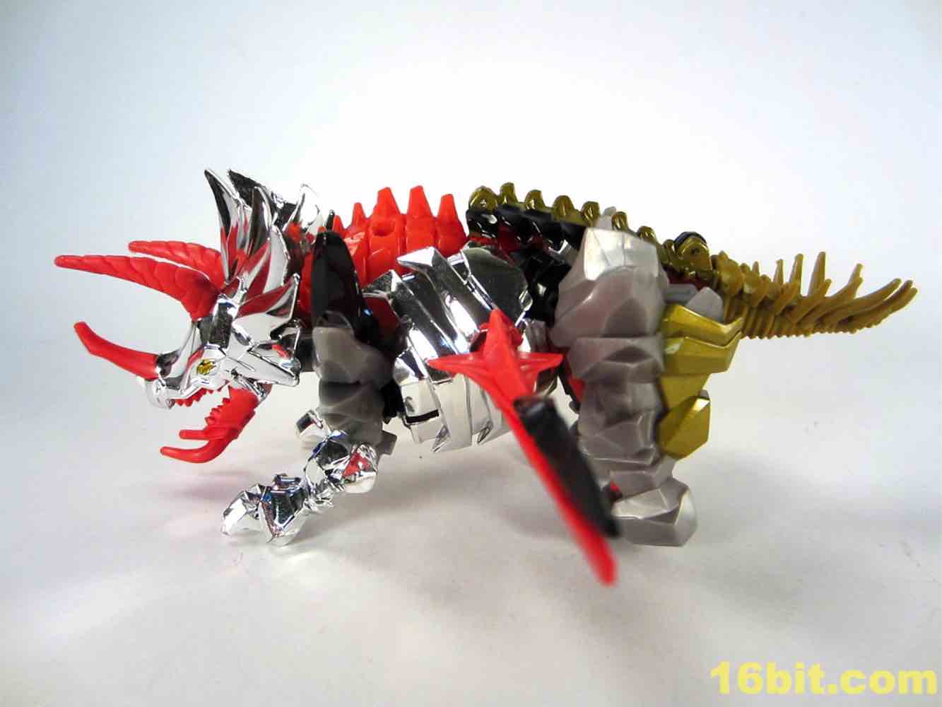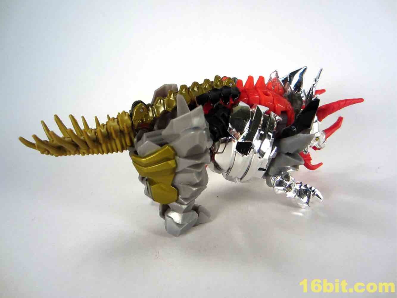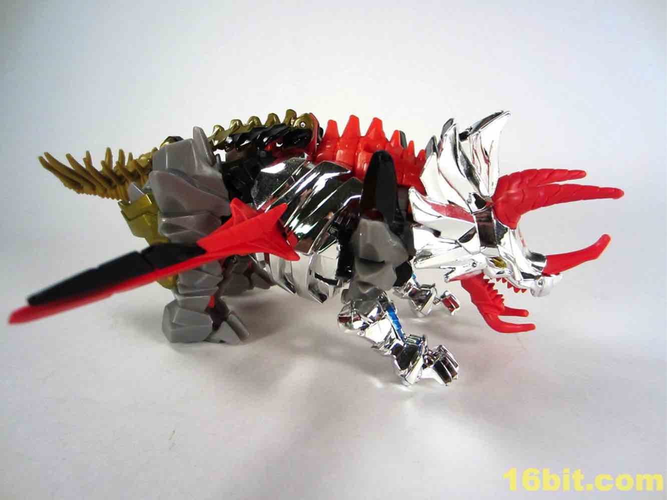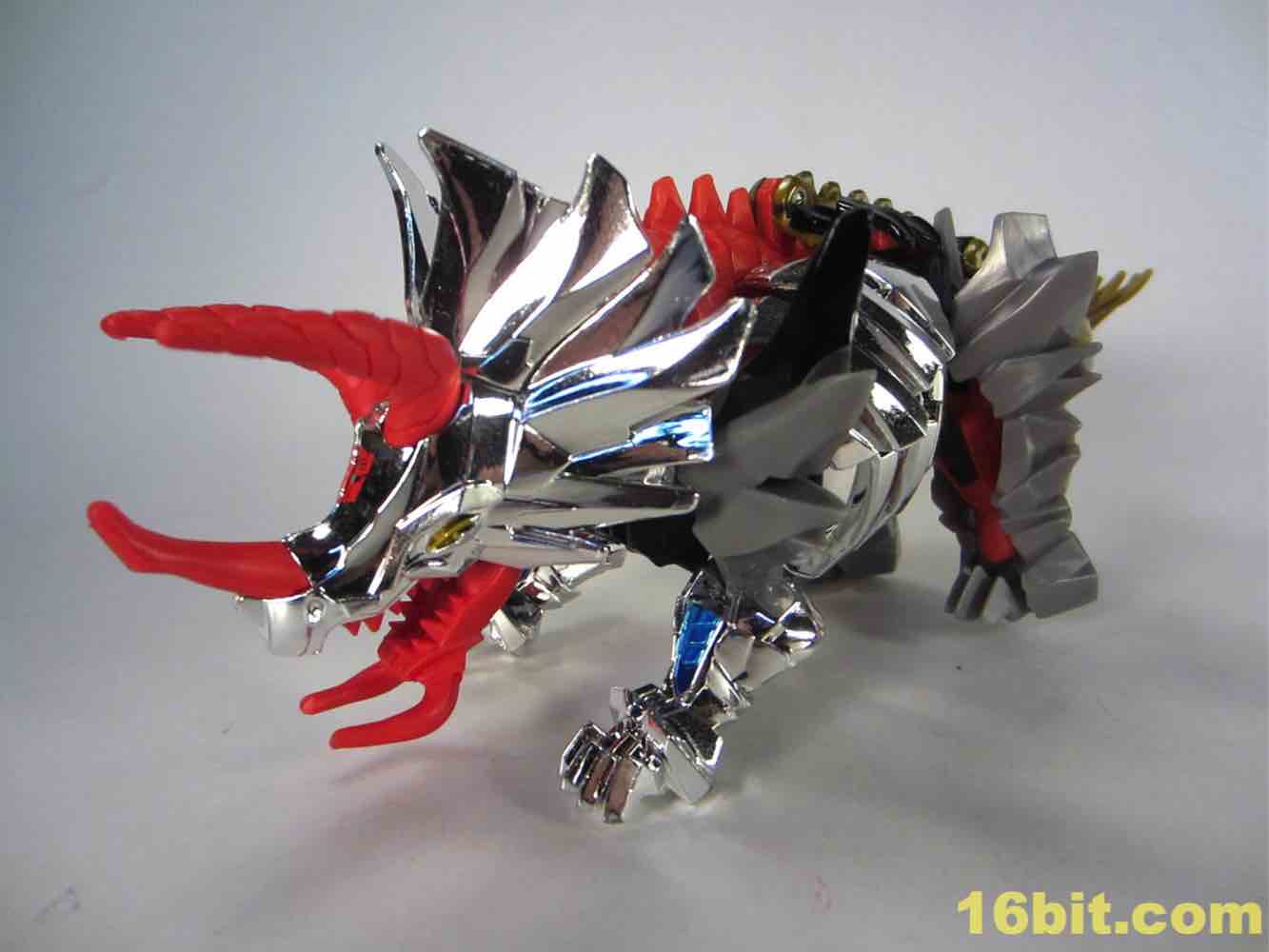 The silver frill and golden tail are present, but the rest of it is a mishmash of new and old parts. Silver forelegs and a dinosaur body to match are unique to this design, as is the red articulated dinosaur jaw. At 7-inches long, this is a decent sized beast. It doesn't have a lot of visible tampos like Grimlock that evoke stickers beyond the Autobot sigil on his head - other than that, it's basically a mutated triceratops with a spiny tail.