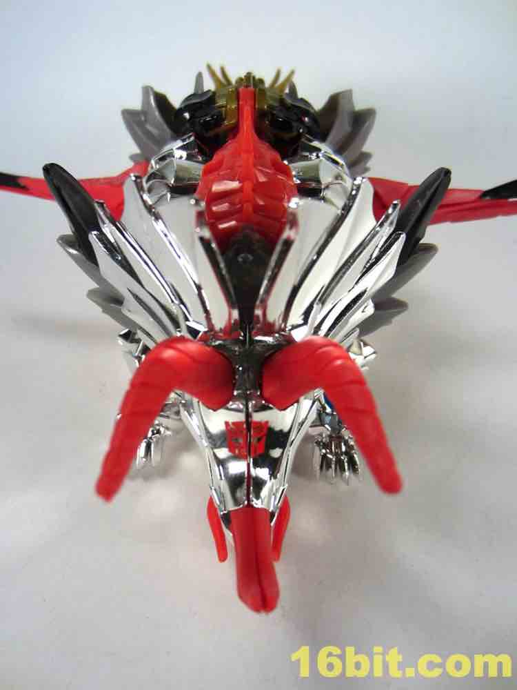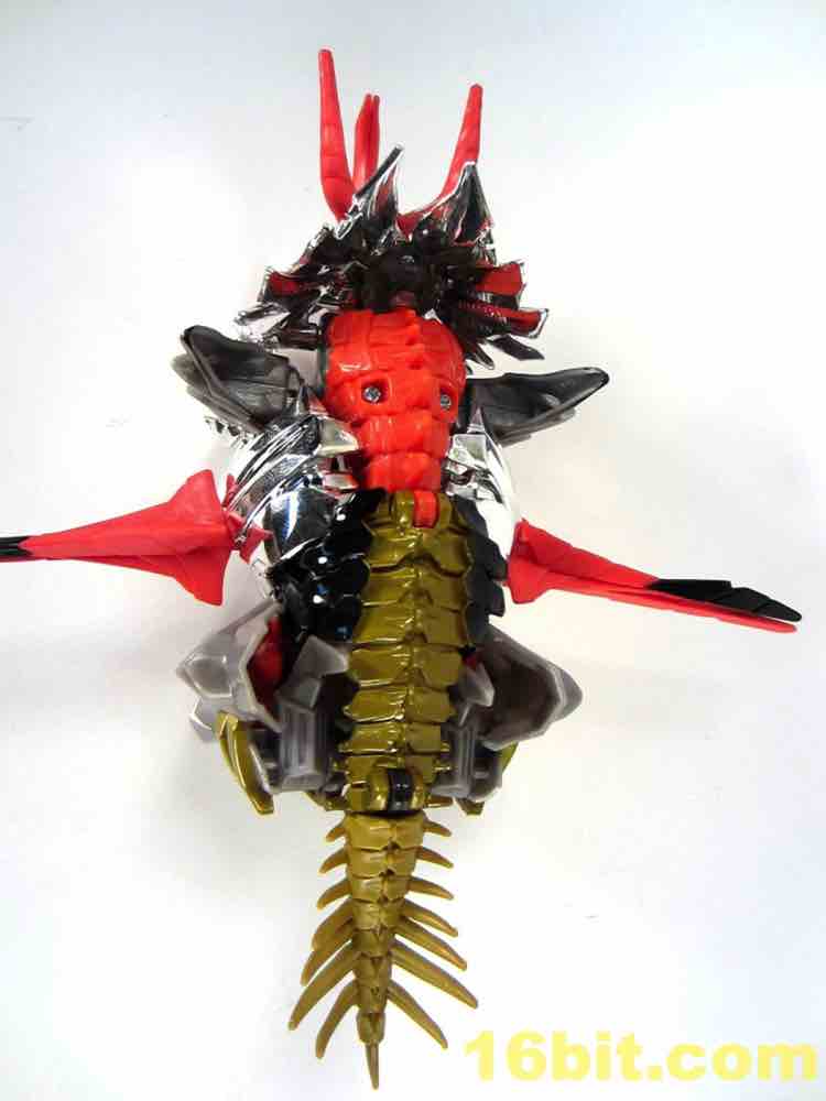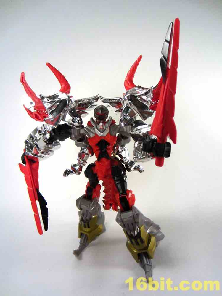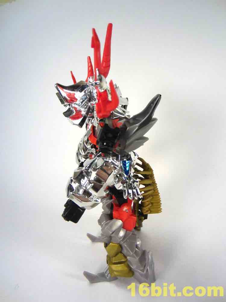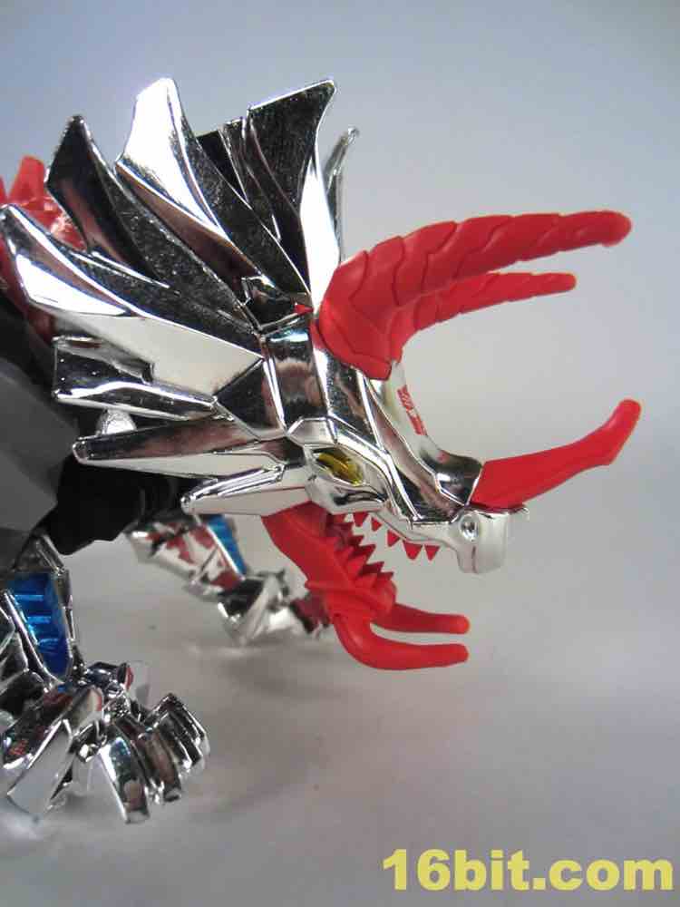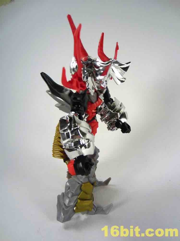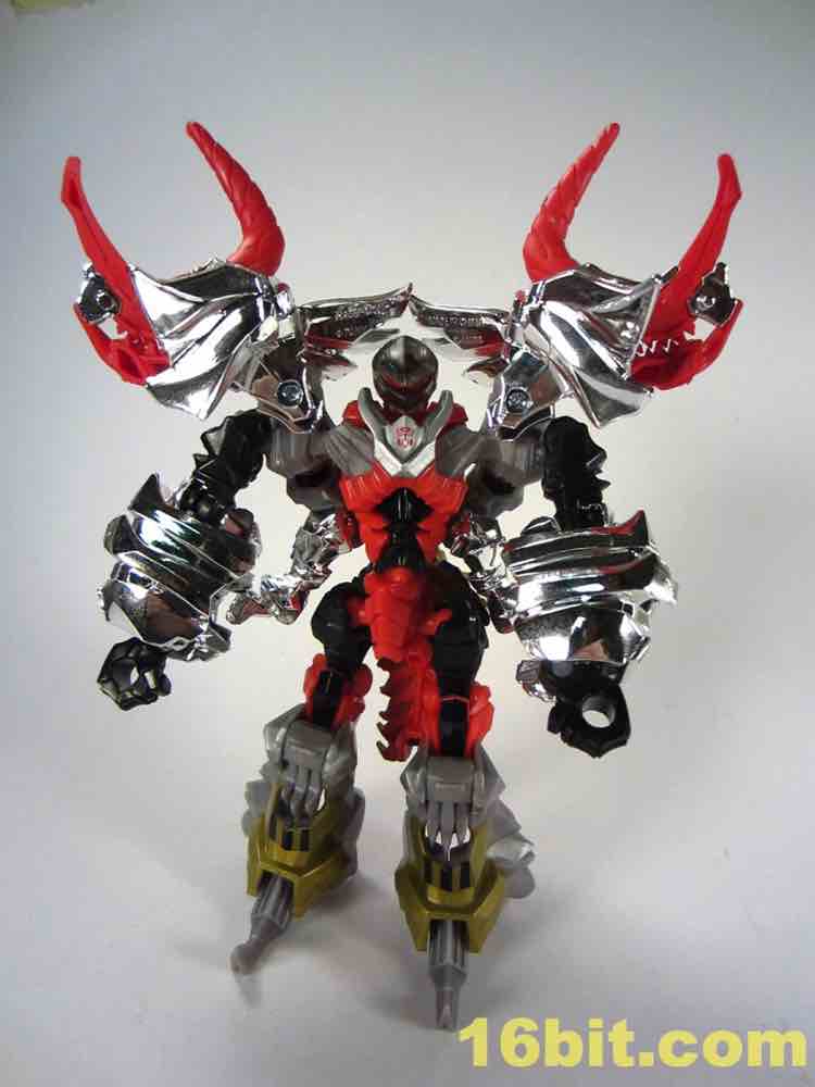 The silver frill and golden tail are present, but the rest of it is a mishmash of new and old parts. Silver forelegs and a dinosaur body to match are unique to this design, as is the red articulated dinosaur jaw. At 7-inches long, this is a decent sized beast. It doesn't have a lot of visible tampos like Grimlock that evoke stickers beyond the Autobot sigil on his head - other than that, it's basically a mutated triceratops with a spiny tail.