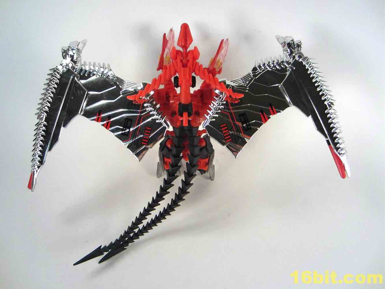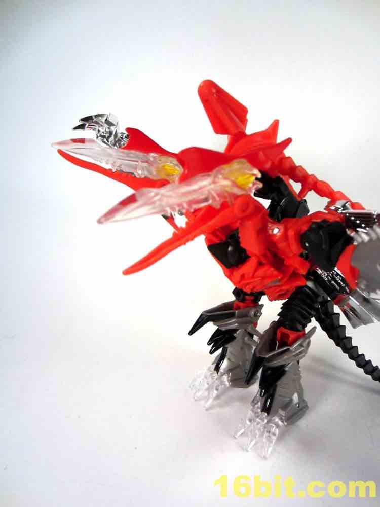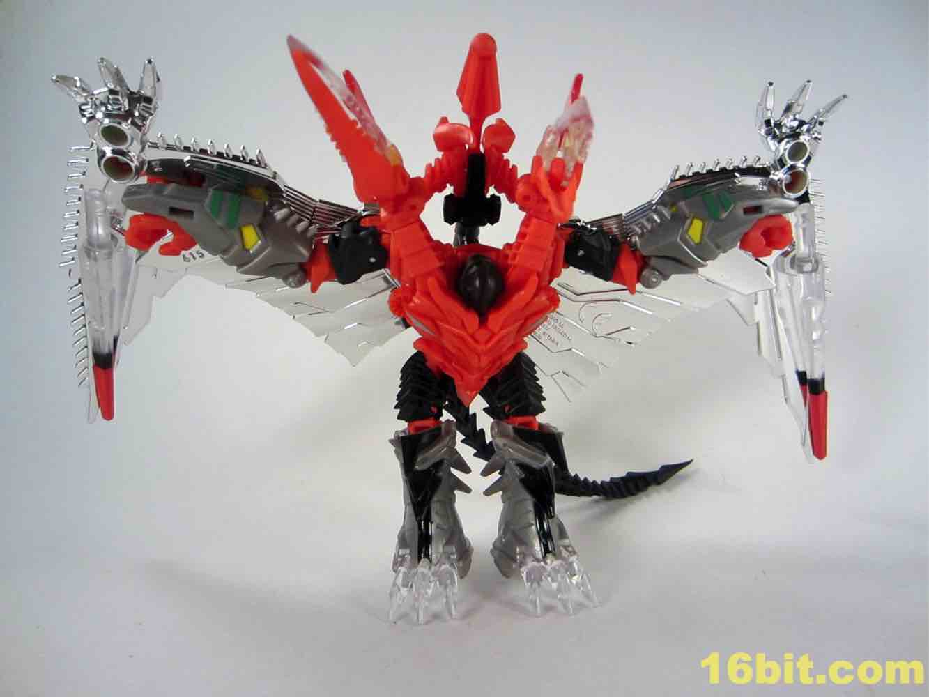 Transformation is the same as Deluxe Strafe, and fits together surprisingly easy given the chrome and clear parts. I'm impressed - basically flip out the feet and wings, move around the 3 heads, and you're mostly done. It's easy - the easiest in the set by far.