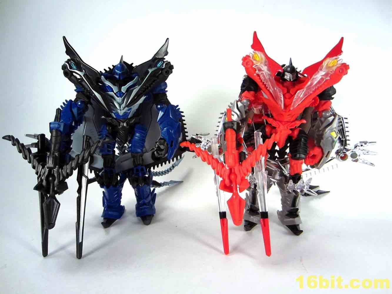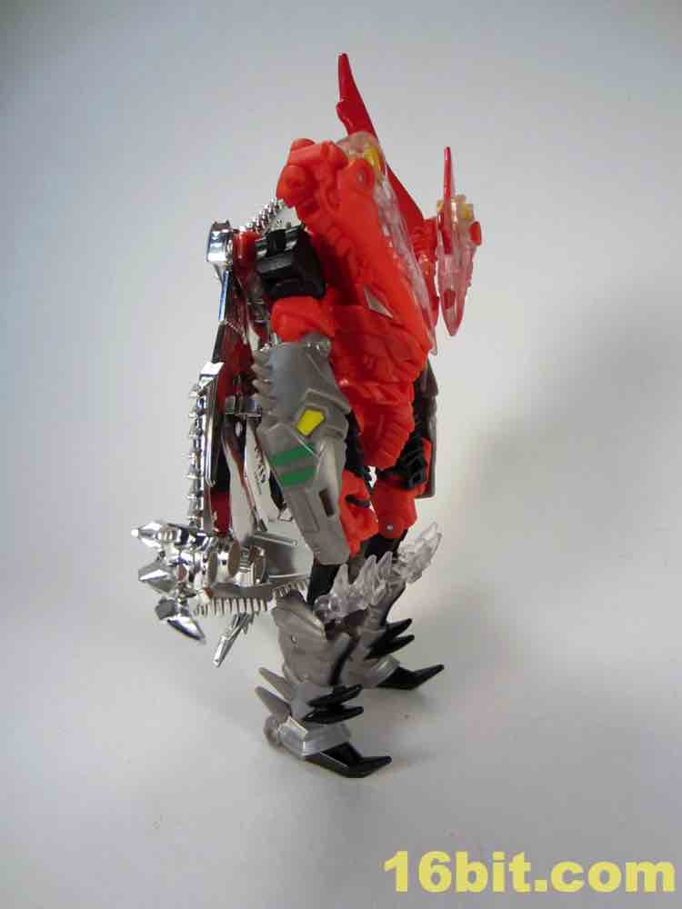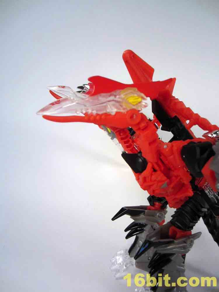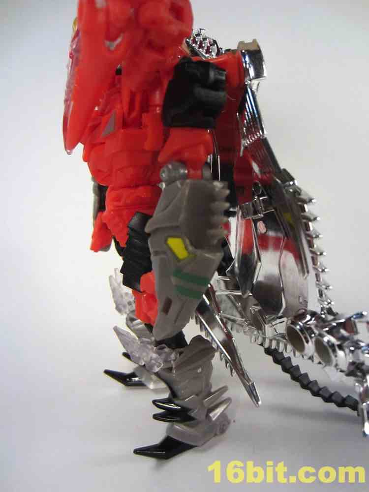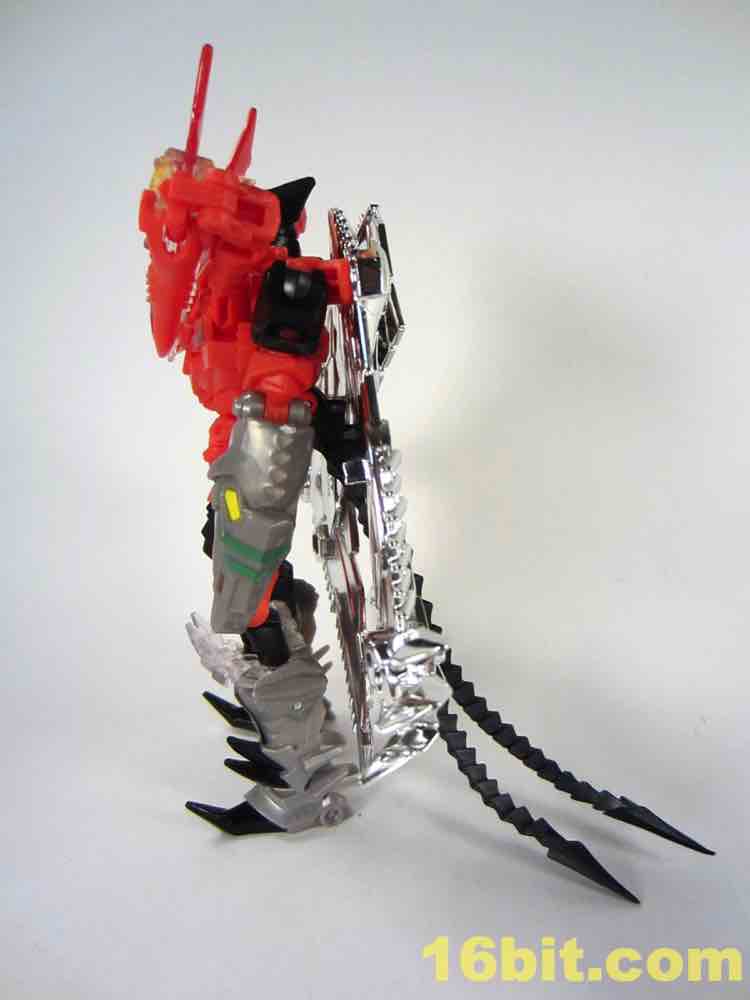 The robot looks pretty great - similarly colored to the original toy, the head has silver eyes and feels kind of dull in the head. The dino mode certainly wins for personality, but the colors of the "decals" on the arms do much to bring him to life. Articulation is acceptable, but when you get right down to it these are going to be display pieces first and foremost. It can stand and hold his combining weapons just fine, but my preference swings toward the creature mode. There's nothing wrong with the robot mode - there's a lot of red on the chest and nifty hidden feet - but the two-headed creature seems more chatty, for lack of a better word. I get the feeling he might have more to say.