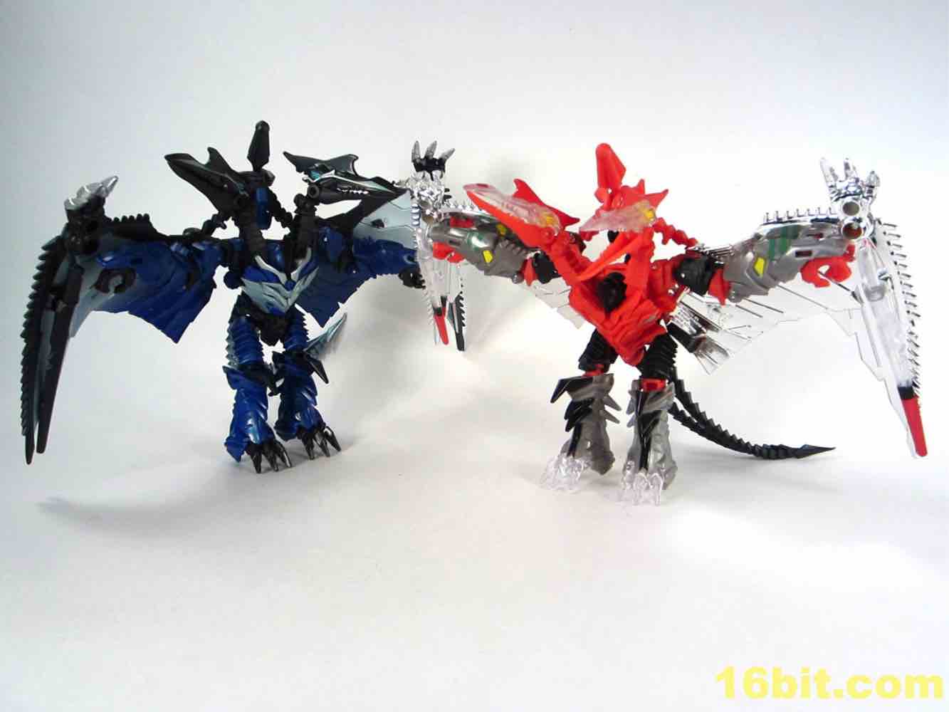 While the original toy had a clear dinosaur head, here it seems to stand out even more - each one has a red crest and jaw, just like the original. It has an Autobot symbol on each snout, just like the original. It also has yellow robot eyes, just like the original - but they're sloppier here. I quite like the faux decals on the chrome wings, but I'm not crazy about the clear dinosaur mode toes. The creature mode is quite charming, and feels a lot more like an older toy thanks to little green and yellow shapes painted on the arms inside the wings.