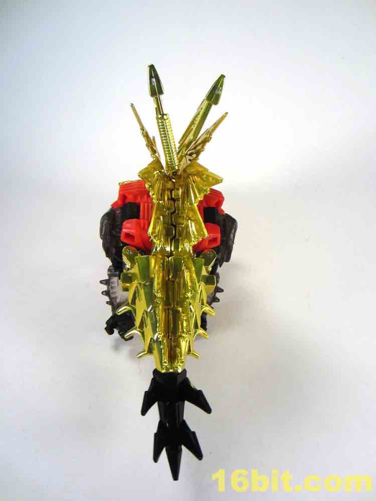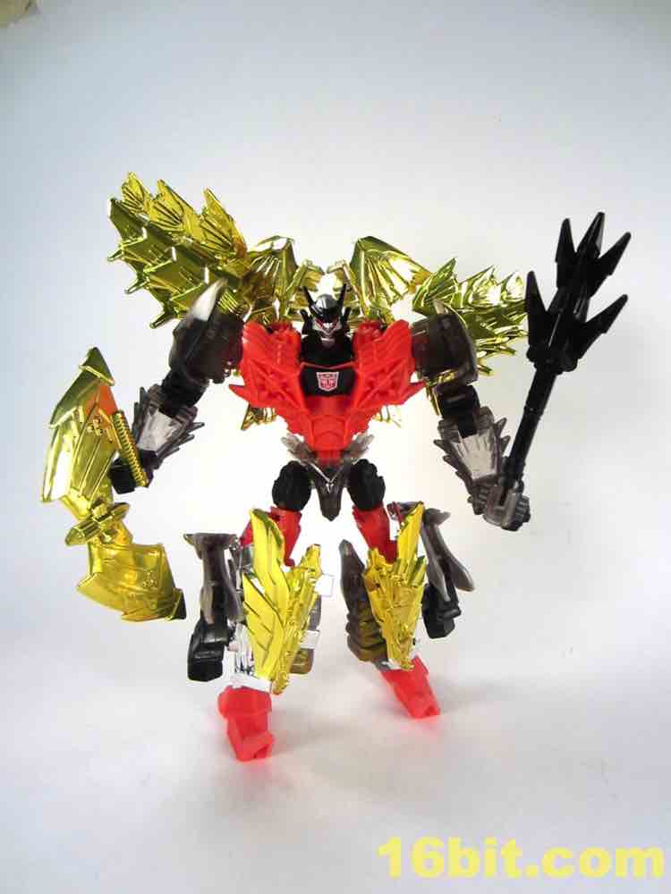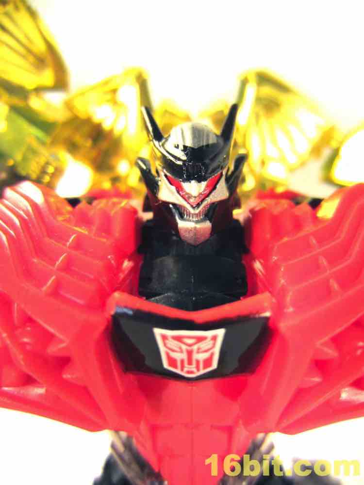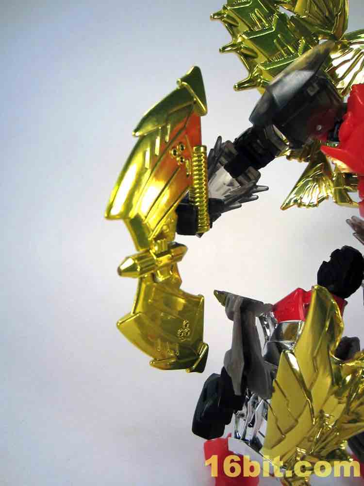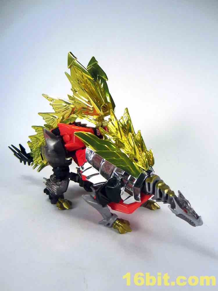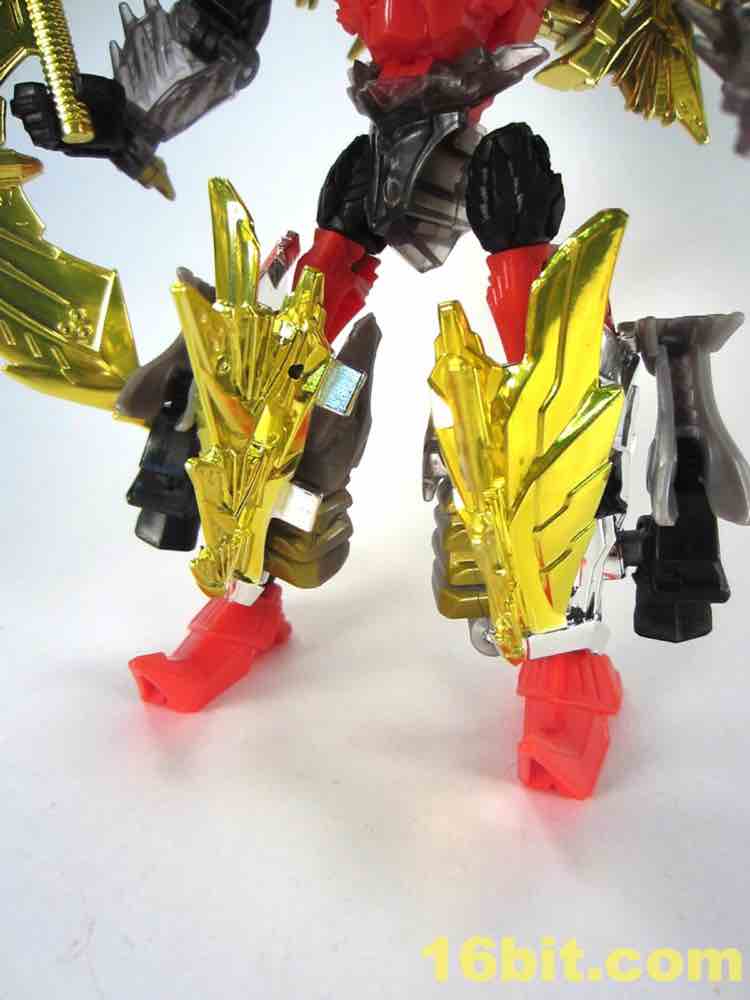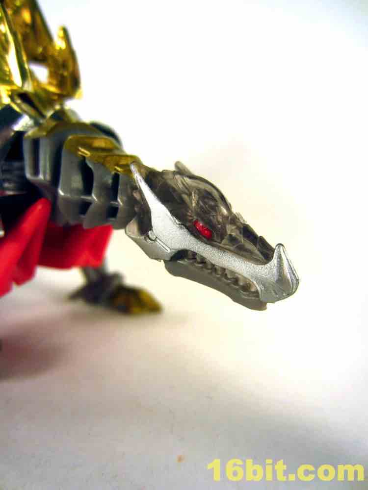 The dinosaur mode looks a lot like his namesake - gold plates, (mostly) gold tail, red eyes, clear head, and red hips with splashes of grey mixed in for good measure. I particularly like the new head and how it departs from the original's clear plastic with a gold interior. This one is smokey clear plastic with red eyes and a silver mouth, articulated to move if you're so inclined. It looks mean, and has a lot of wonderful personality. Along with Strafe, this is one of the better beast heads in this line. The silver swoosh on the head gives the figure a sort of a late 1980s look, while the green version in the main line has a silver snout and doesn't seem to be of any specific school of design.