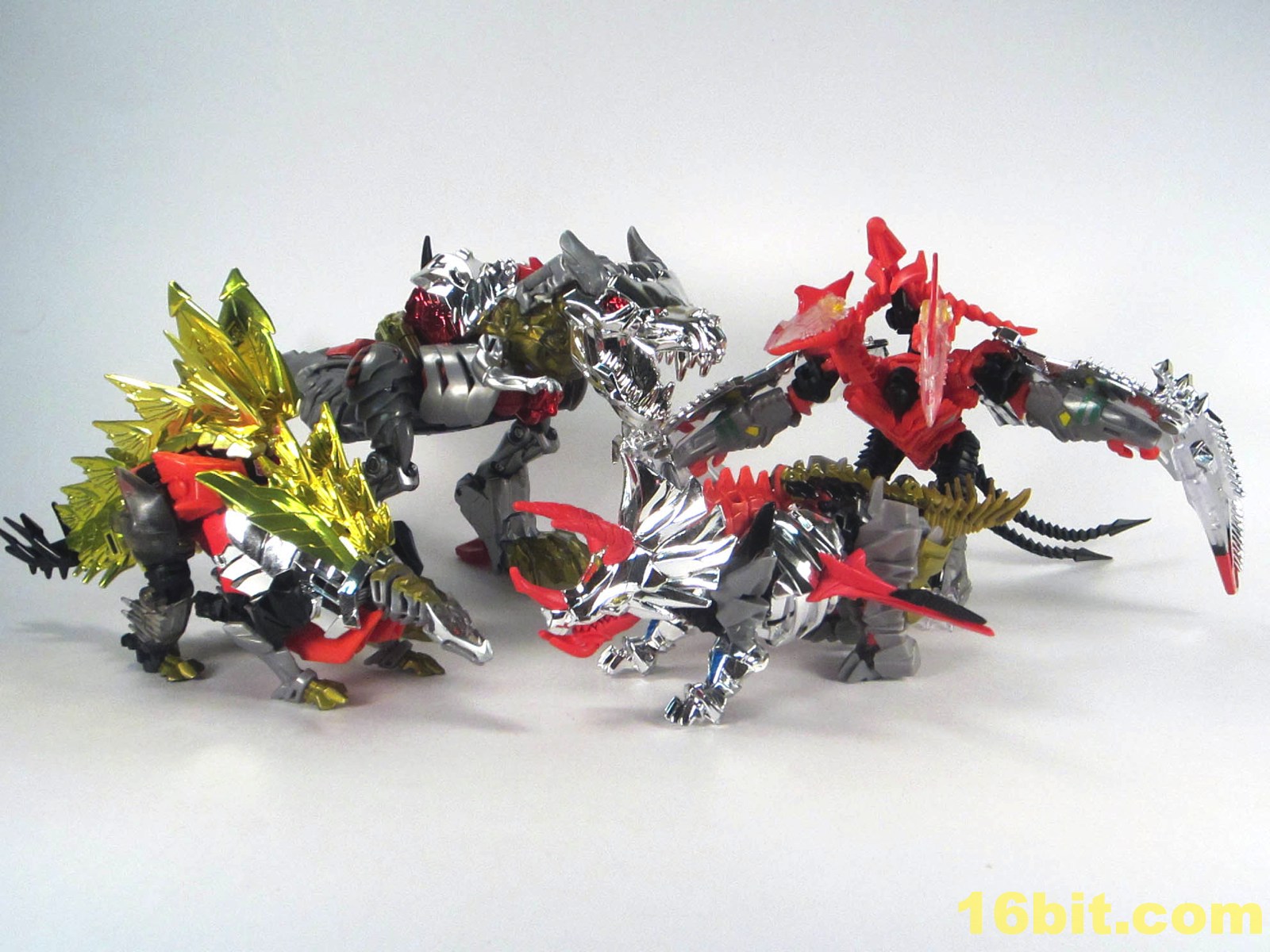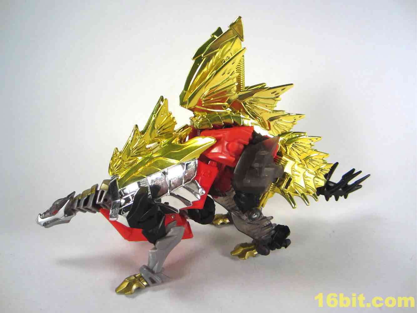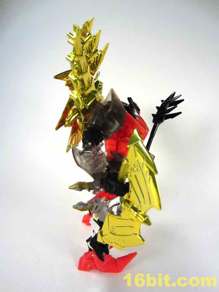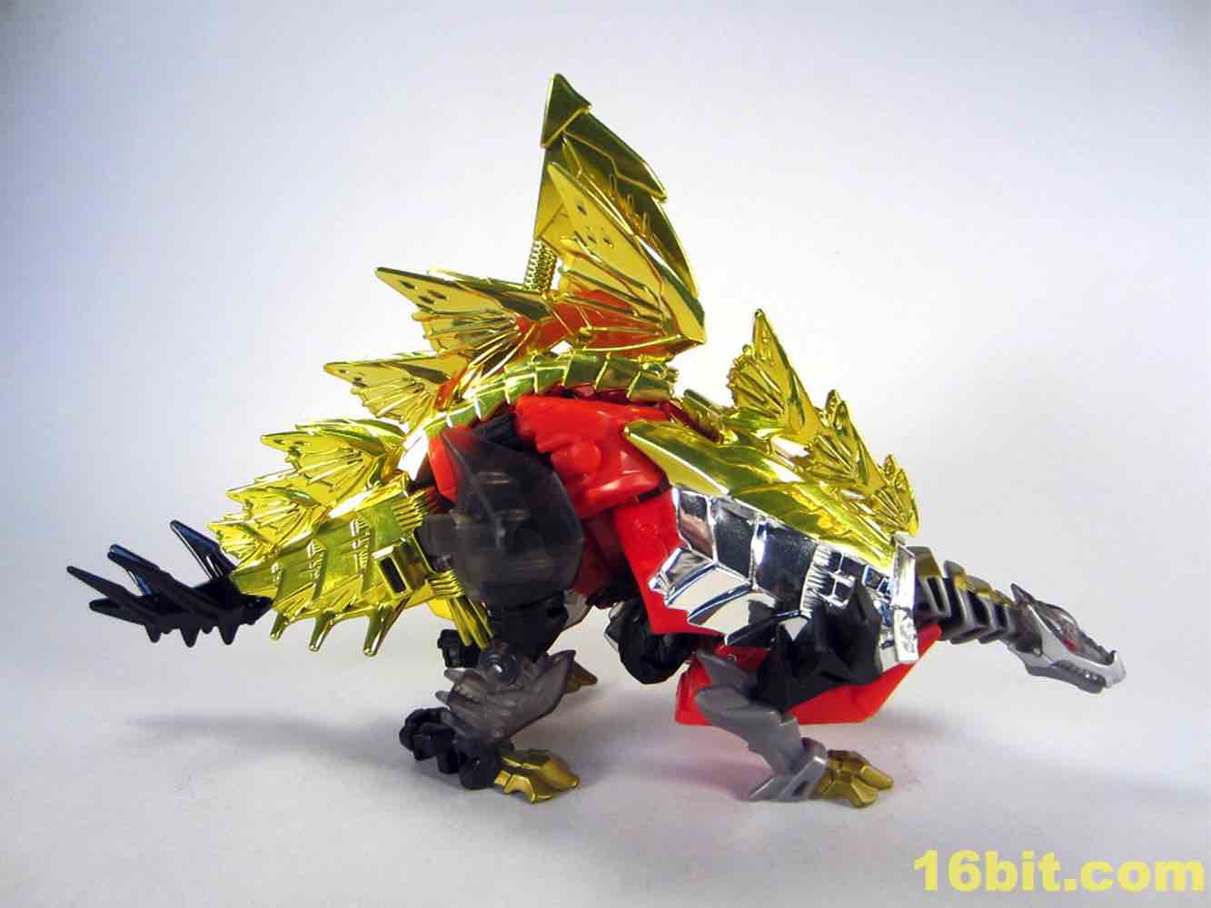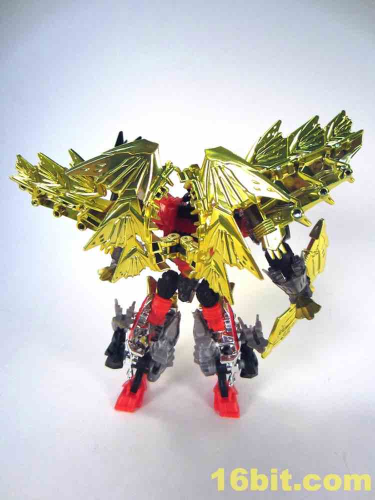 The dinosaur mode looks a lot like his namesake - gold plates, (mostly) gold tail, red eyes, clear head, and red hips with splashes of grey mixed in for good measure. I particularly like the new head and how it departs from the original's clear plastic with a gold interior. This one is smokey clear plastic with red eyes and a silver mouth, articulated to move if you're so inclined. It looks mean, and has a lot of wonderful personality. Along with Strafe, this is one of the better beast heads in this line. The silver swoosh on the head gives the figure a sort of a late 1980s look, while the green version in the main line has a silver snout and doesn't seem to be of any specific school of design.