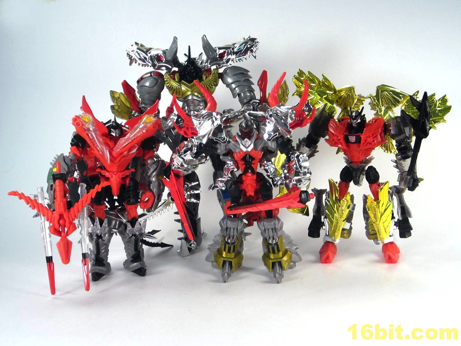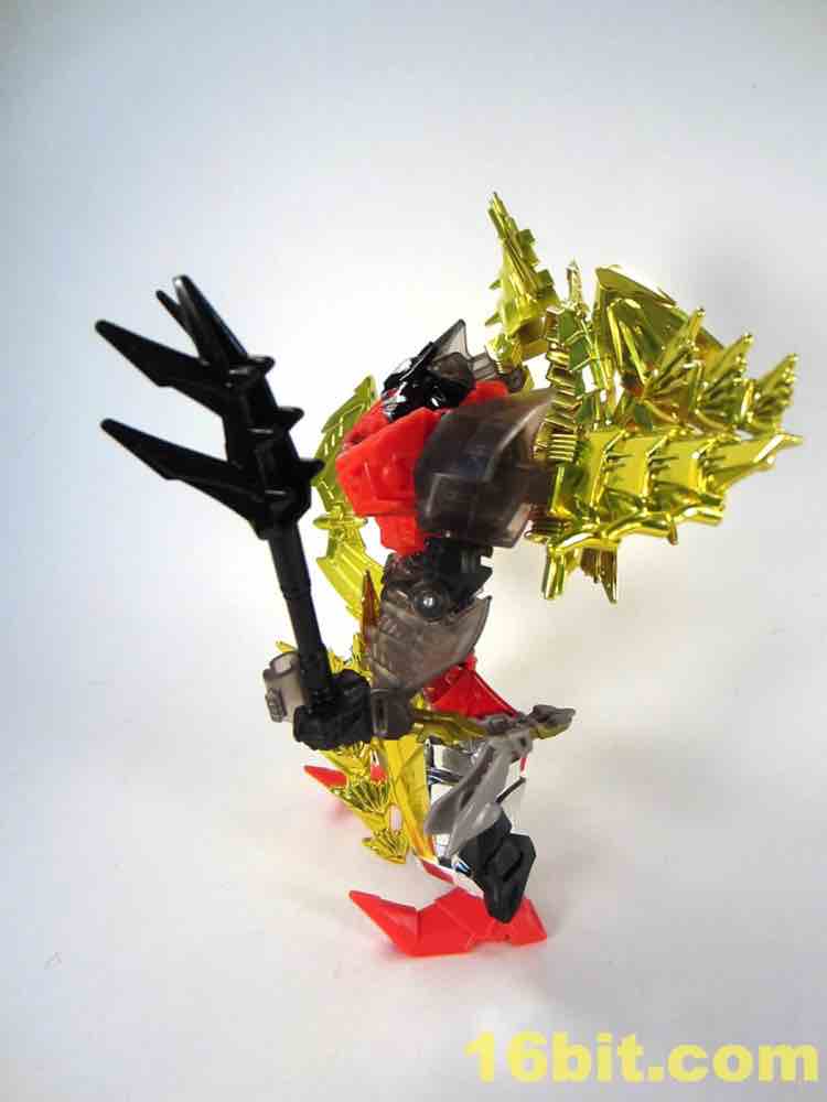 The robot looks good, but plays rough. Like Grimlock and the others, the elbows are weird - it's not quite designed to be posed, the way each part moves leaves other elements looking strange. The curly-toed shoes are back, and there's a lot of gold and red on display here. The head is quite nice if a little freaky - you can make out teeth in his silver-painted face. The red eyes and silver cap on his head are a nice touch, but overall I think I prefer the dinosaur mode.