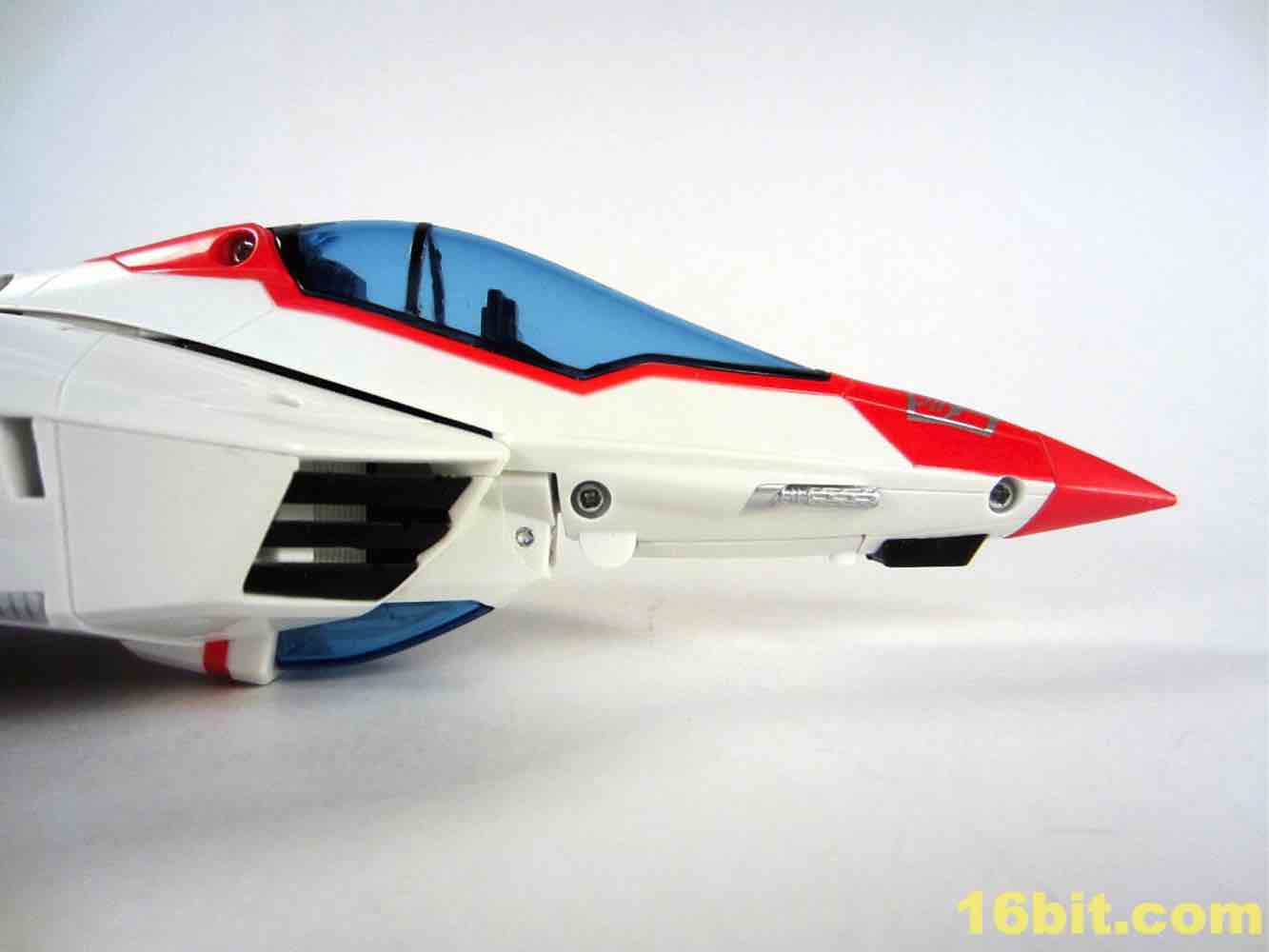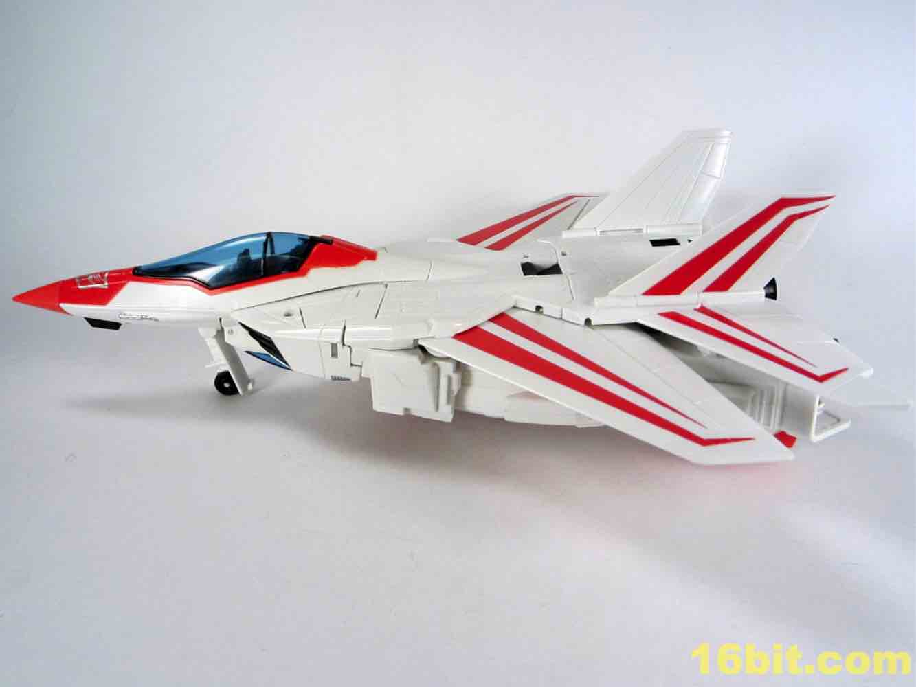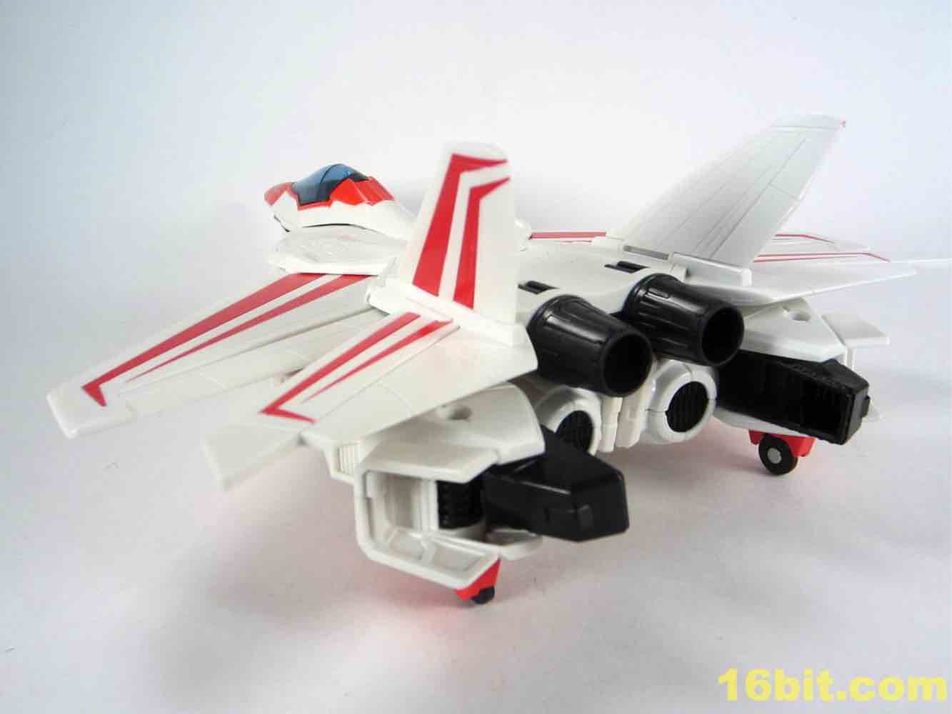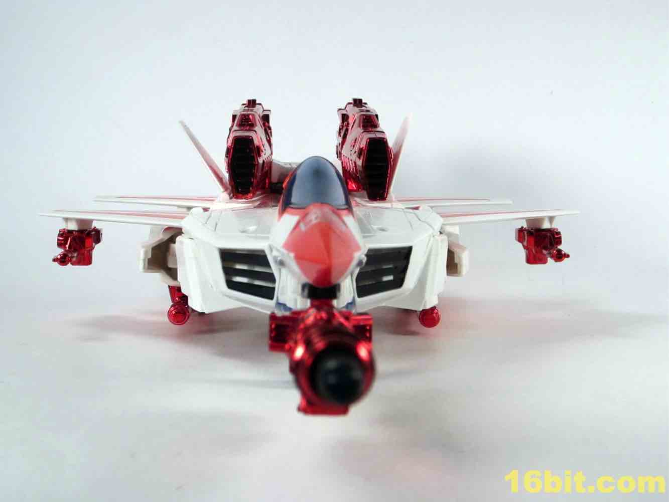 The not-Veritech mode is quite nice. You get stable landing gear with rolling wheels that actually roll quite well - even the cars can't always boast that! The guns mount in a number of places, and you can leave all of them save for the Photon Blaster in place from robot mode if you like. The blaster mounts under the nose cone easily. Like other versions of the toy, the wings can move a little bit. Unlike other ones, it's a little bland - mostly white, with a little red and a lone Autobrand on the nosecone. It's in a silver-backed paint so it looks gorgeous, but it's hard to look at this toy and not say "I could use some Reprolabels."