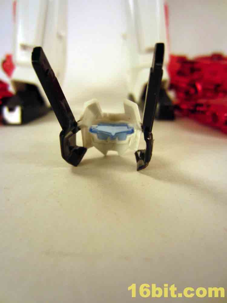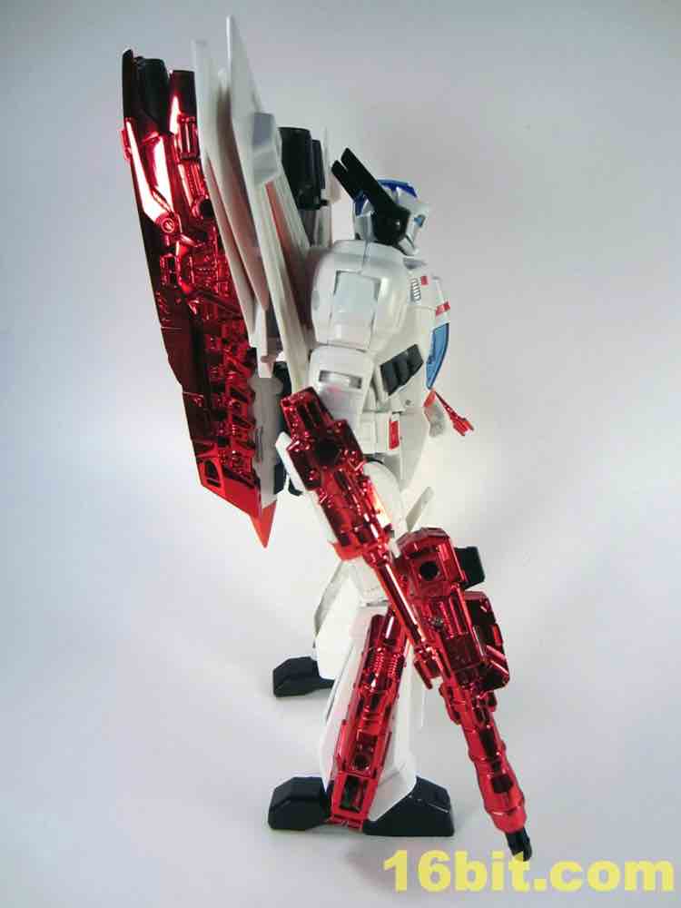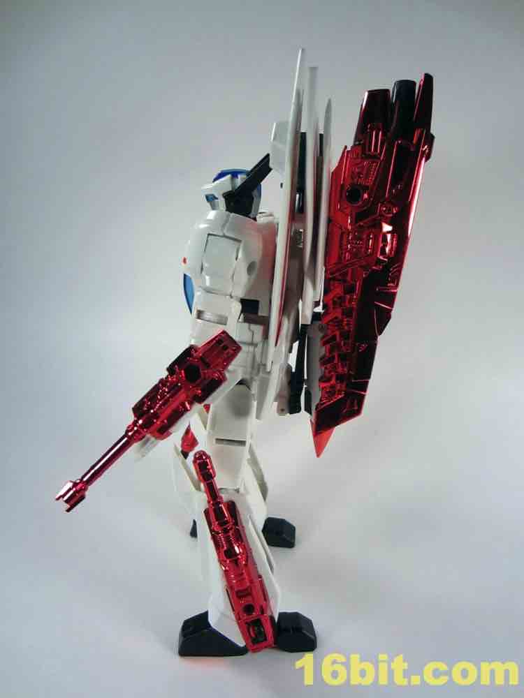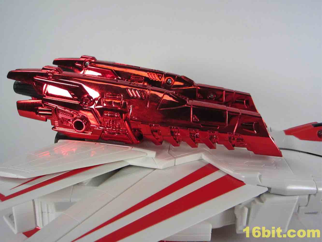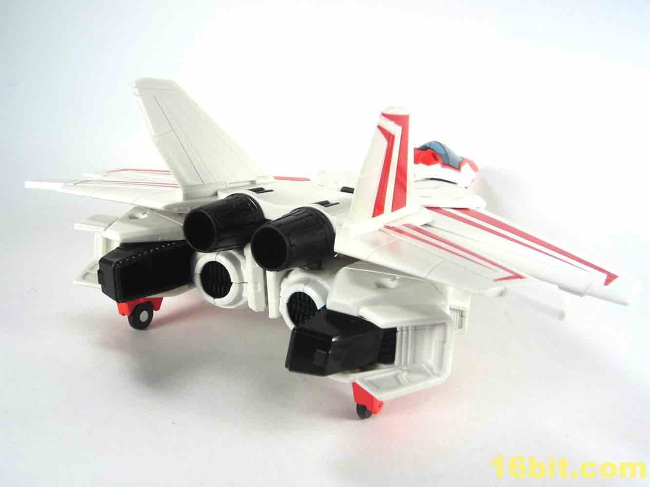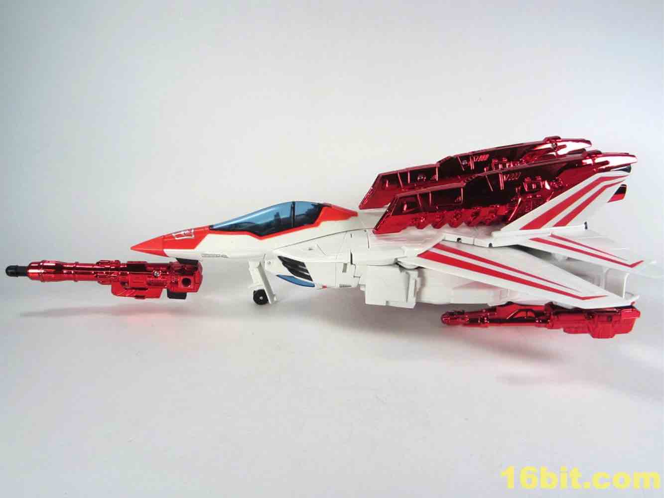 The not-Veritech mode is quite nice. You get stable landing gear with rolling wheels that actually roll quite well - even the cars can't always boast that! The guns mount in a number of places, and you can leave all of them save for the Photon Blaster in place from robot mode if you like. The blaster mounts under the nose cone easily. Like other versions of the toy, the wings can move a little bit. Unlike other ones, it's a little bland - mostly white, with a little red and a lone Autobrand on the nosecone. It's in a silver-backed paint so it looks gorgeous, but it's hard to look at this toy and not say "I could use some Reprolabels."