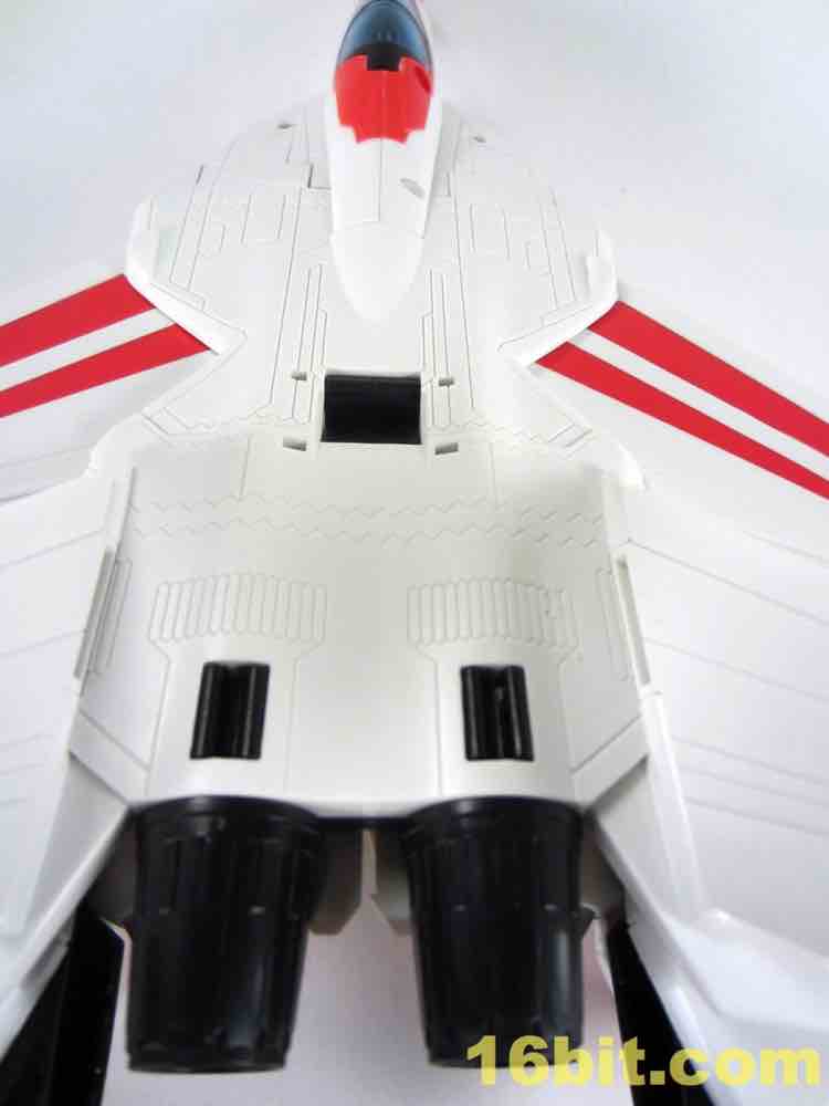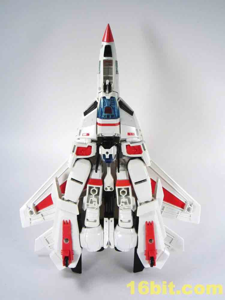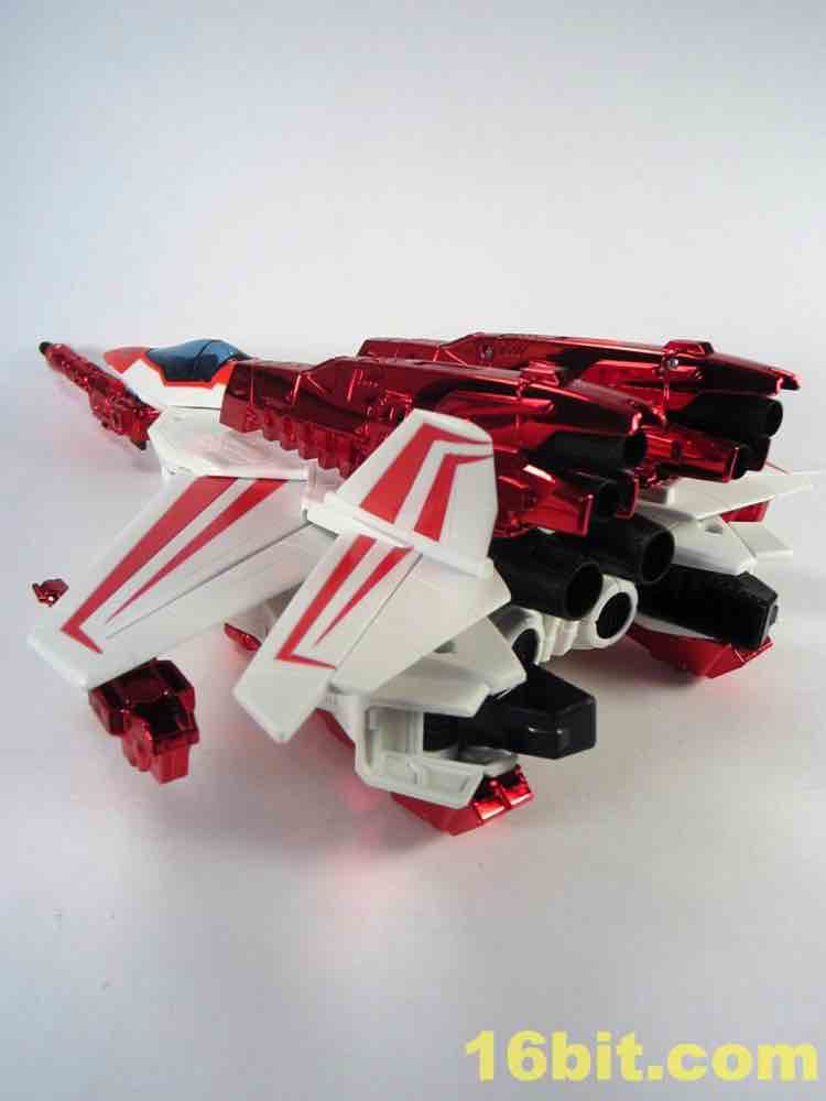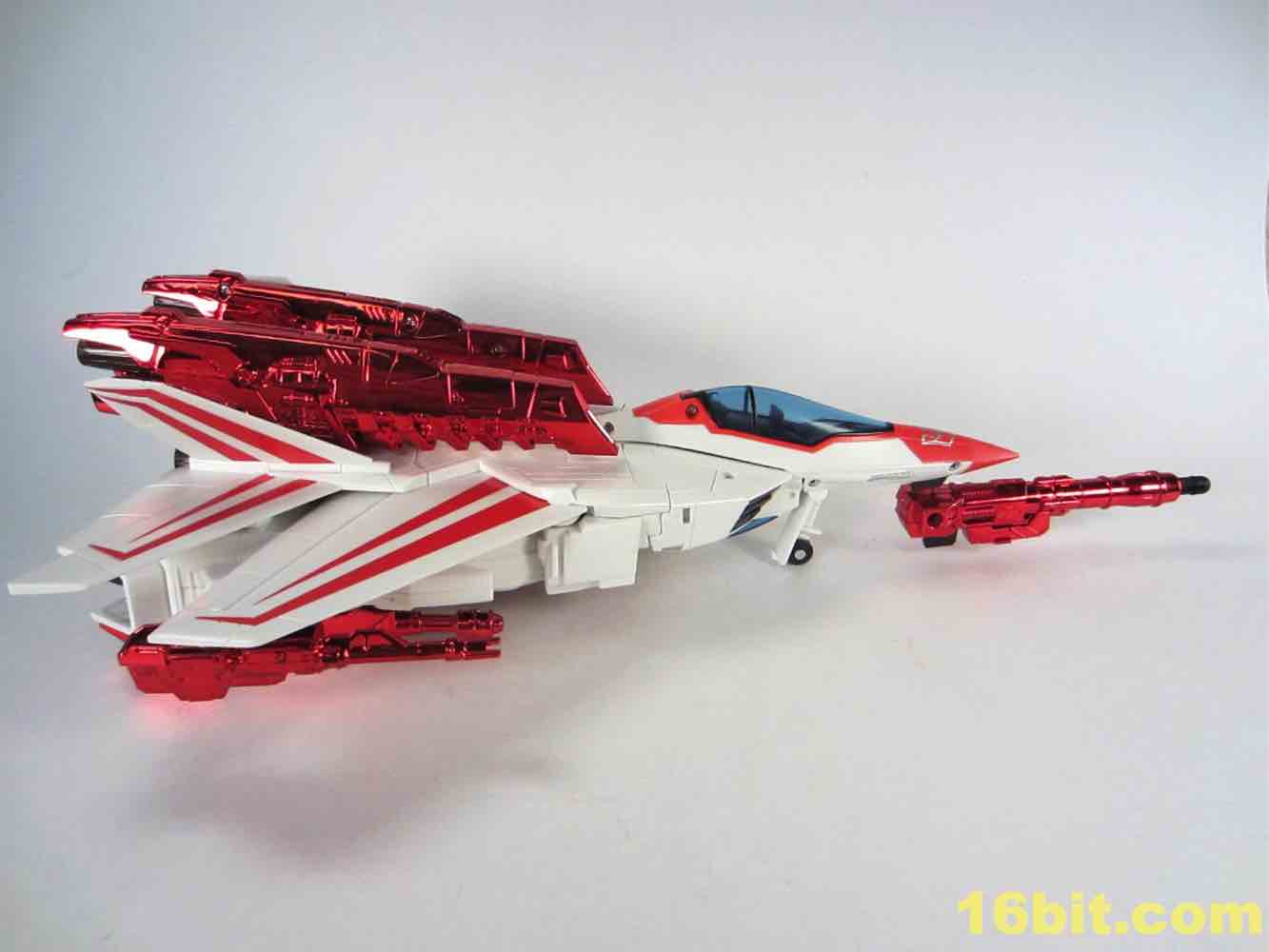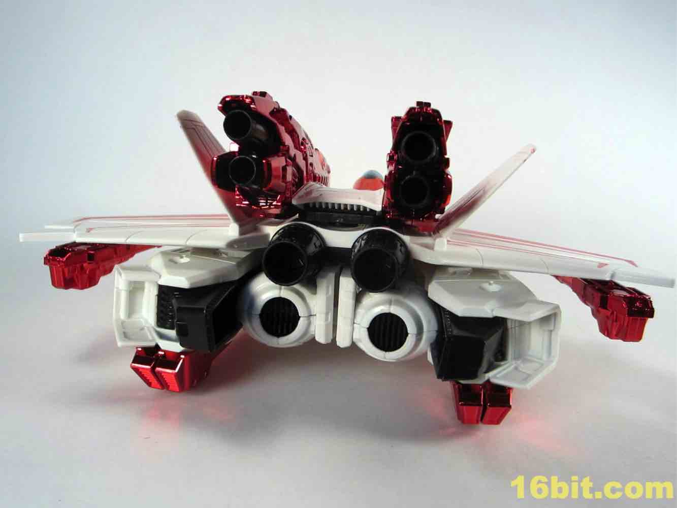 The not-Veritech mode is quite nice. You get stable landing gear with rolling wheels that actually roll quite well - even the cars can't always boast that! The guns mount in a number of places, and you can leave all of them save for the Photon Blaster in place from robot mode if you like. The blaster mounts under the nose cone easily. Like other versions of the toy, the wings can move a little bit. Unlike other ones, it's a little bland - mostly white, with a little red and a lone Autobrand on the nosecone. It's in a silver-backed paint so it looks gorgeous, but it's hard to look at this toy and not say "I could use some Reprolabels."
