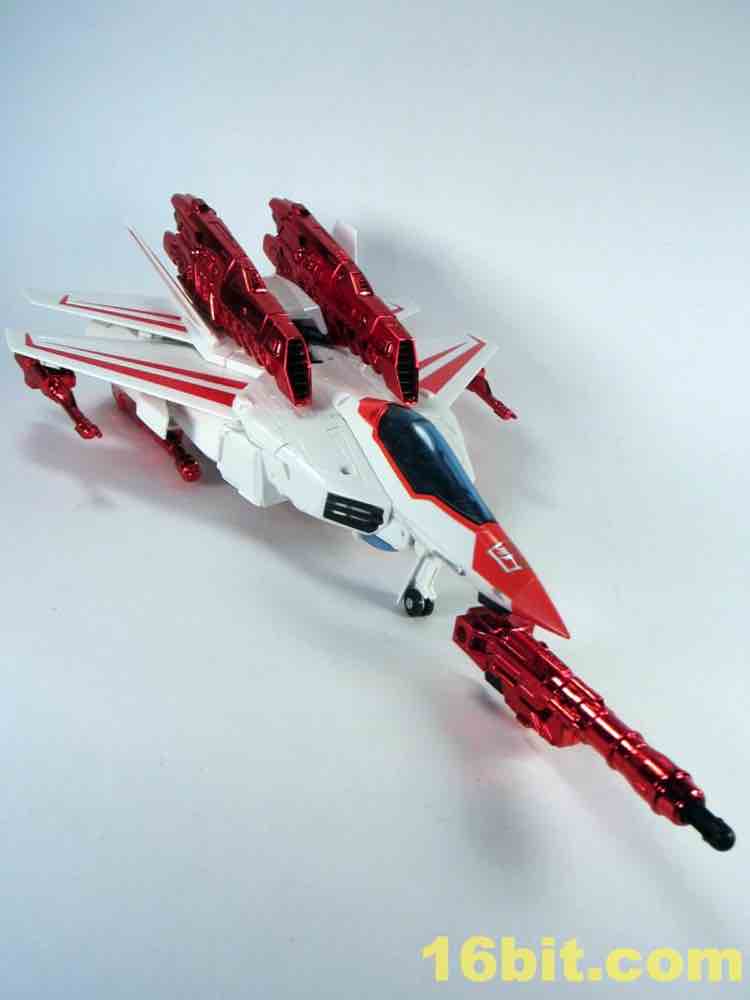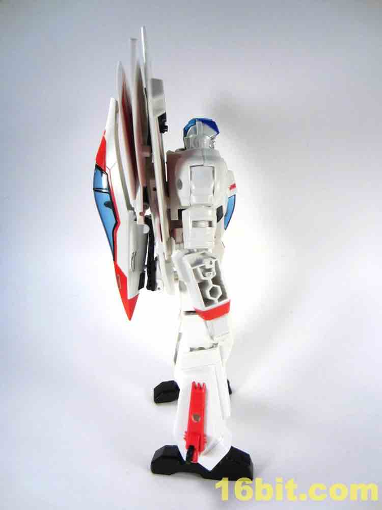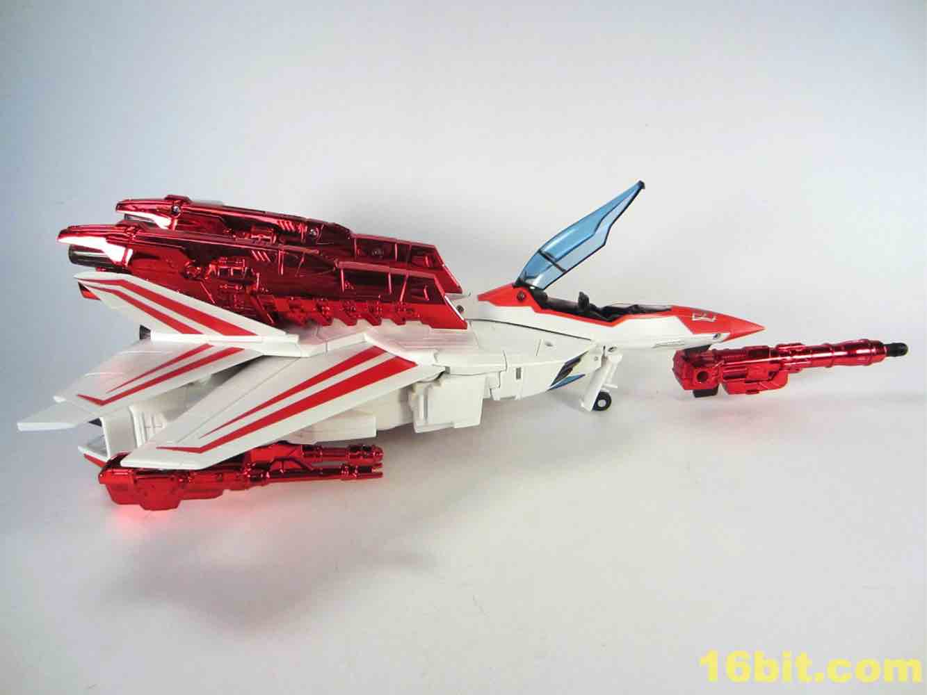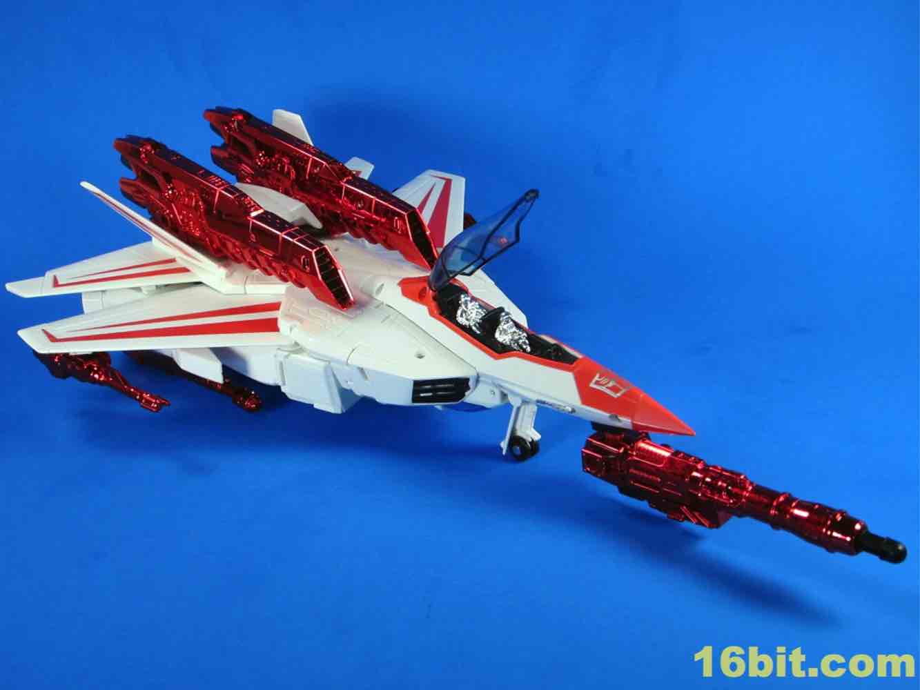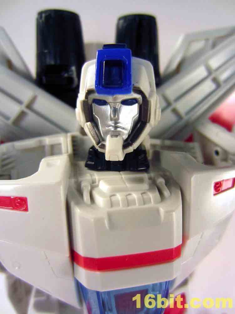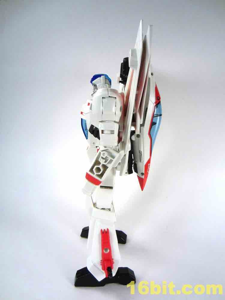 The not-Veritech mode is quite nice. You get stable landing gear with rolling wheels that actually roll quite well - even the cars can't always boast that! The guns mount in a number of places, and you can leave all of them save for the Photon Blaster in place from robot mode if you like. The blaster mounts under the nose cone easily. Like other versions of the toy, the wings can move a little bit. Unlike other ones, it's a little bland - mostly white, with a little red and a lone Autobrand on the nosecone. It's in a silver-backed paint so it looks gorgeous, but it's hard to look at this toy and not say "I could use some Reprolabels."